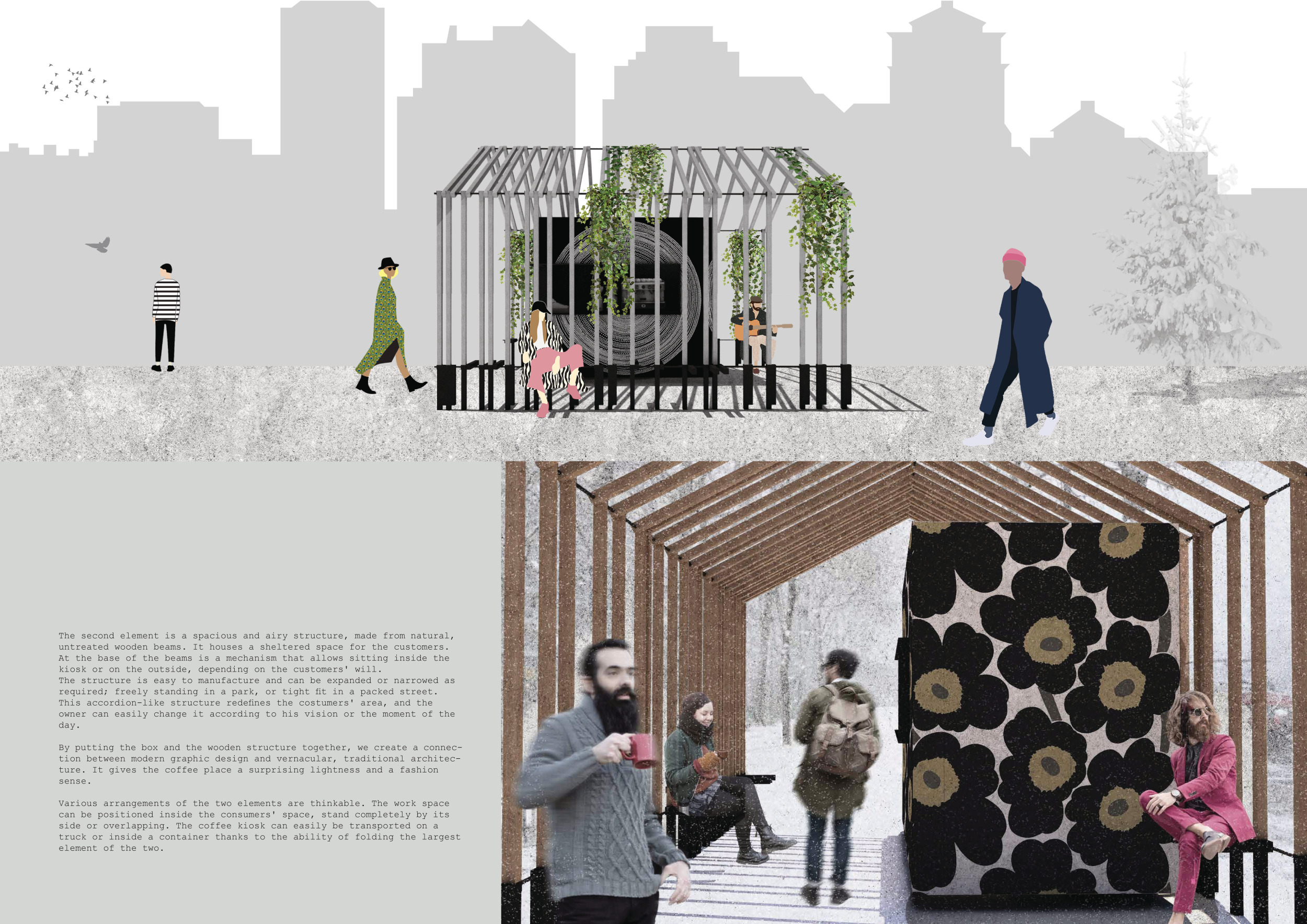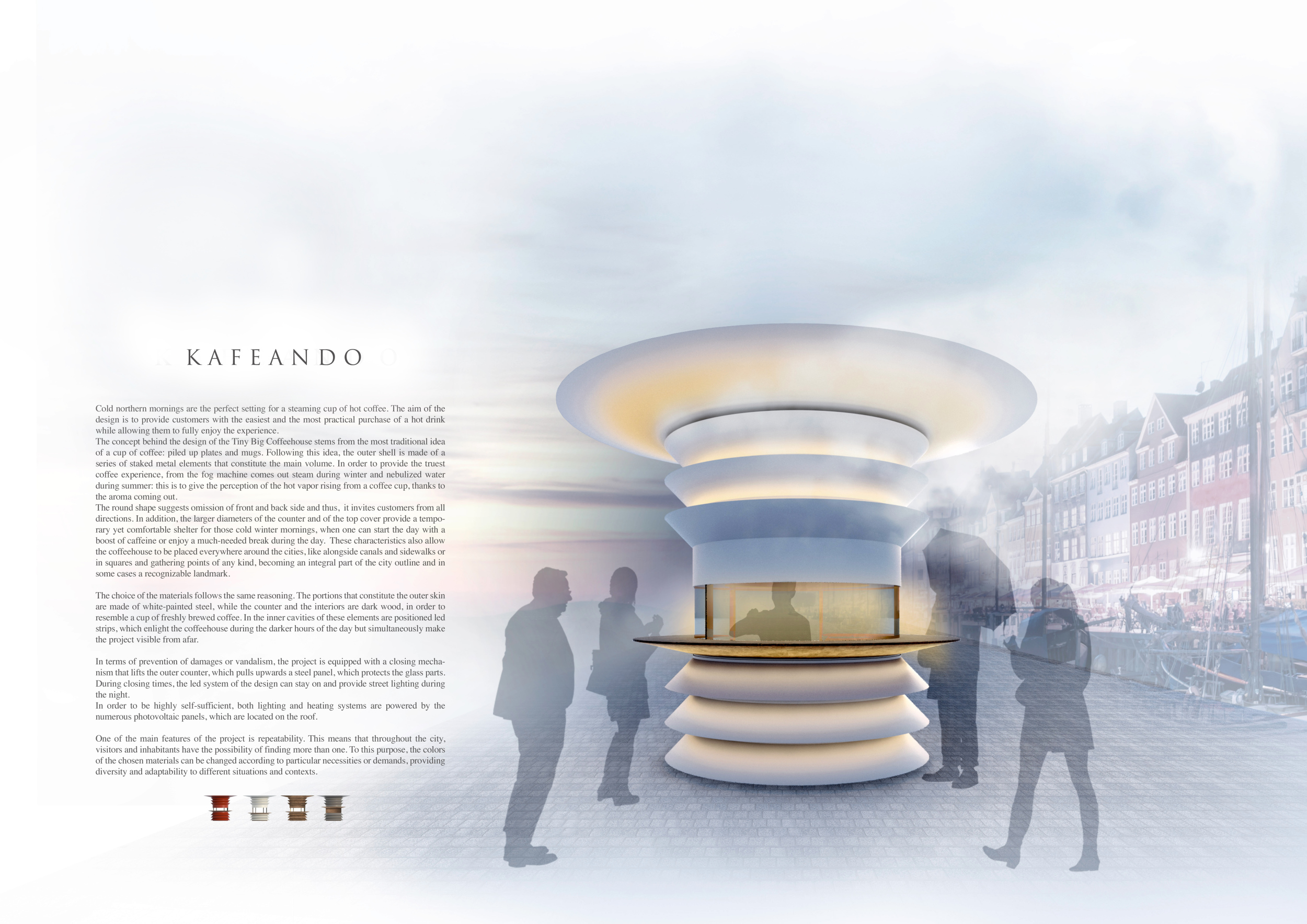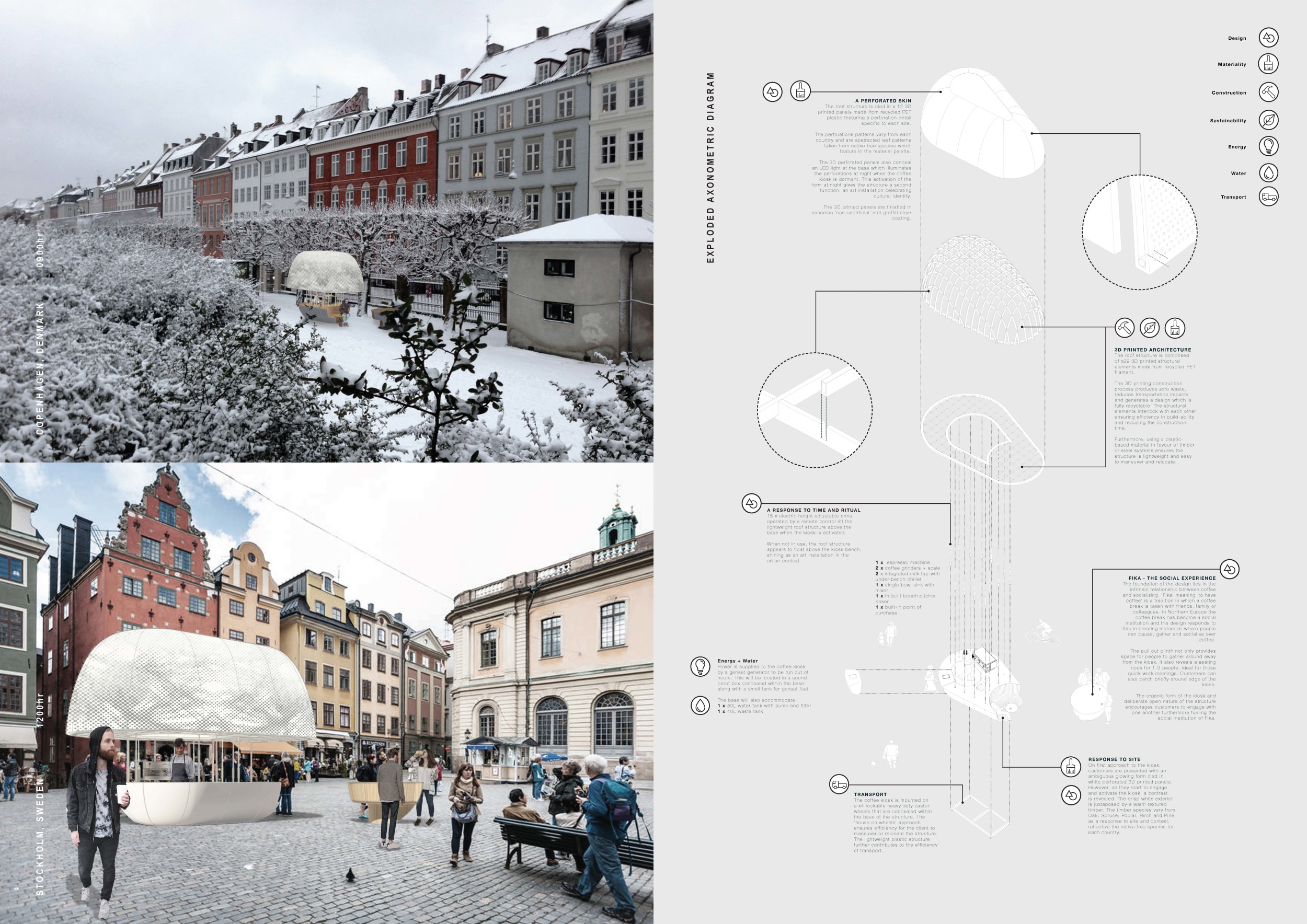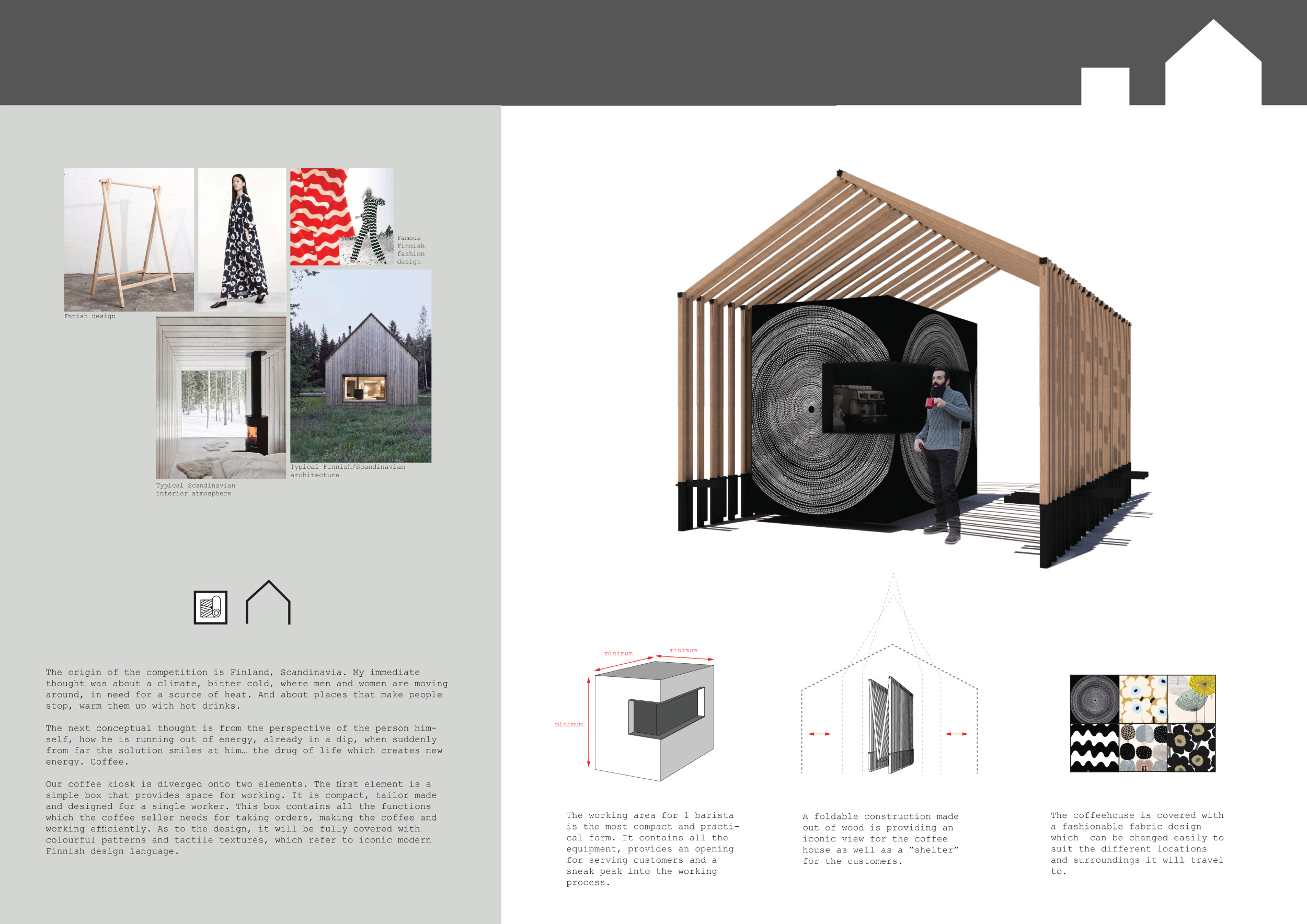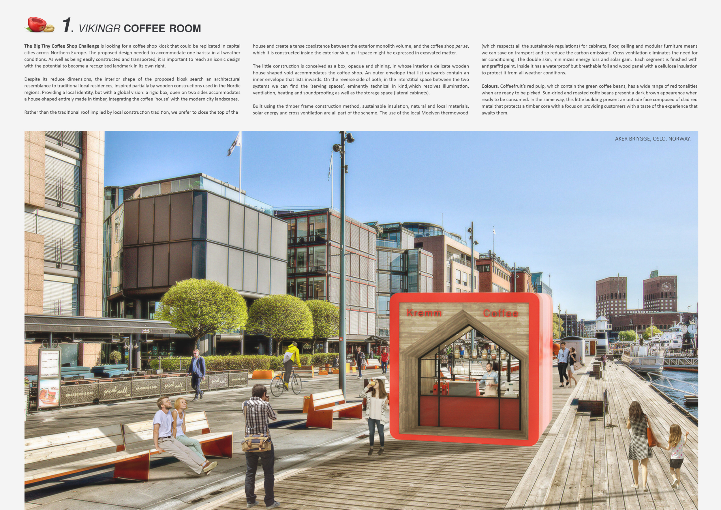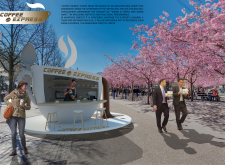 Participants of this competition were tasked with expanding the premise of the modern coffee shop, creating a design that could be easily replicated in miniscule locations across northern Europe. They were asked to look past the traditional lounge motif that permeates today’s coffee shop culture, and create a new iconic look for the caffeine dispensary.