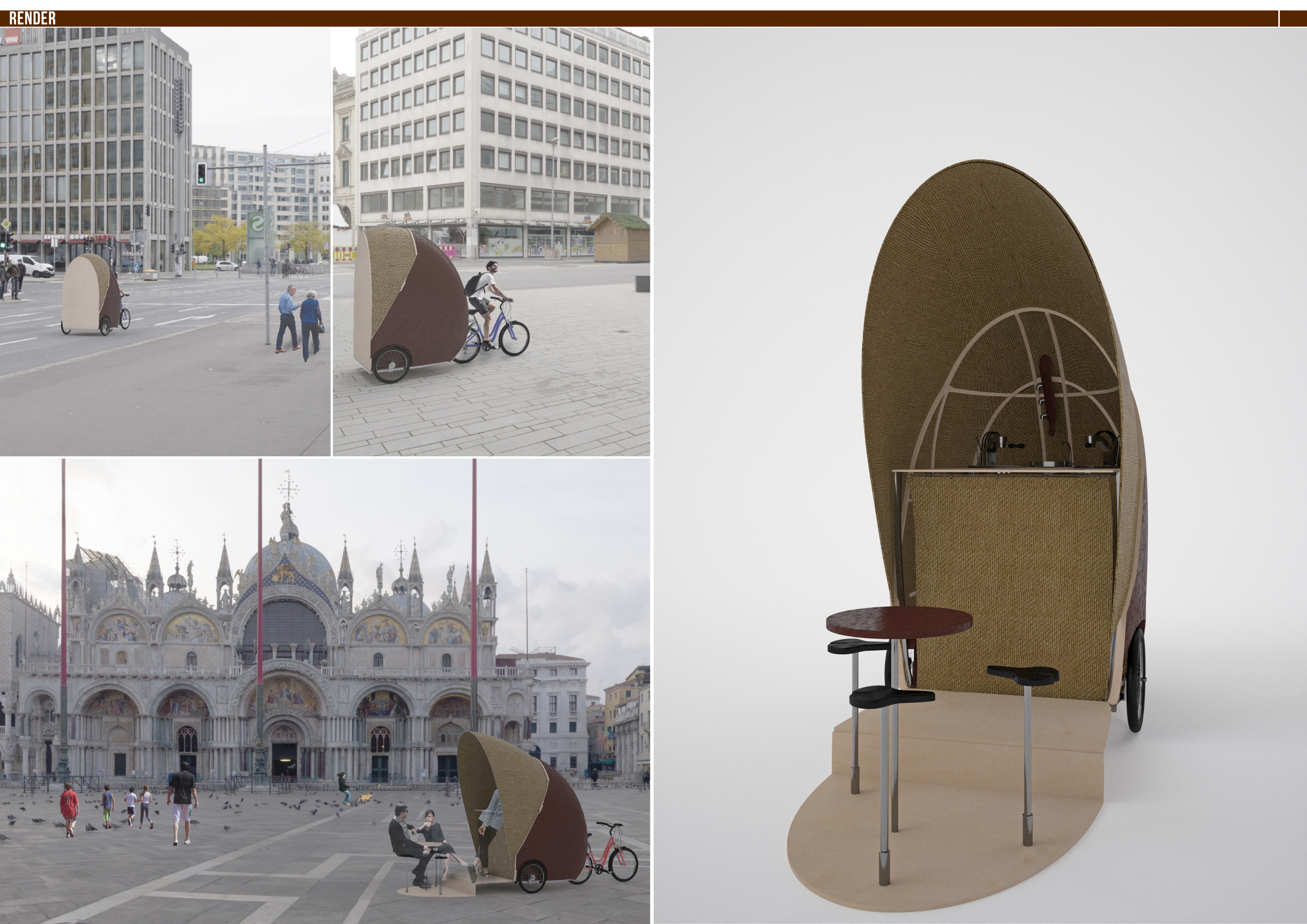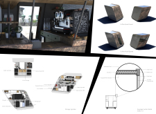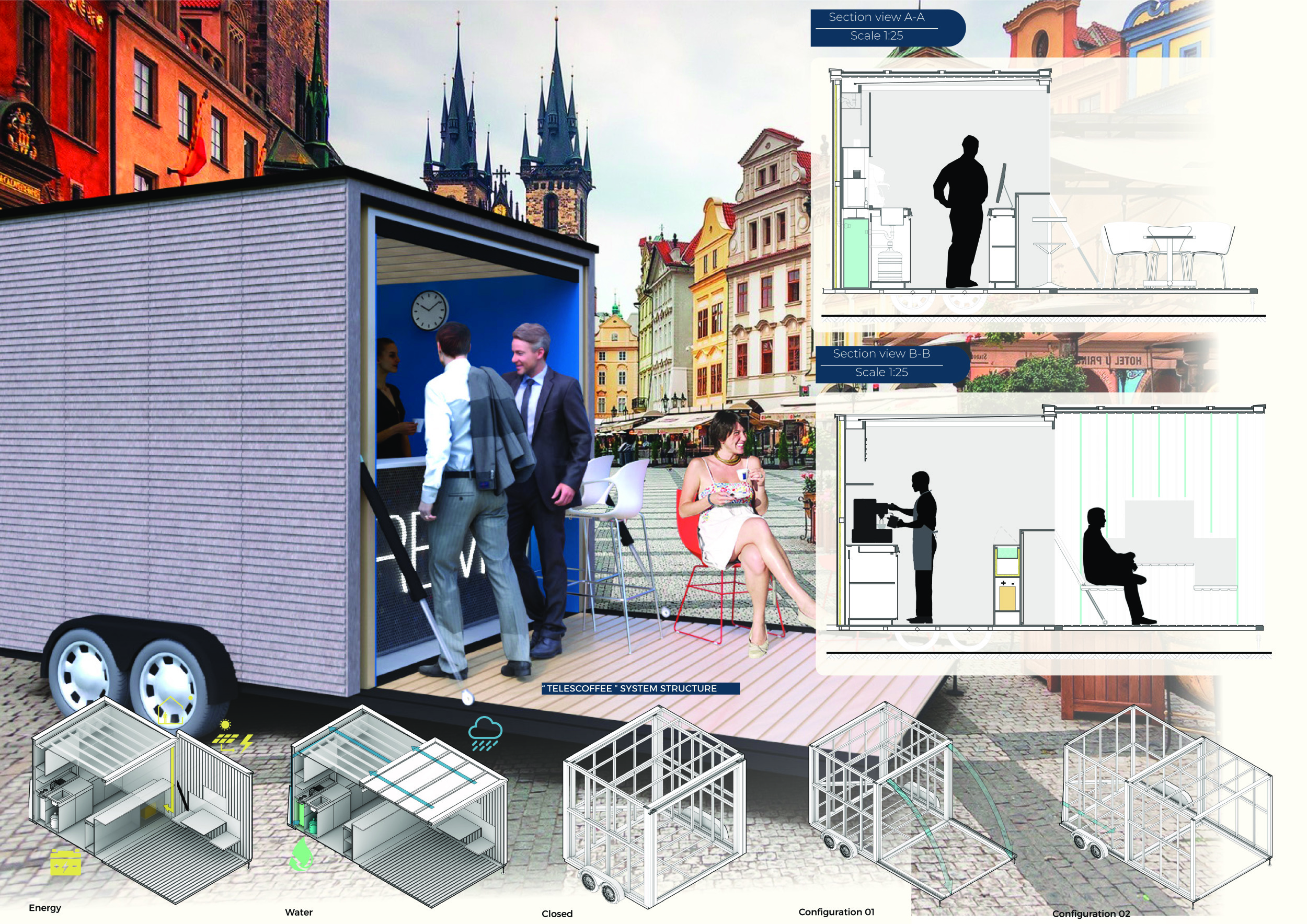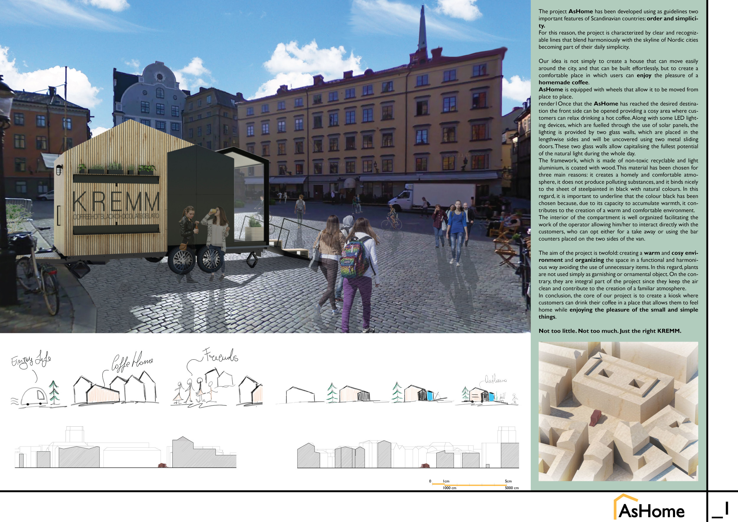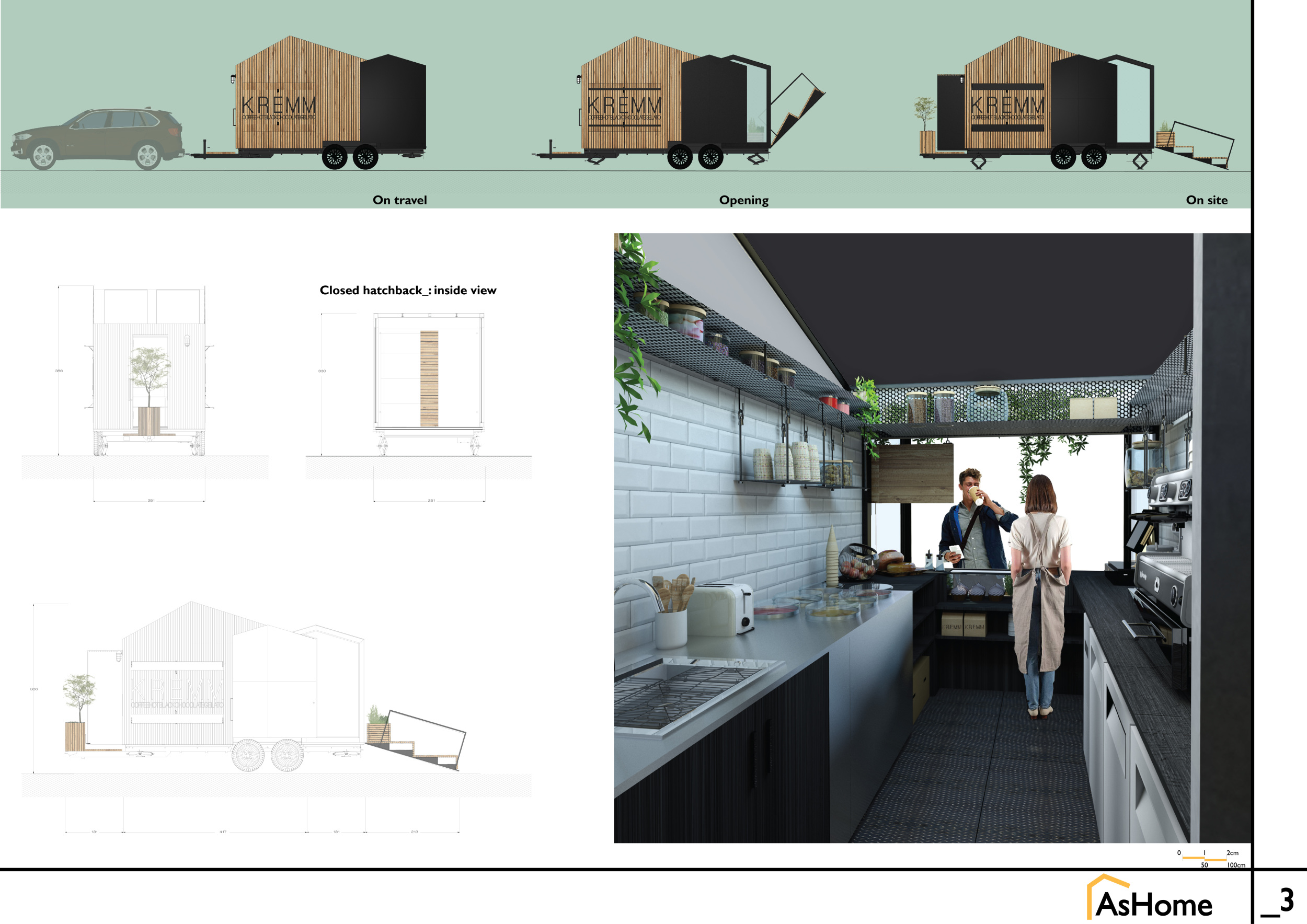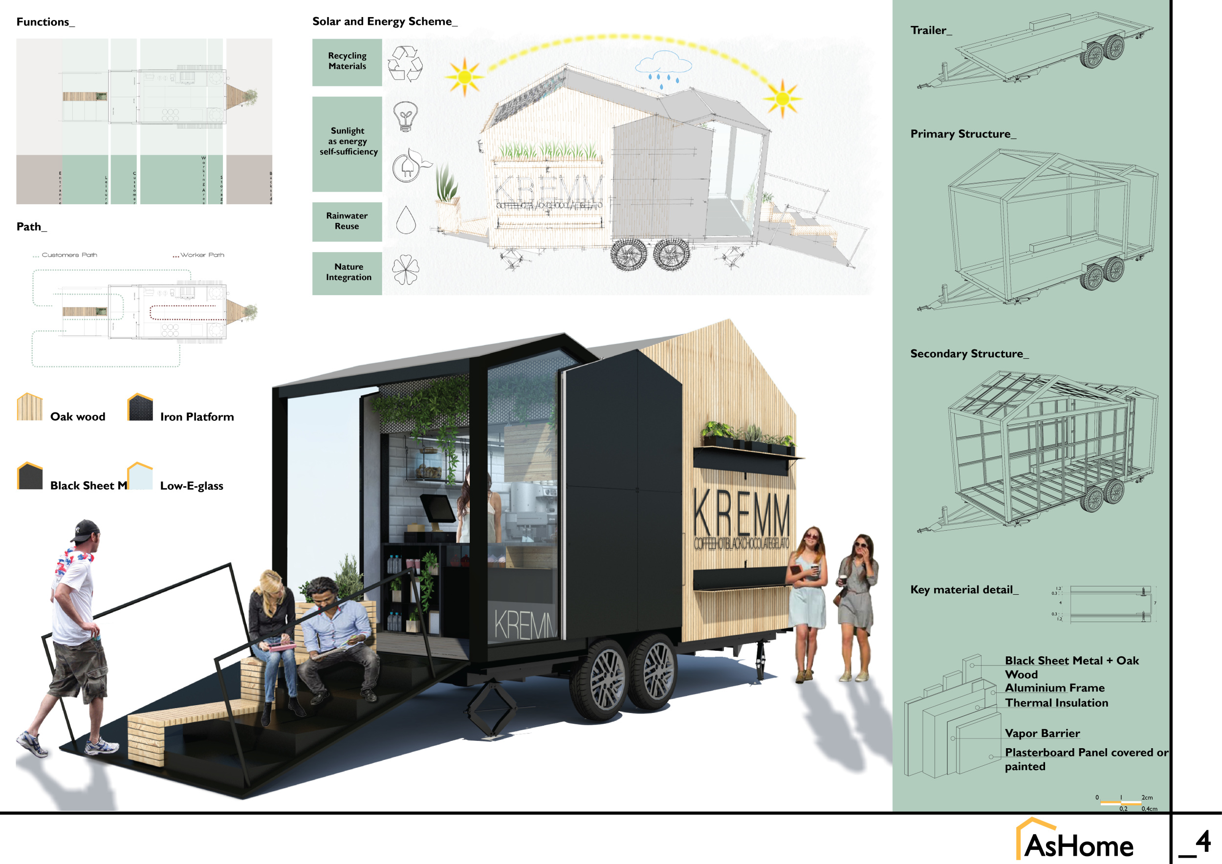 The pragmatic “AsHome” project follows two guidelines that are indicative of Scandinavian countries: order and simplicity. This portable coffee house’s framework is made of non-toxic recyclable aluminium coated with wood, creating a cosy area where customers can relax and enjoy a hot cup of coffee. It features solar-powered LED lighting as well as two large glass walls, placed lengthwise along the sides. Read more The project aims to allow customers to enjoy homemade coffee in whichever location it is placed, creating a warm and cosy environment, while at the same time organizing the space in a functional and harmonious way.