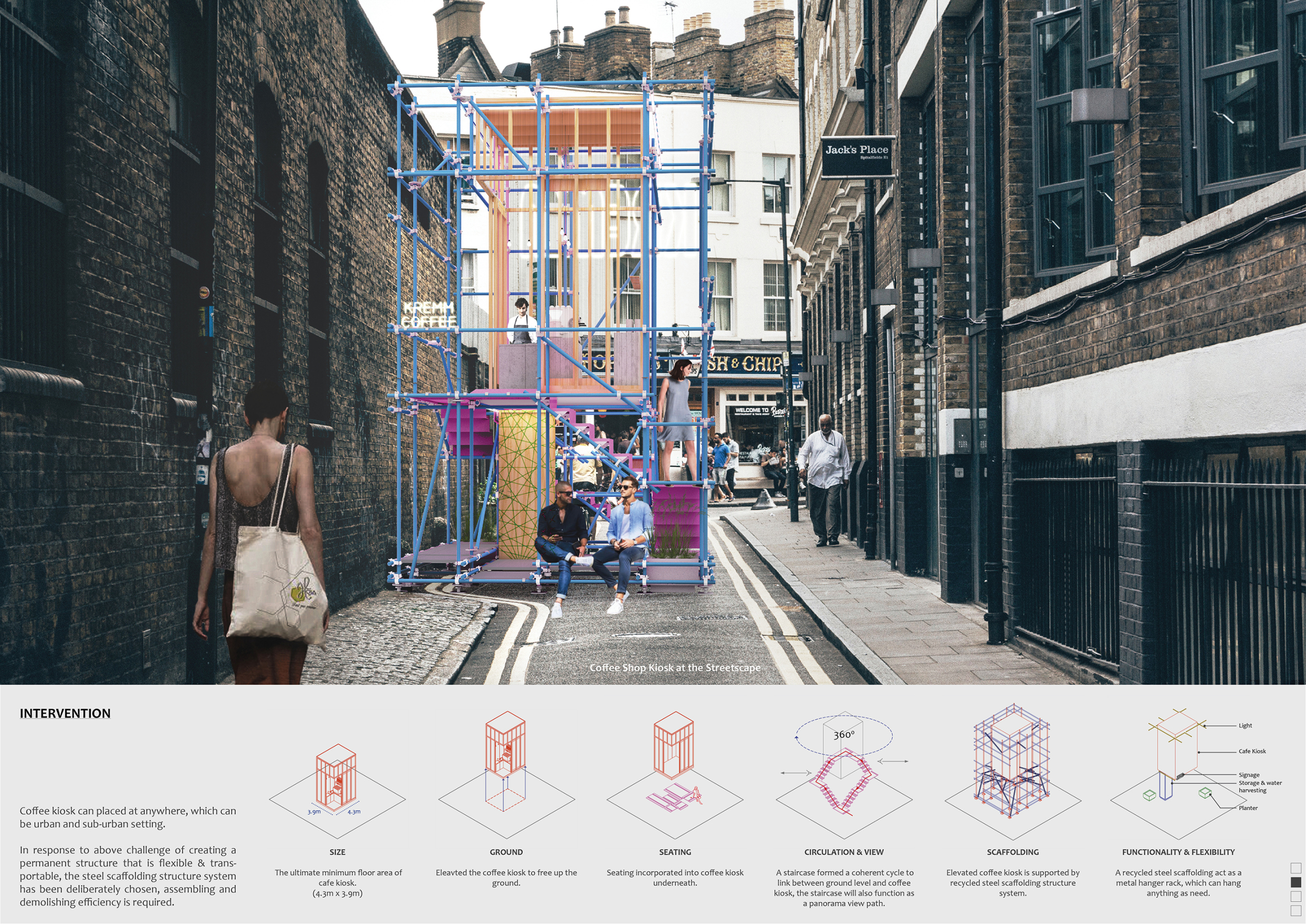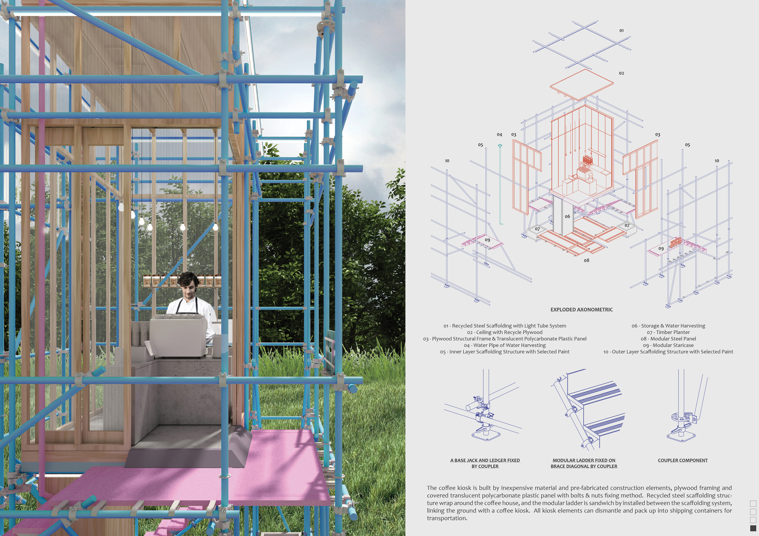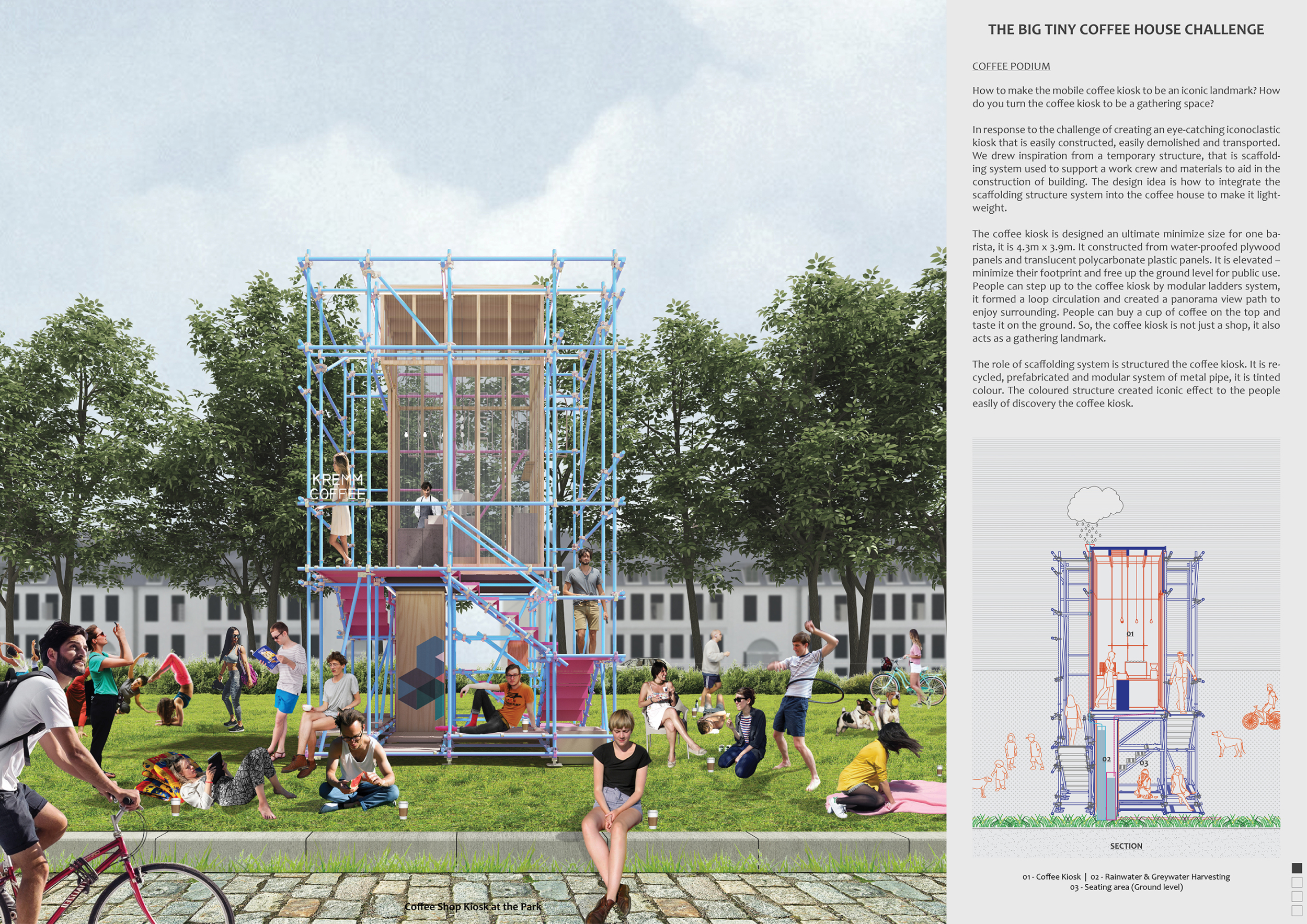 The “Coffee Podium” flipped the concept of a coffee house on its head, creating a temporary structure that revels in its pop-up nature. The bulk of the podium is made of a scaffolding system which is integrated into the coffee house to make it lightweight, easy to construct, and easy to dismantle. A single barista can work from the 4.3m x 3.9m kiosk which is elevated above the ground amidst waterproof plywood panels and translucent polycarbonate plastic panels. Read more Customers would navigate a modular ladder system that forms a loop circulation, creating a panoramic view path. The jury were impressed with this combination of iconic design and original thinking, all while imparting a minimal footprint that is easily constructed in any location.