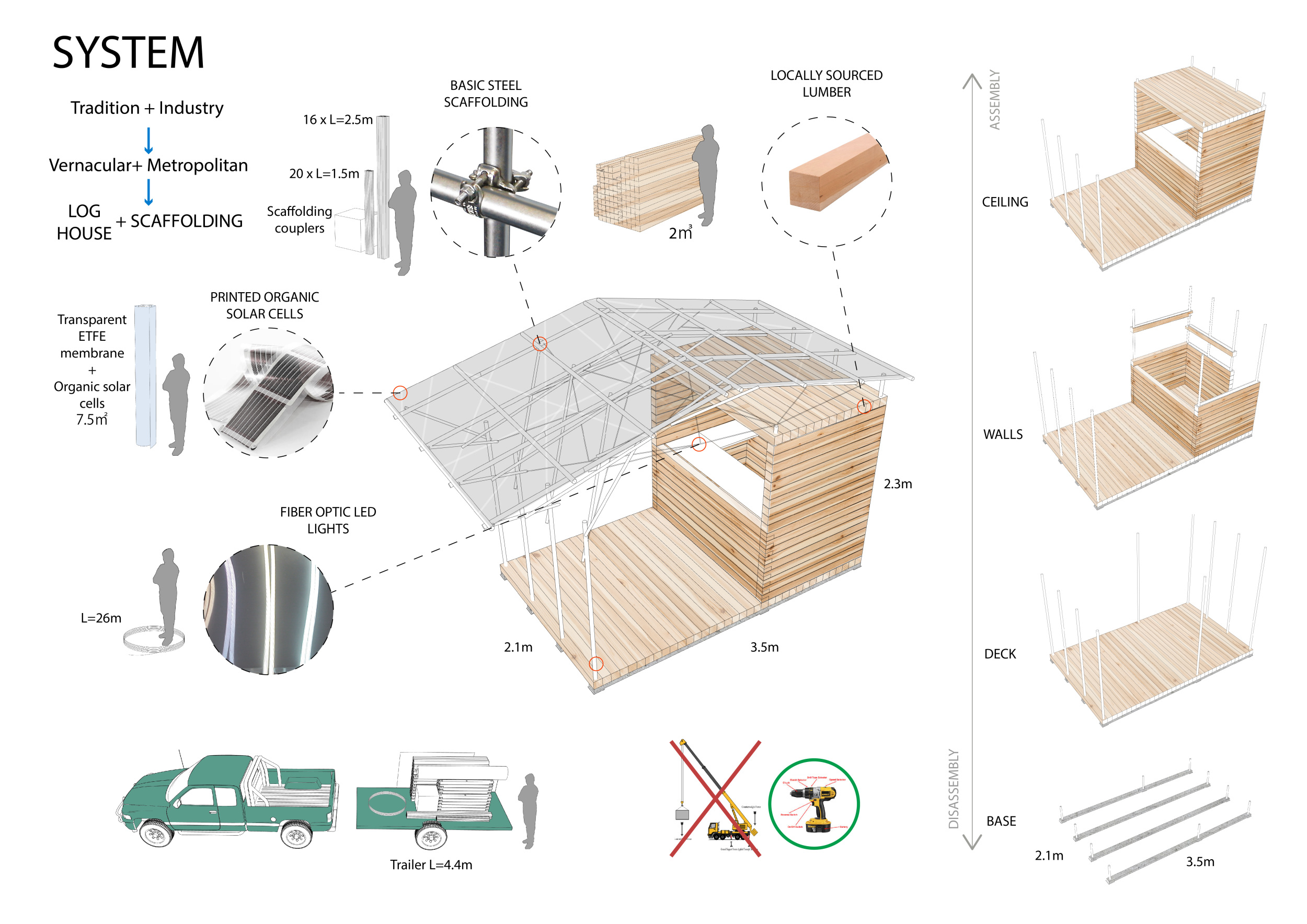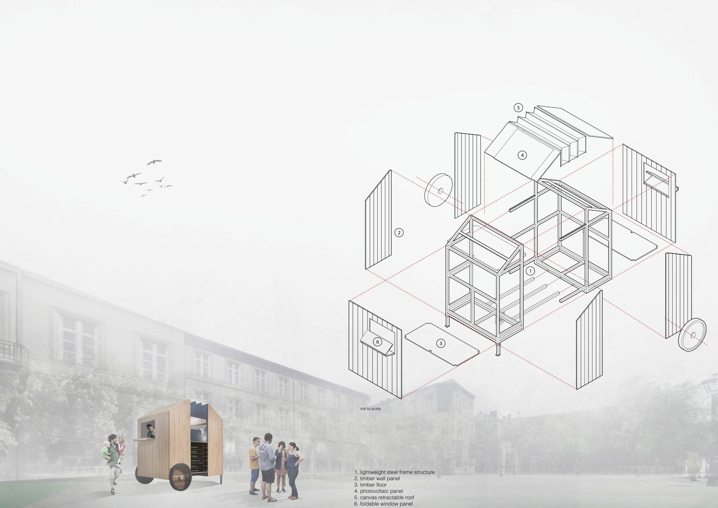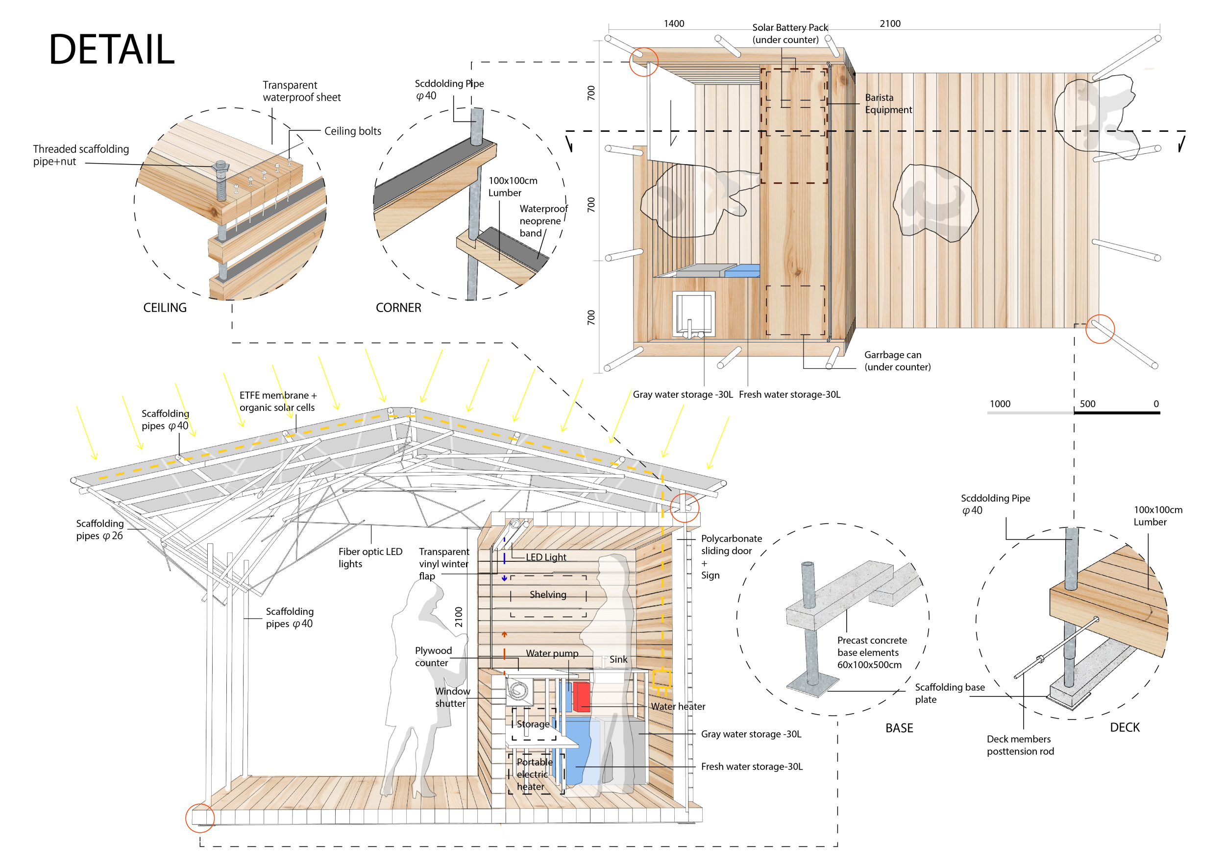 The “Coffee Podium” flipped the concept of a coffee house on its head, creating a temporary structure that revels in its pop-up nature. The bulk of the podium is made of a scaffolding system which is integrated into the coffee house to make it lightweight, easy to construct, and easy to dismantle. A single barista can work from the 4.3m x 3.9m kiosk which is elevated above the ground amidst waterproof plywood panels and translucent polycarbonate plastic panels. Read more Customers would navigate a modular ladder system that forms a loop circulation, creating a panoramic view path. The jury were impressed with this combination of iconic design and original thinking, all while imparting a minimal footprint that is easily constructed in any location.