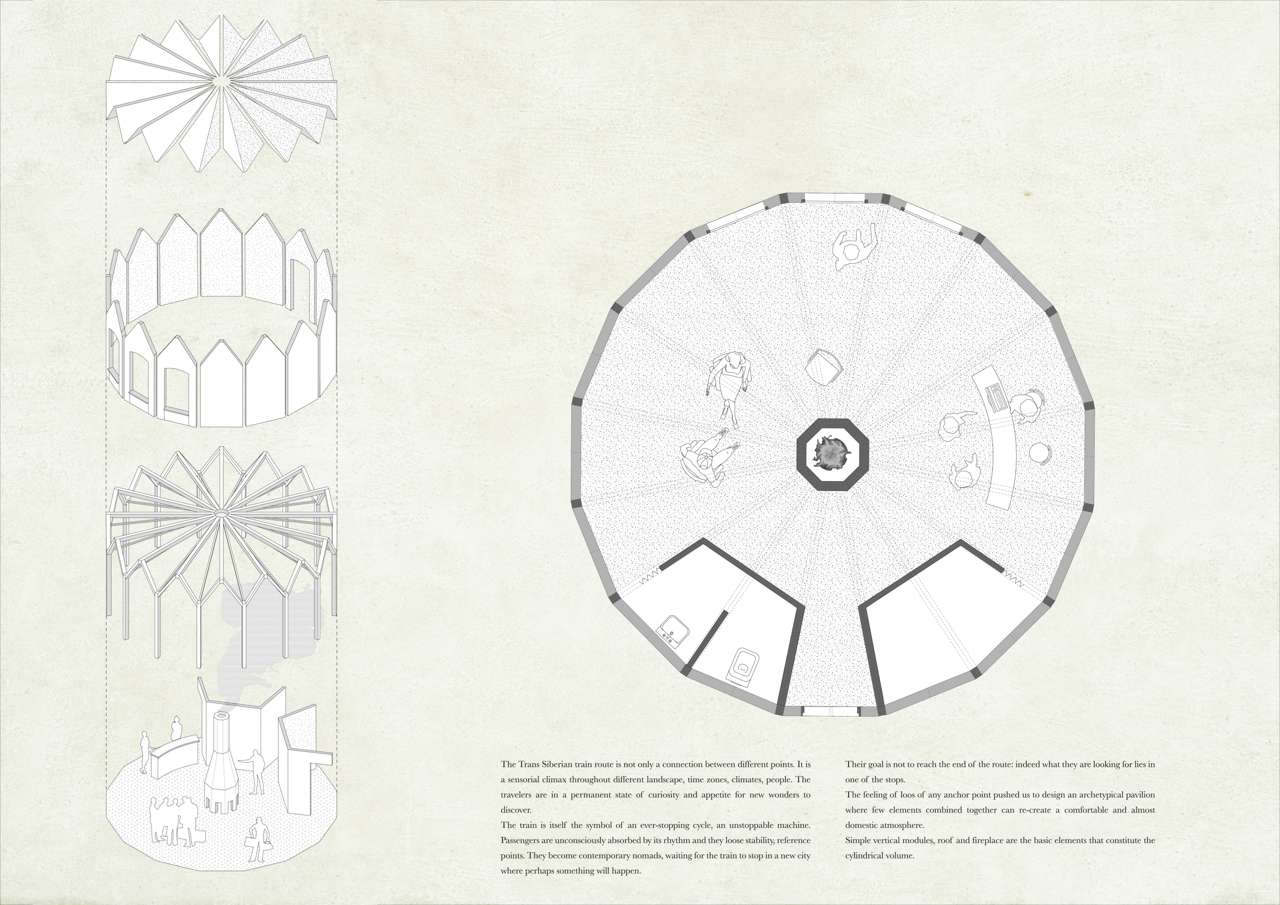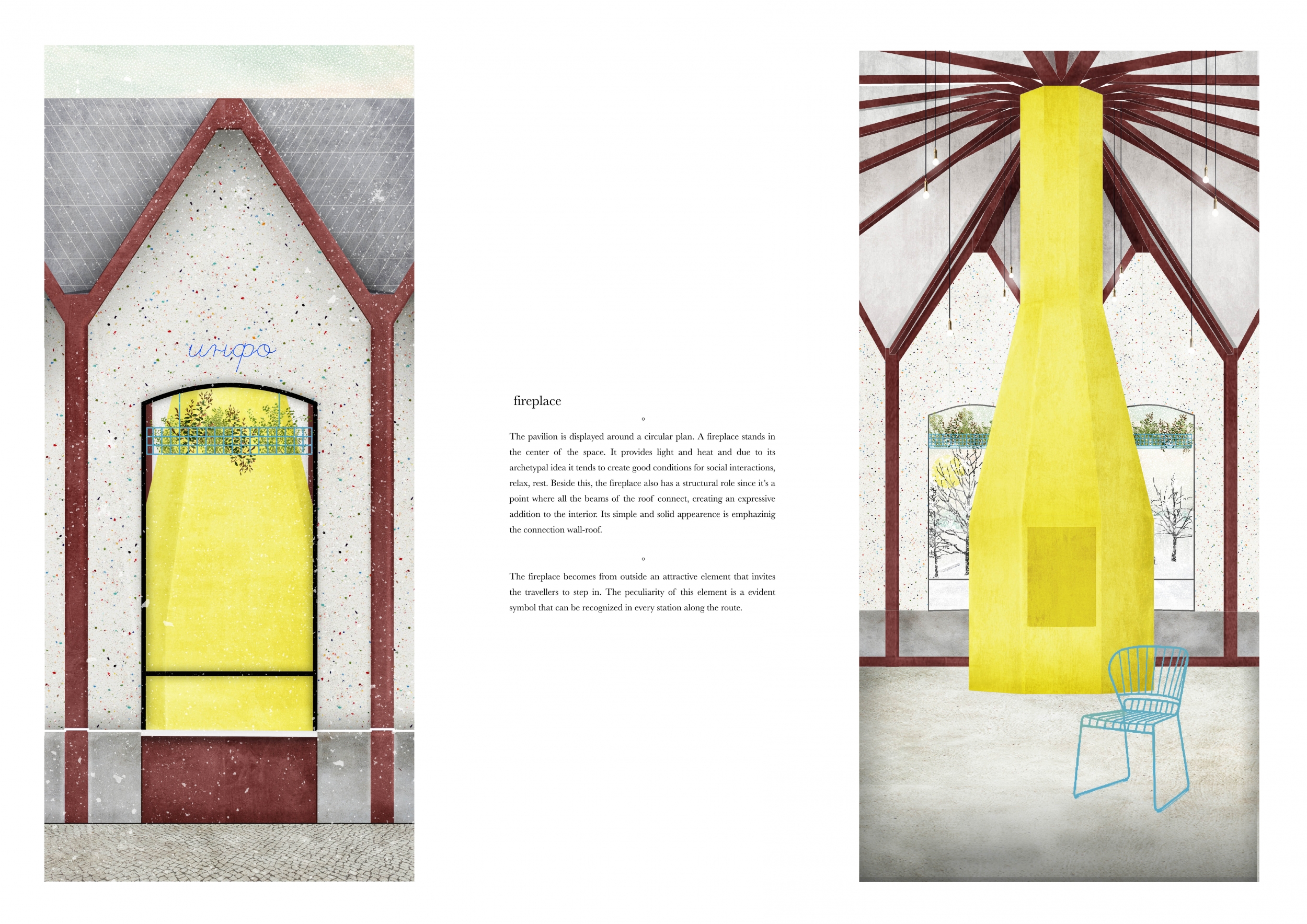 The second place winners created a design with the serious potential of becoming a landmark, with its clear and coherent portrayal of woodfire hut. A single, circular pavilion, the project centred around a fireplace which provides light and heat to travellers. A fireplace is an archetype of social interactions, creating a comfortable space to rest, relax and commune with other travellers.
