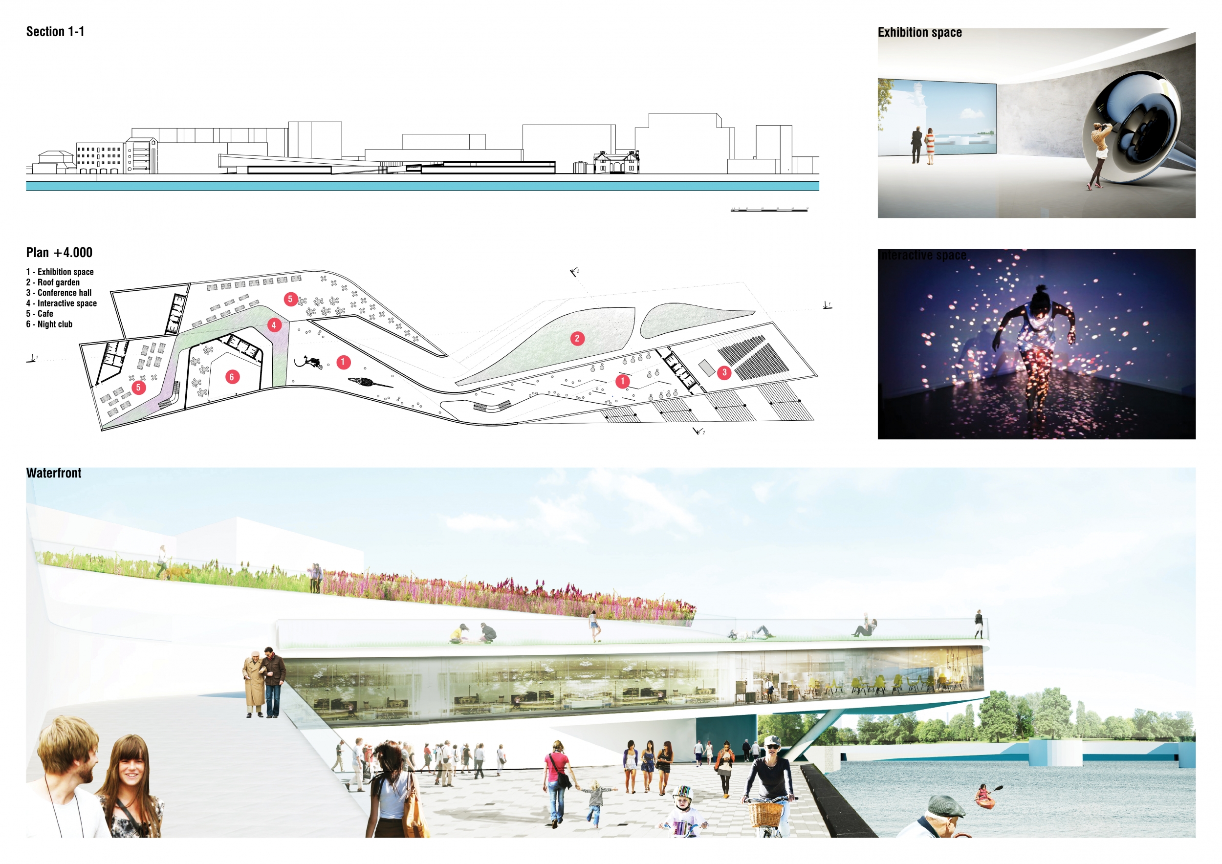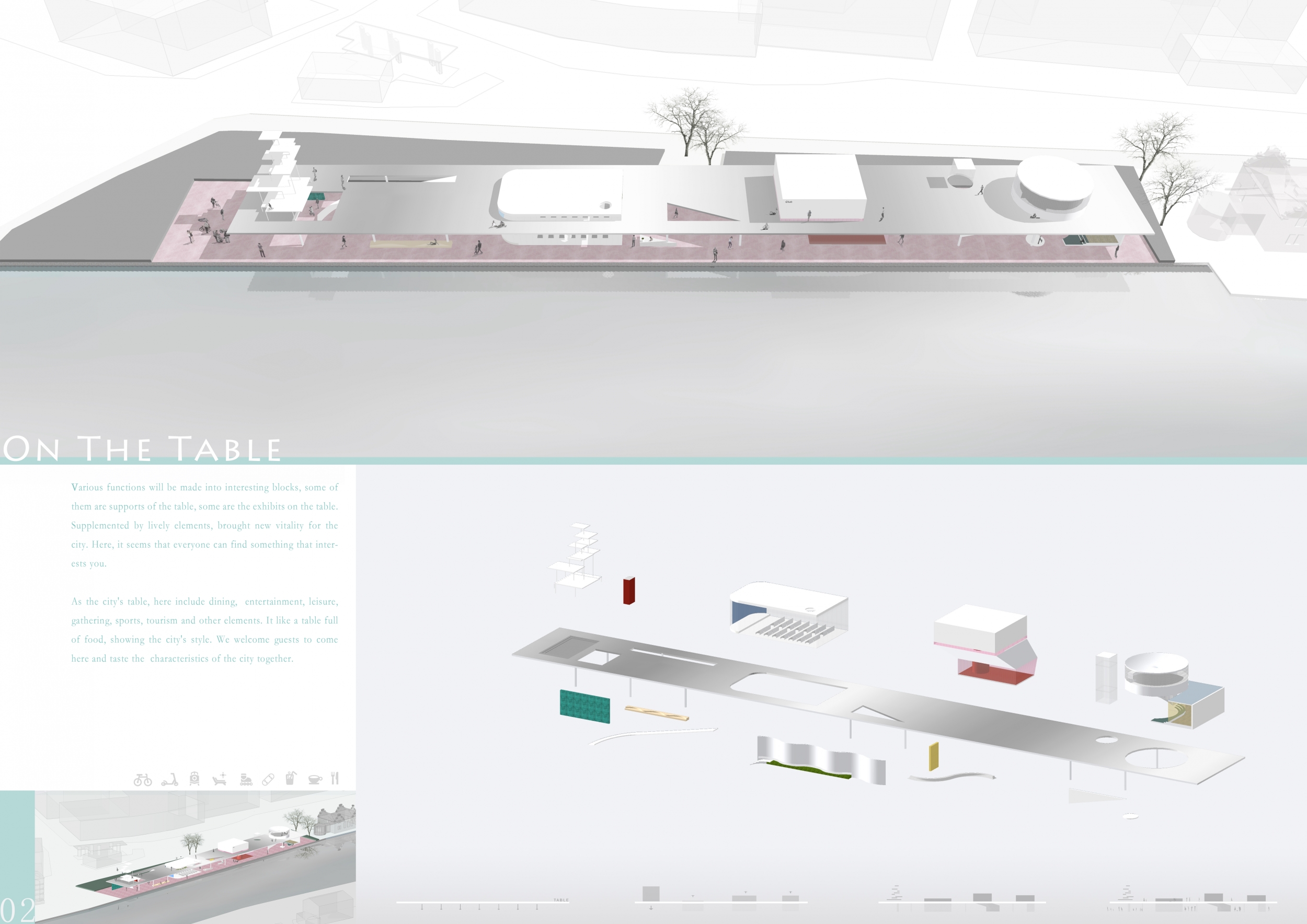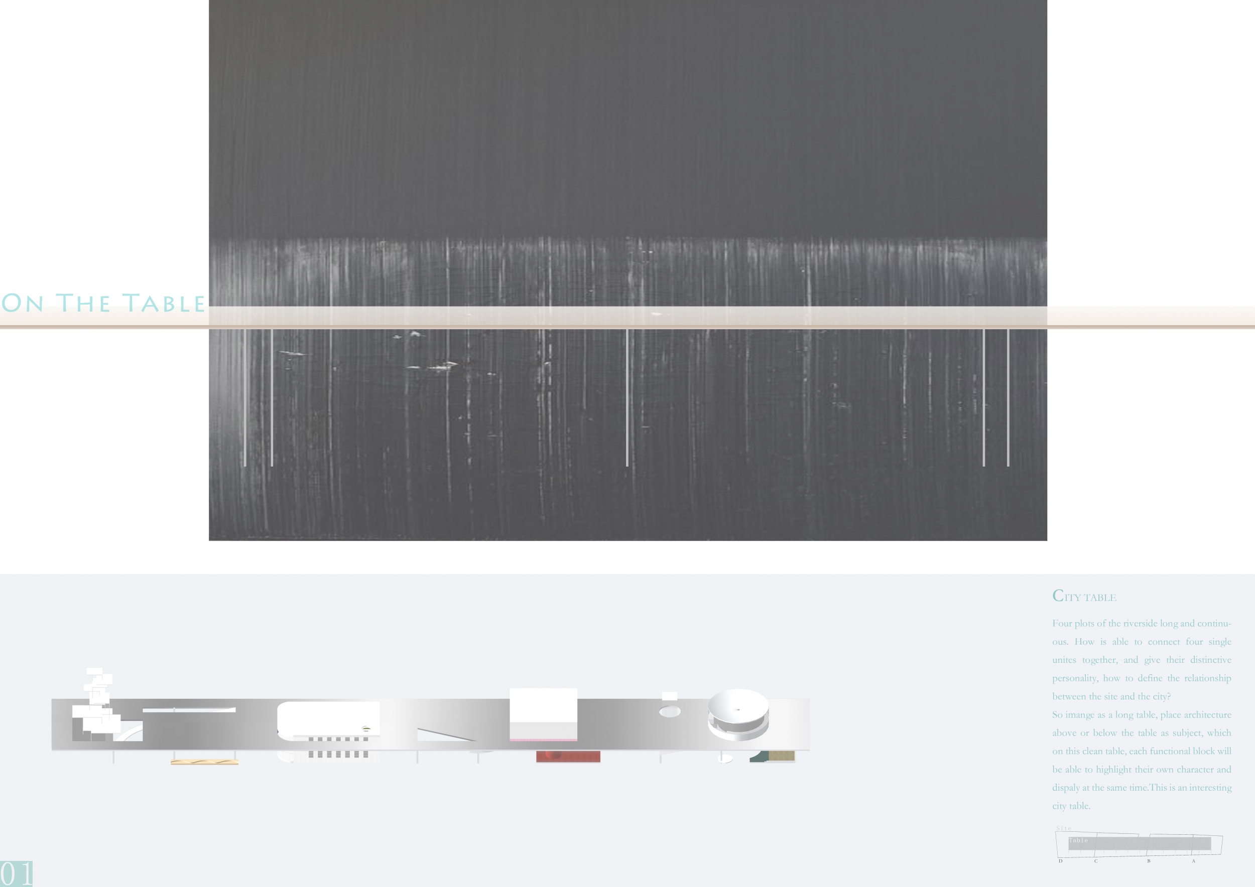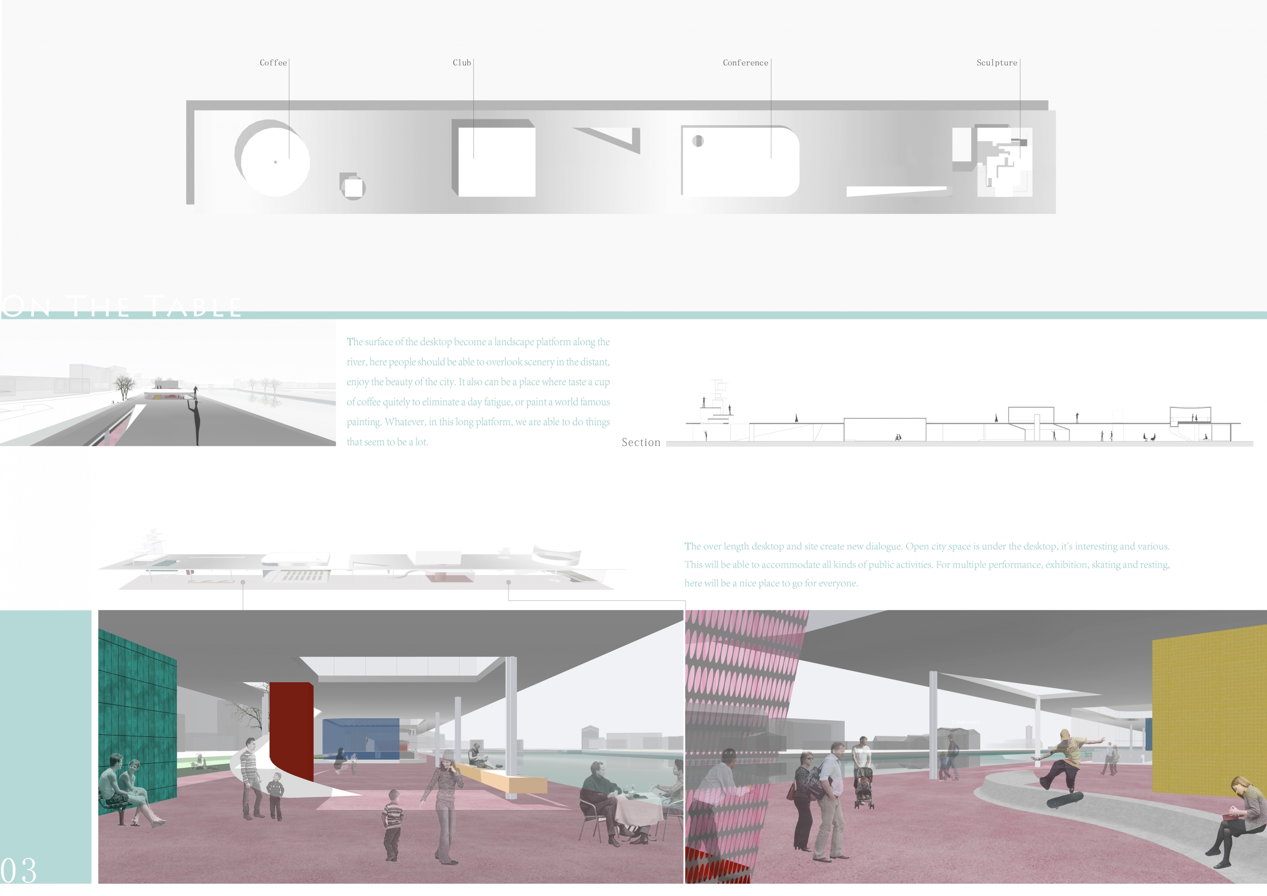 The winning entry is differentiated by clarity of organization and singularity of form. The proposal is characterized by a single datum responsible for structuring program, site, and public experience. Analogized to a table, this datum establishes relationships between regularly distributed, formal and informal functions — on top of, below, and around itself. Bounded by the street and waterfront, the table establishes a line against which the city and waterfront are measured.