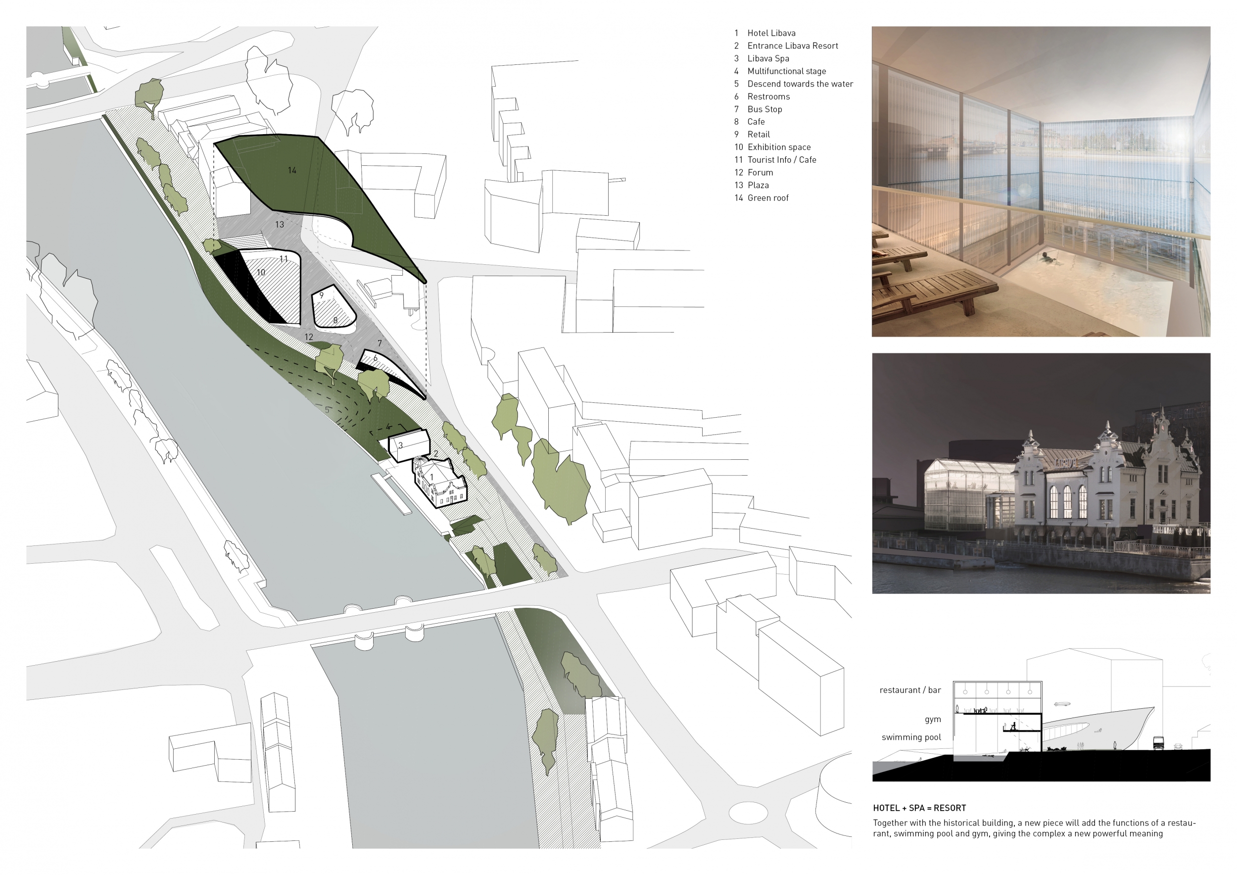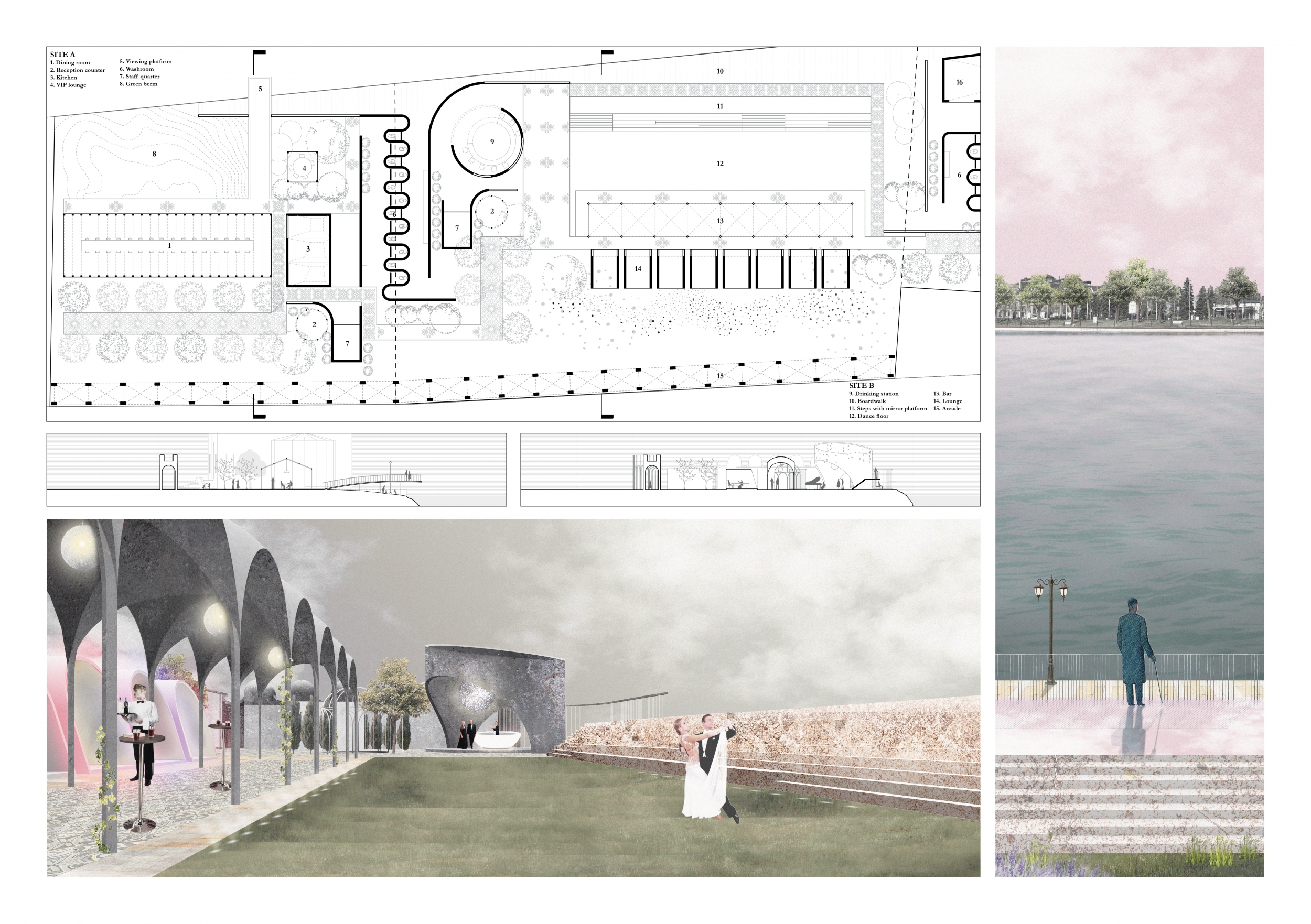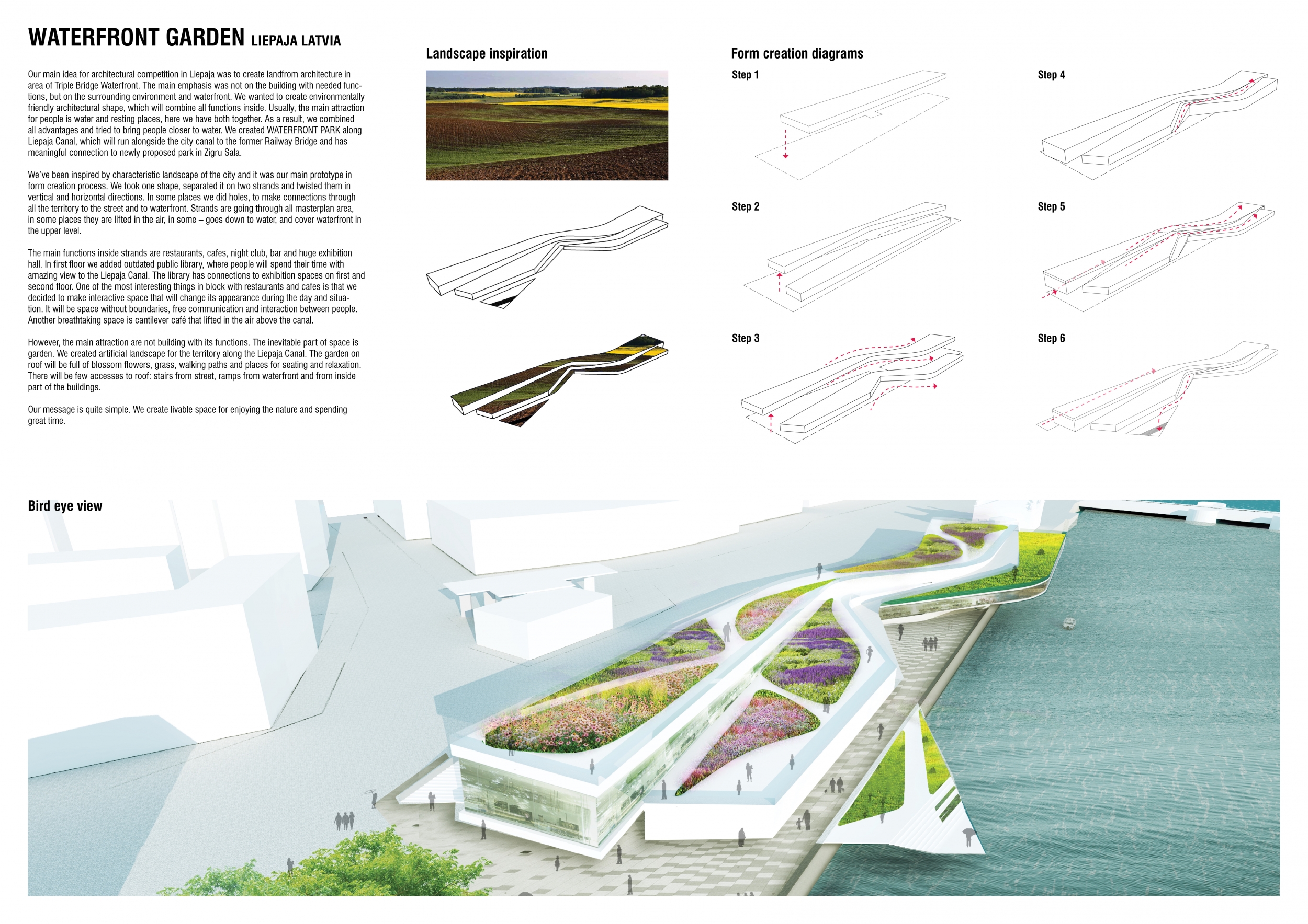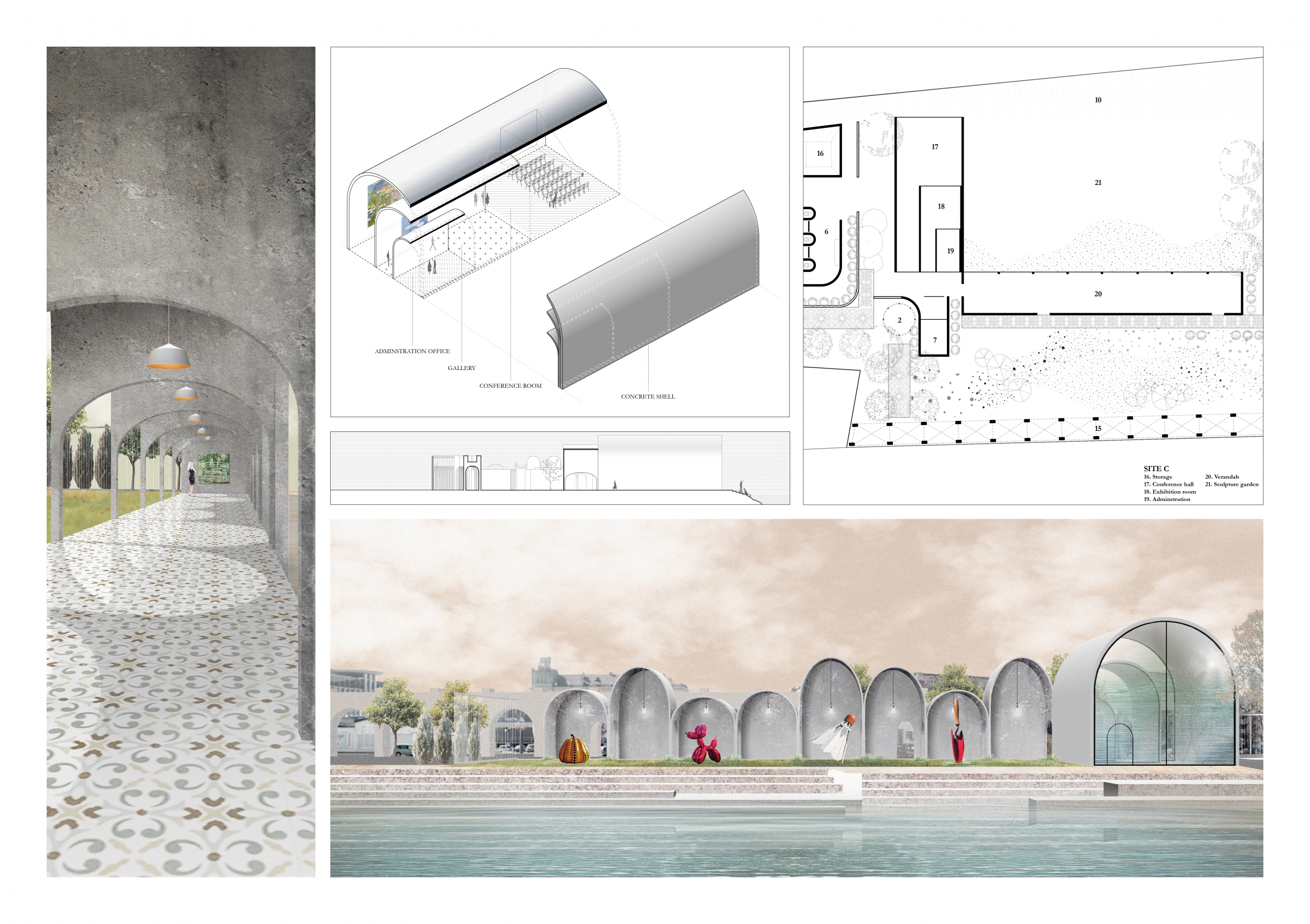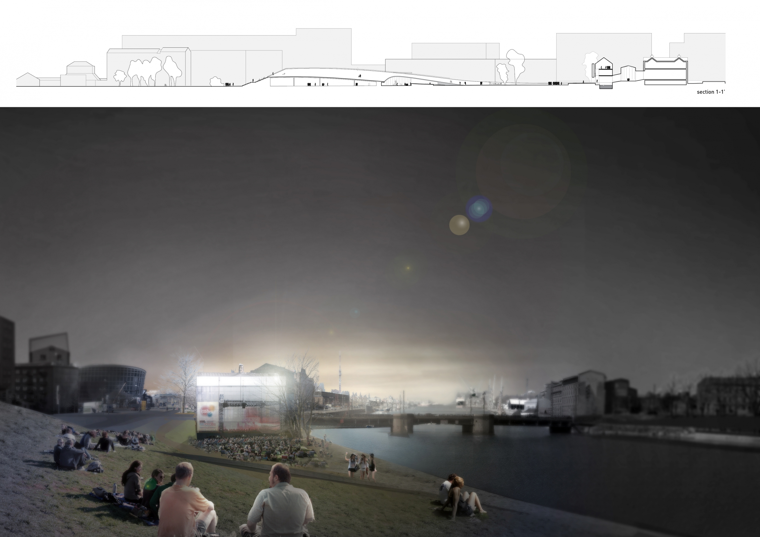 Selected entries were distinct in that the architecture proposed serves a larger agenda resonant with the fundamental challenge of the brief. These submission each conjure an imaginative, yet tangible future of urban culture fostered by creative strategies of public space making. The proposals were considered and distinguished by several characteristics. These included articulation of a singular strategy, an ability to unify a diverse program and expansive site, the potential for phased development over time, an autonomous yet contingent relation to the historic and contemporary fabric of Liepaja, accommodation for the public demands of the flanking canal and streetscape, and ability to attract locals, visitors, and tourists. Winning entries realized each of these criteria through discrete alternatives to the structure and form of traditional public space.