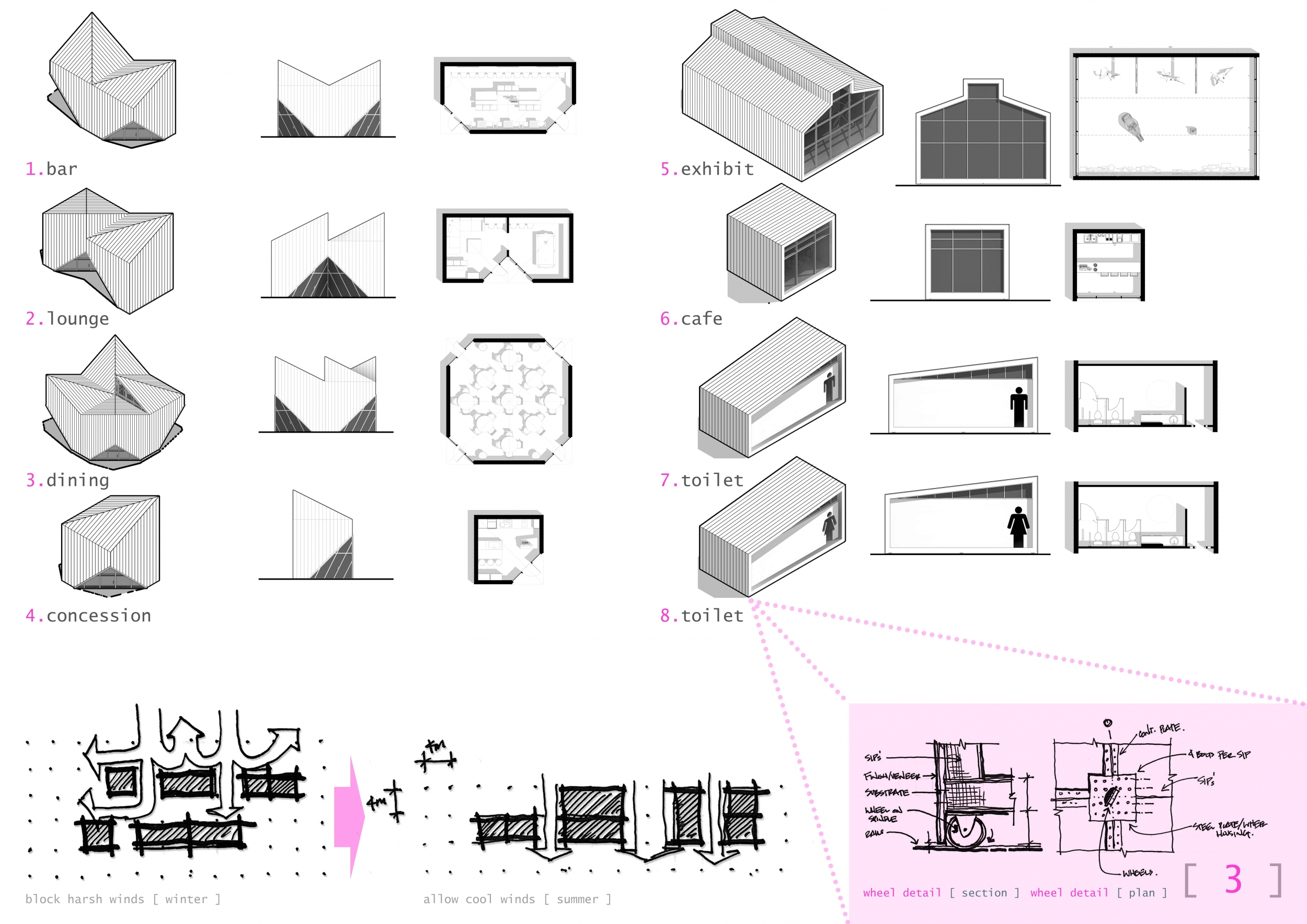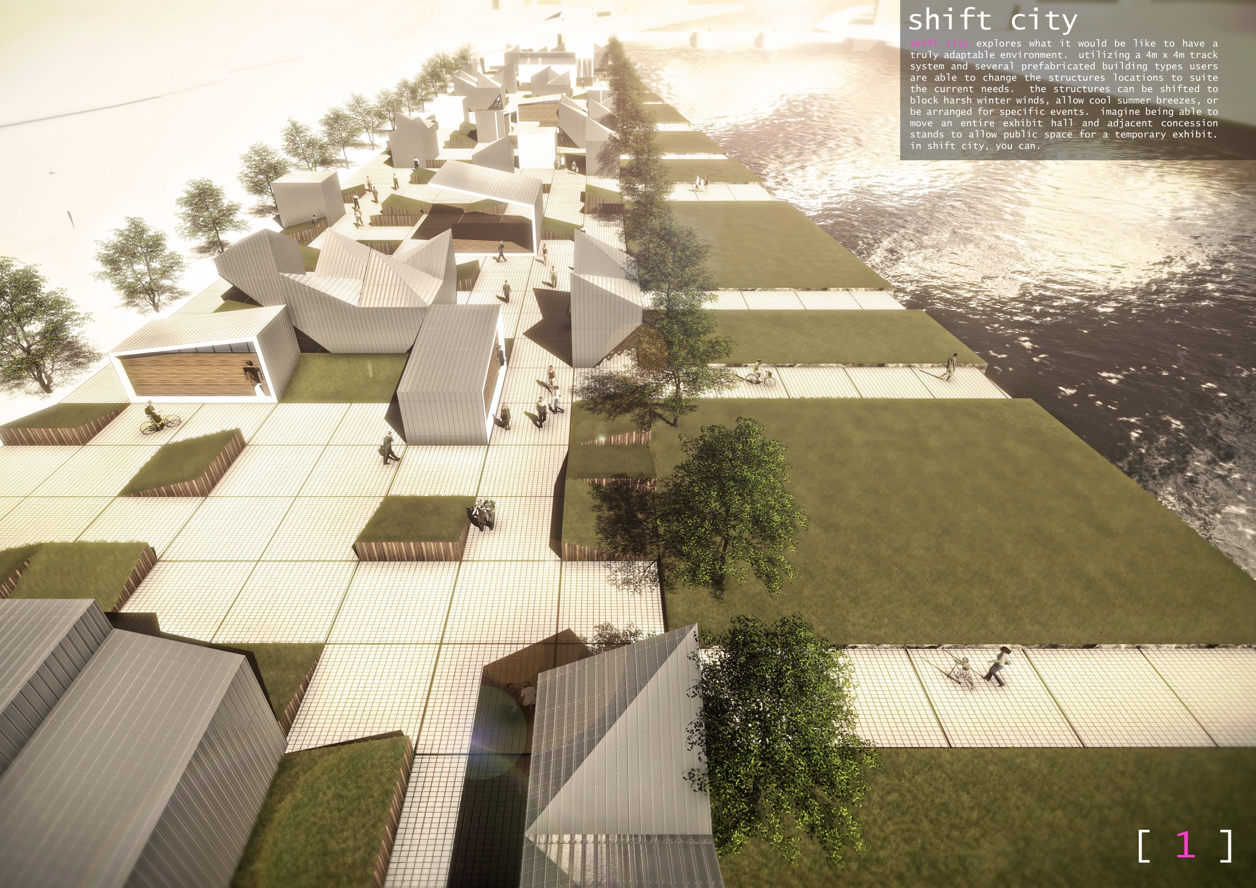 The third place project unifies the diverse forces of the site through programmed landscape. The project employs a clear design strategy mediating between the formal fabric of the city and informal edge of the waterfront. This is accomplished through pairing and juxtaposing of two distinct typologies: the civic plaza and recreational park. The civic plaza is traditionally hardscaped and monumental, while the recreational park tends to be soft scaped and informal.