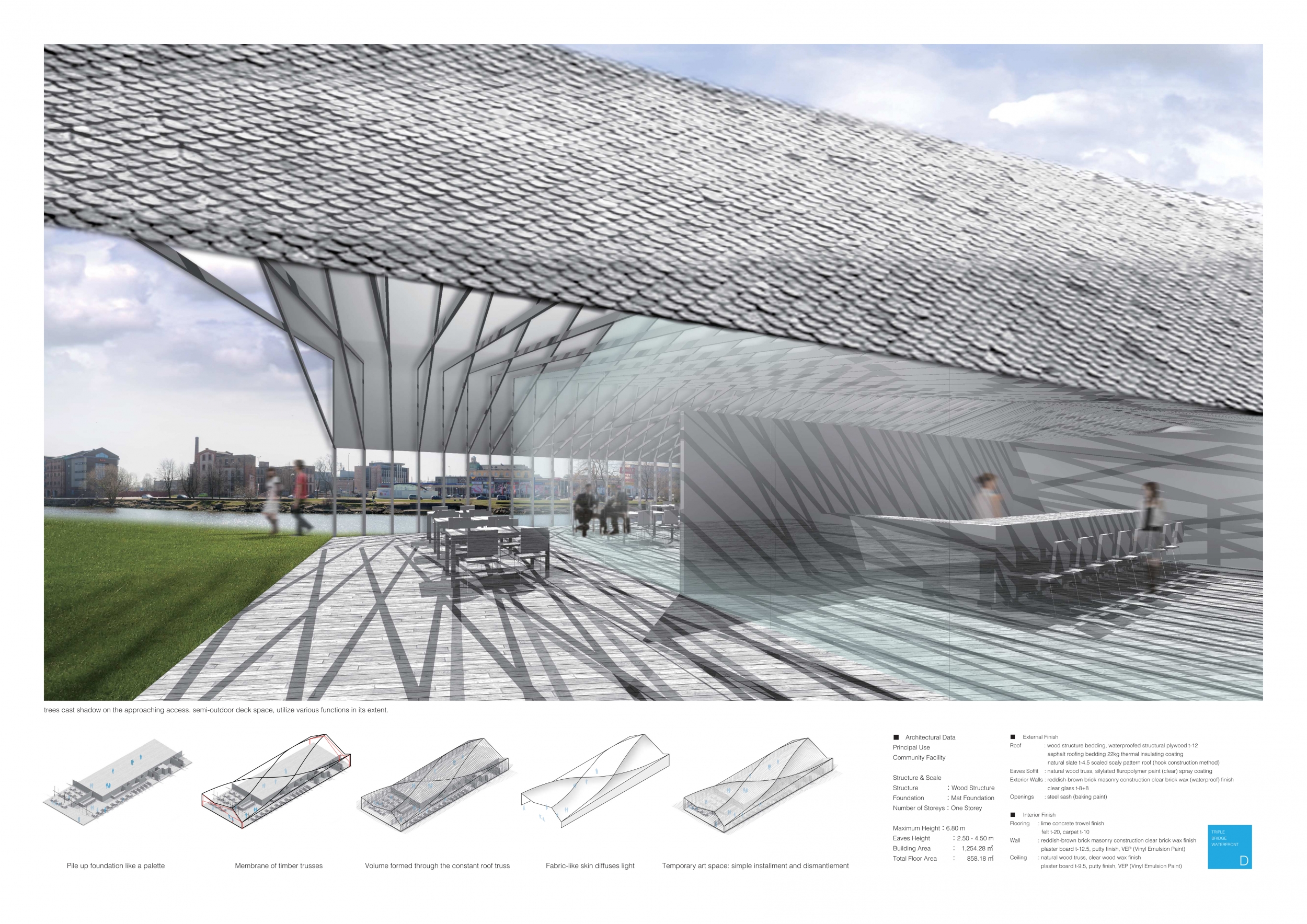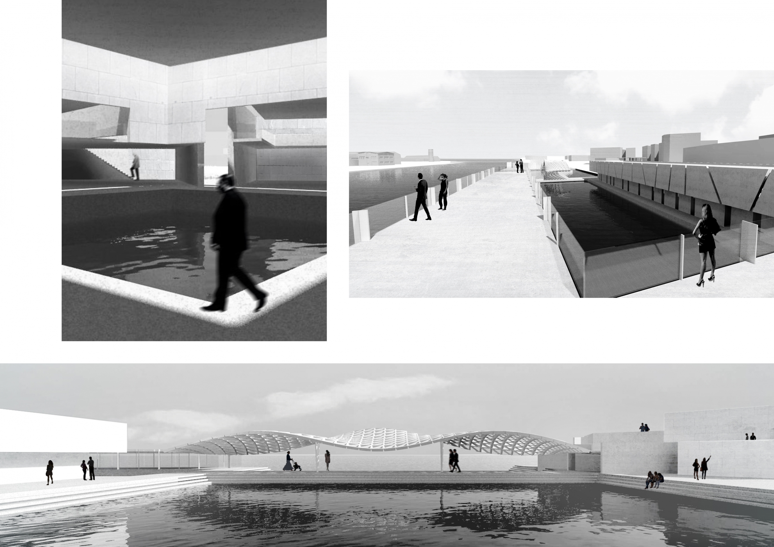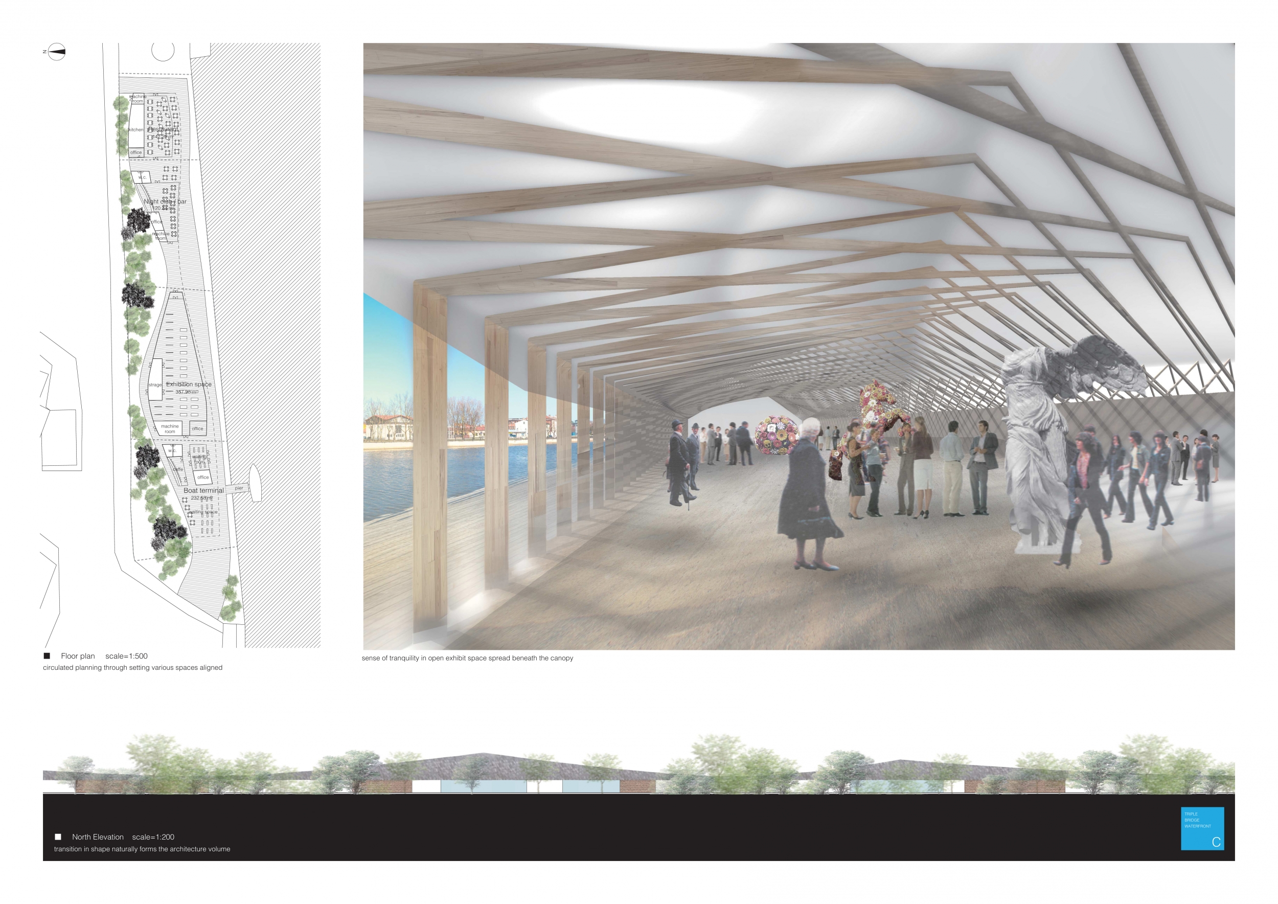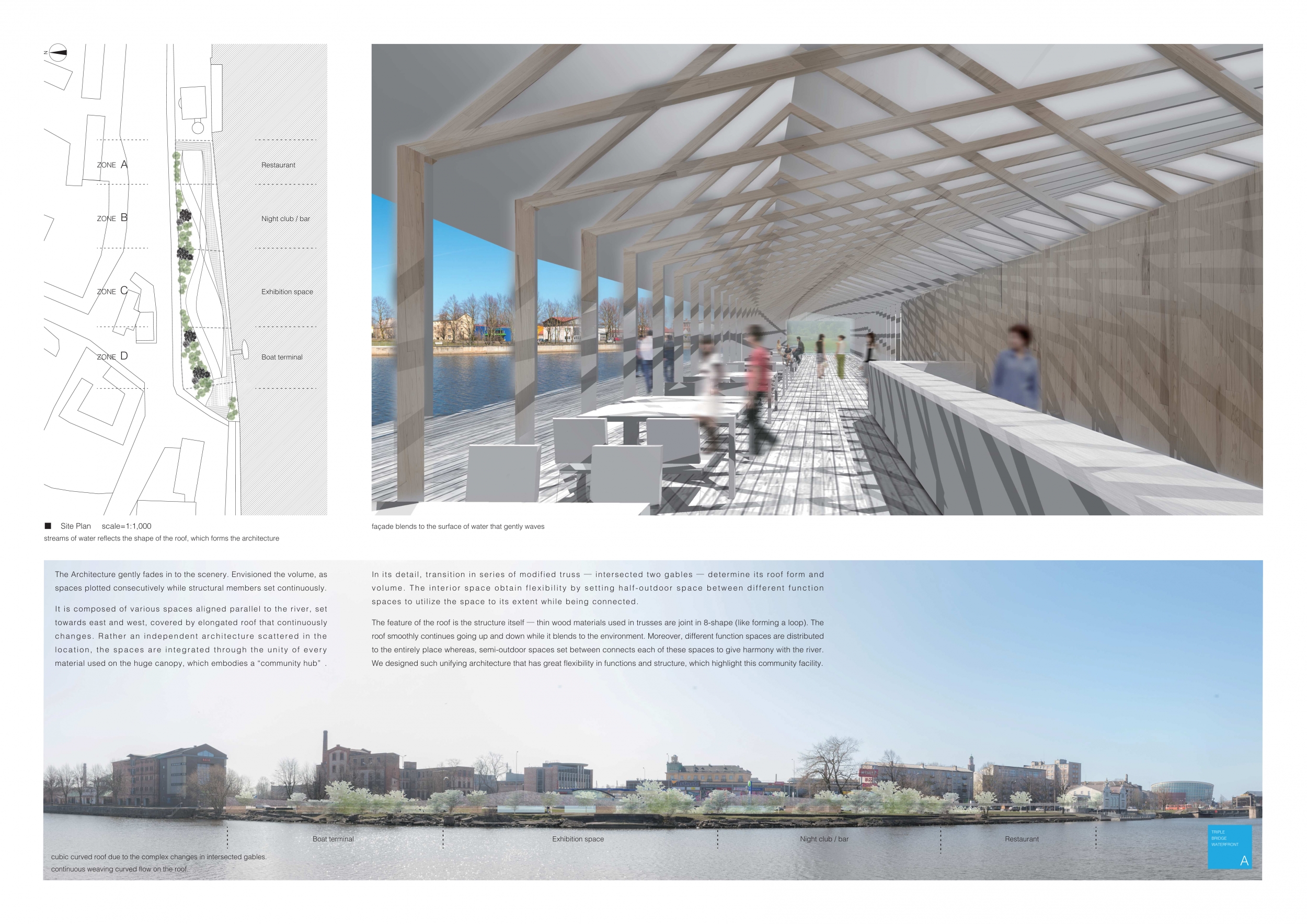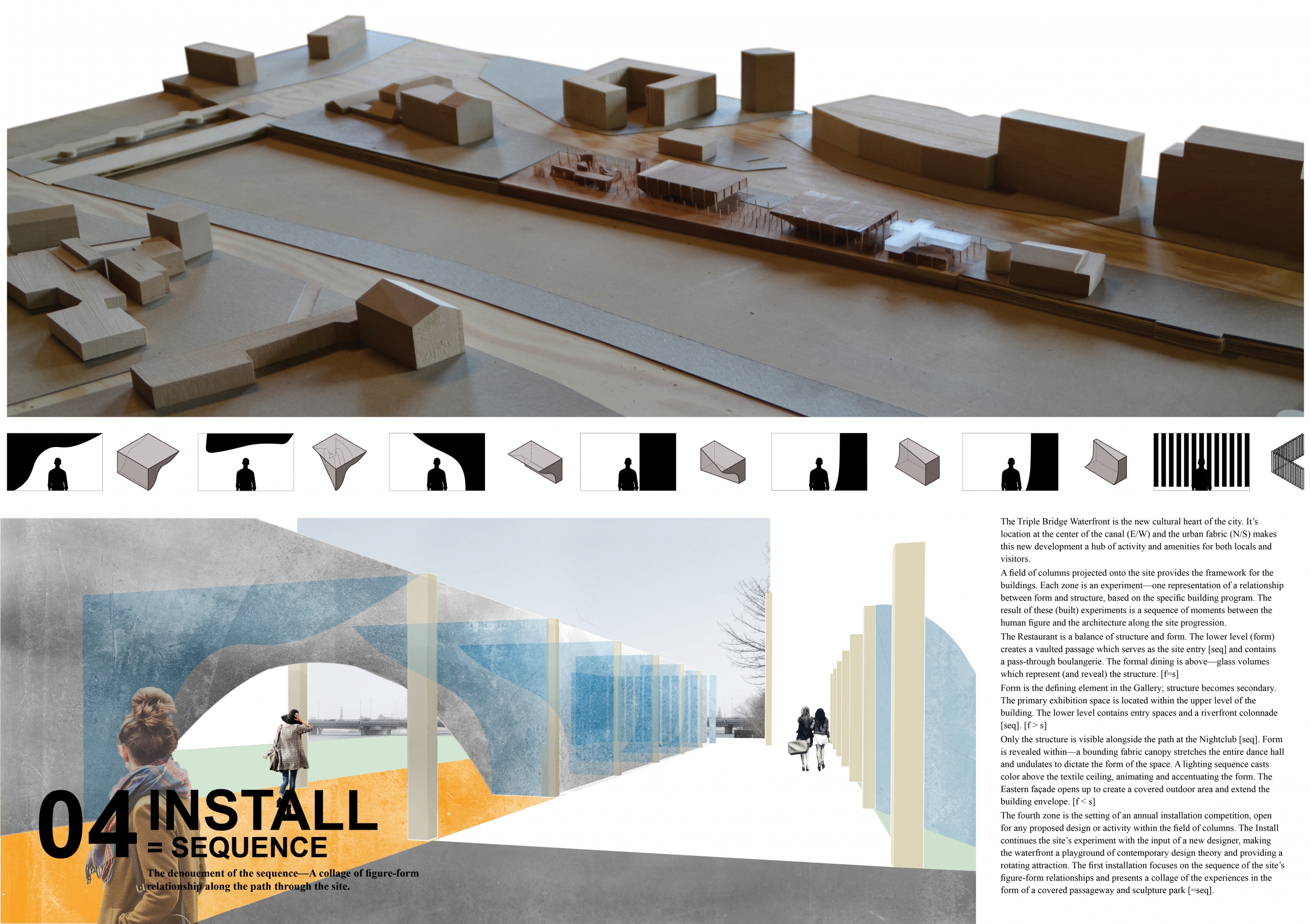 The Triple Bridge Waterfront competition suggests that sustainable growth and development in cities both old and new, is predicated on the vitality of public space. In the case of the Triple Bridge Waterfront, such a public space requires consideration of various demands, as outlined in a comprehensive brief. Successful entries to the competition were refined, yet nimble to accommodate a vast site flanked by historic buildings and exposure to a canal. In addition, the brief calls for inclusion of four distinct program including a restaurant/cafe, nightclub/bar, exhibition space/conference hall, and an unprescribed tourist attraction. Responses to the brief varied, from the formal iconoclastic, to the austere and reserved, the gestural to the nondescript, biotic to synthetic, and materialistic to the ephemeral.