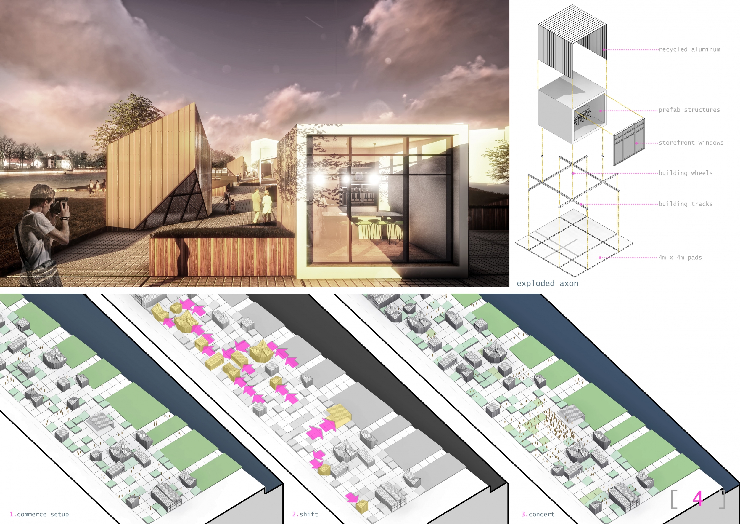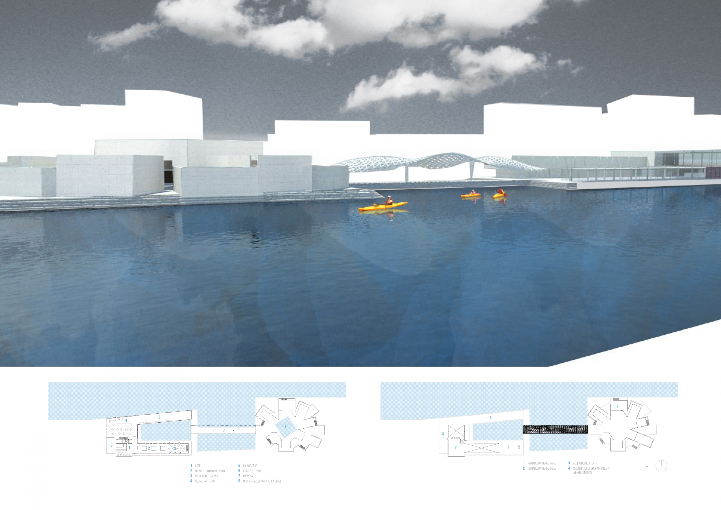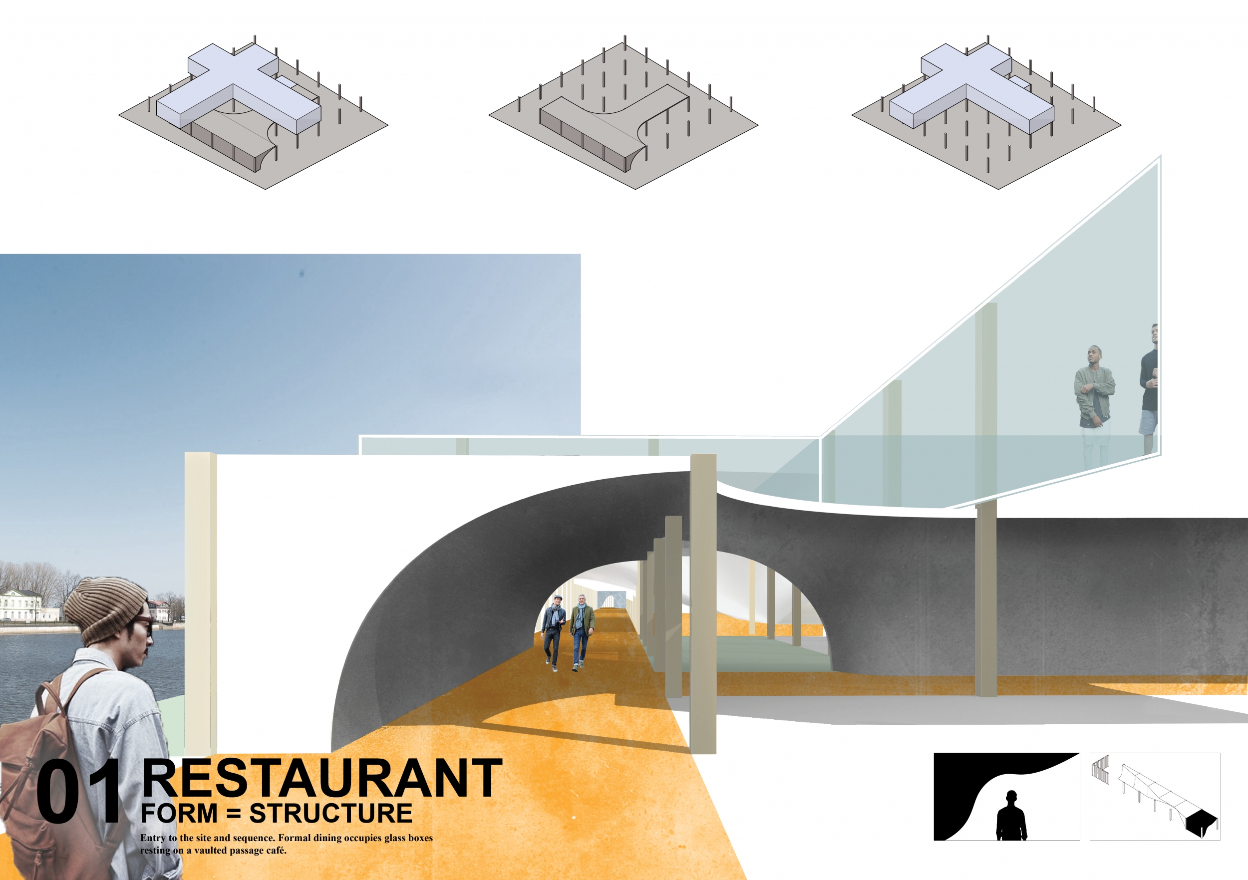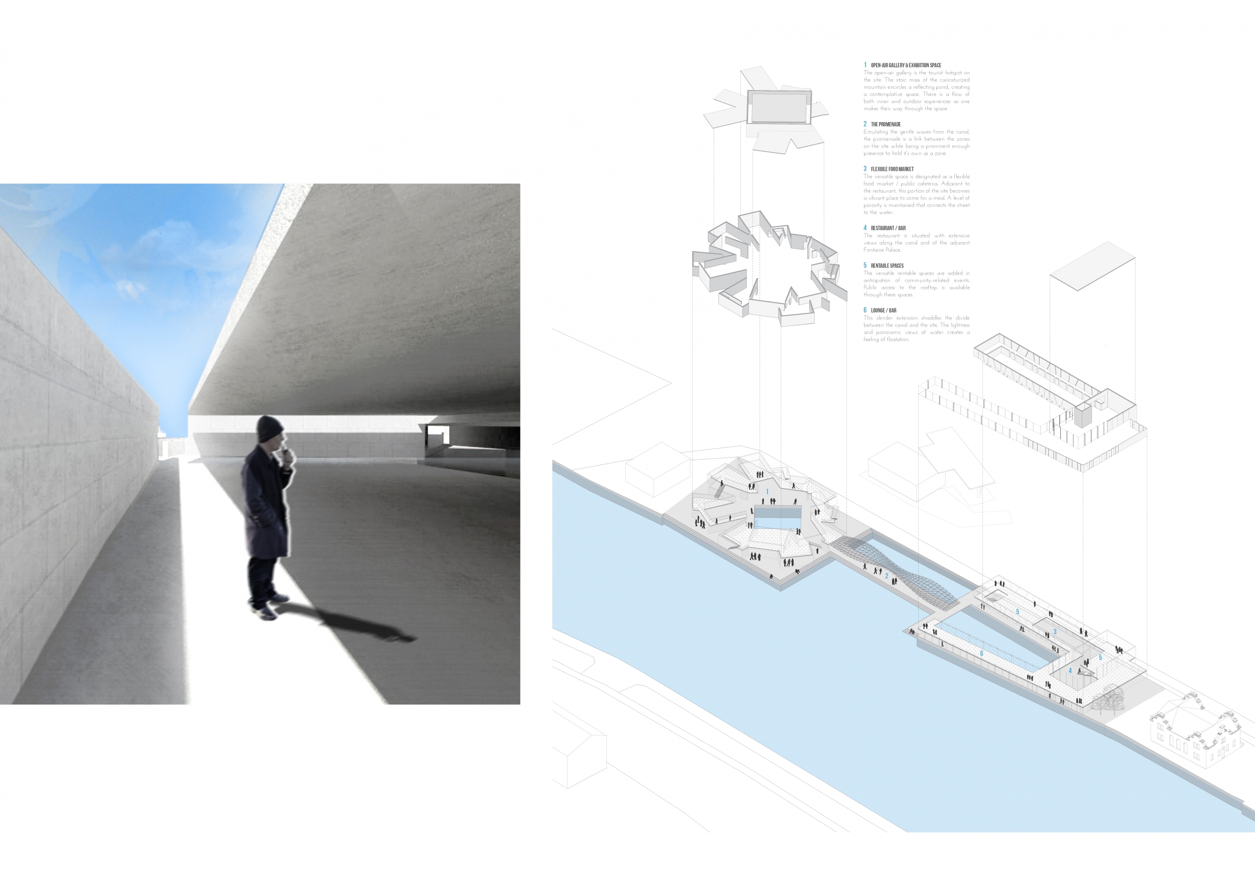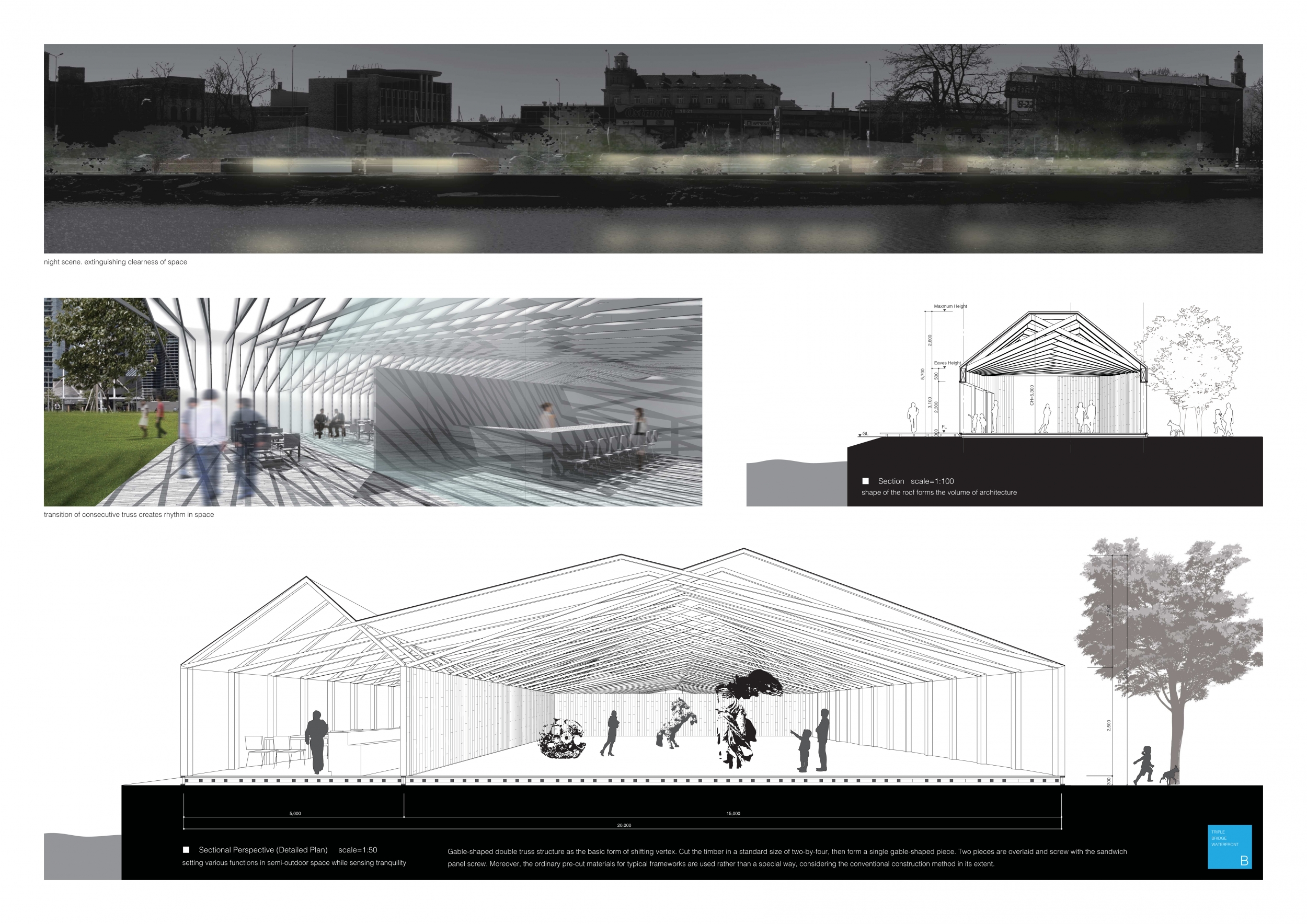 The Triple Bridge Waterfront competition suggests that sustainable growth and development in cities both old and new, is predicated on the vitality of public space. In the case of the Triple Bridge Waterfront, such a public space requires consideration of various demands, as outlined in a comprehensive brief. Successful entries to the competition were refined, yet nimble to accommodate a vast site flanked by historic buildings and exposure to a canal. In addition, the brief calls for inclusion of four distinct program including a restaurant/cafe, nightclub/bar, exhibition space/conference hall, and an unprescribed tourist attraction. Responses to the brief varied, from the formal iconoclastic, to the austere and reserved, the gestural to the nondescript, biotic to synthetic, and materialistic to the ephemeral.