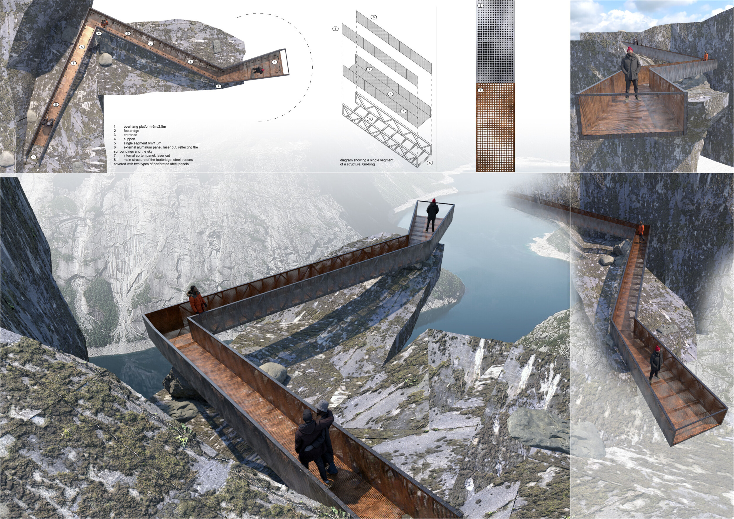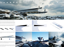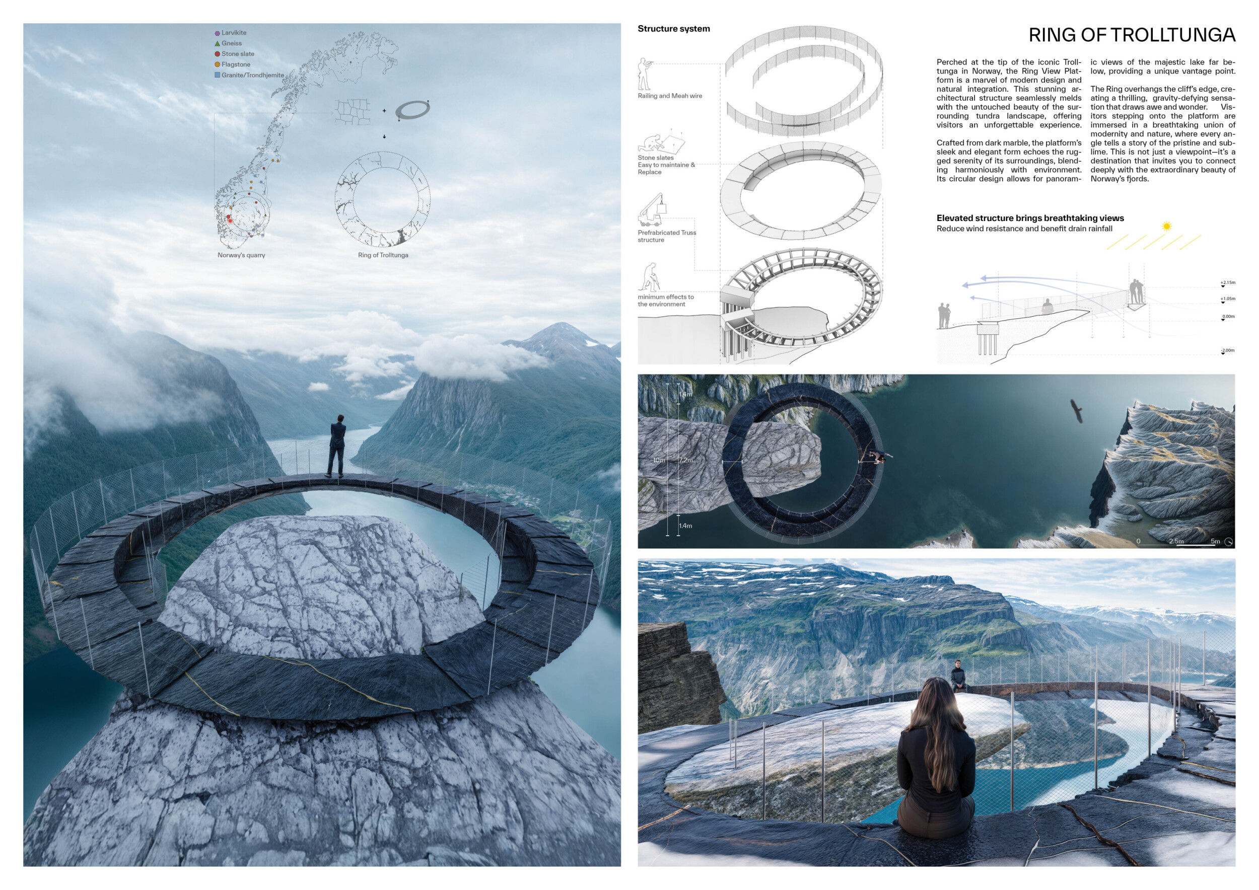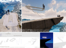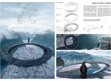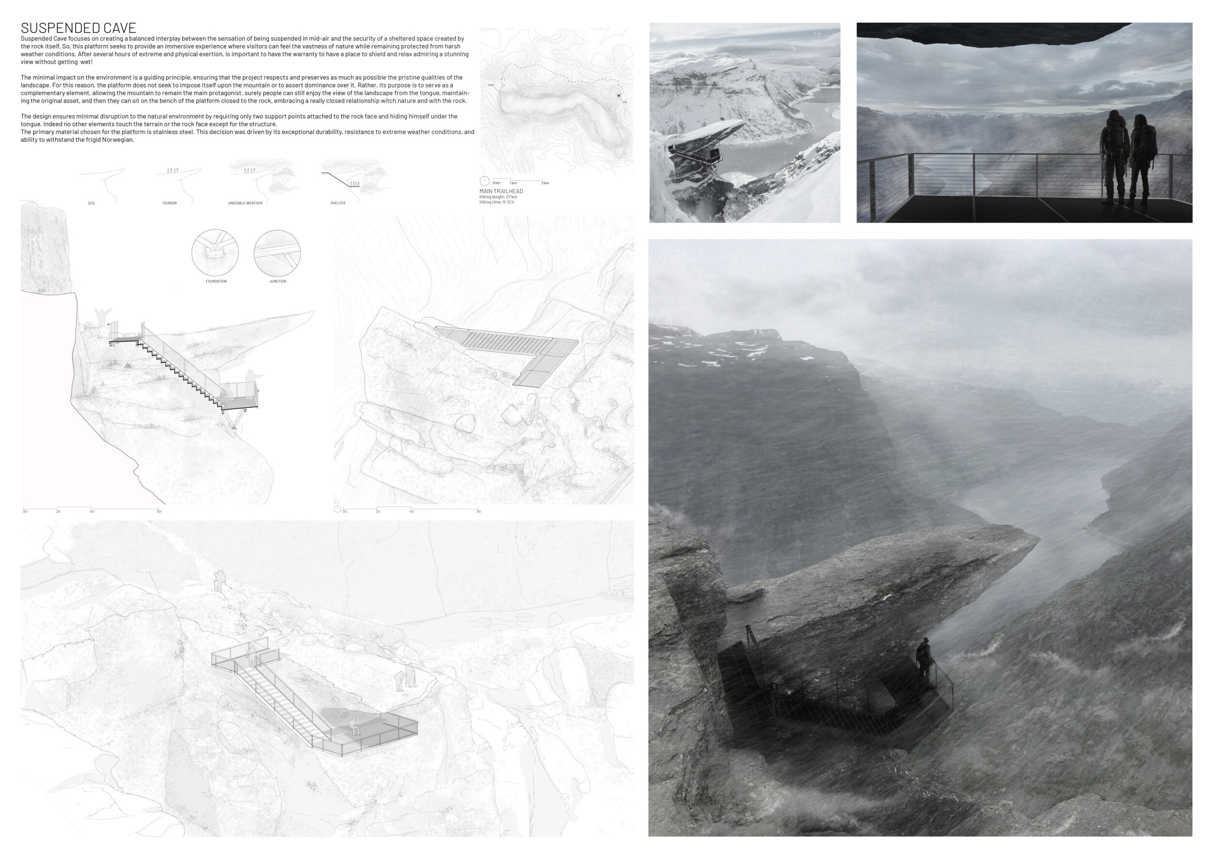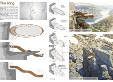 The project’s striking primary image effectively captures the cliff-edge observation point’s form, materials, and structure. The aerial perspective, paired with dramatic shadows, adds depth and visual impact. The text is overly long and lacks clear organization, making it difficult to navigate, and the author would benefit from larger fonts and subtitles to highlight key ideas.