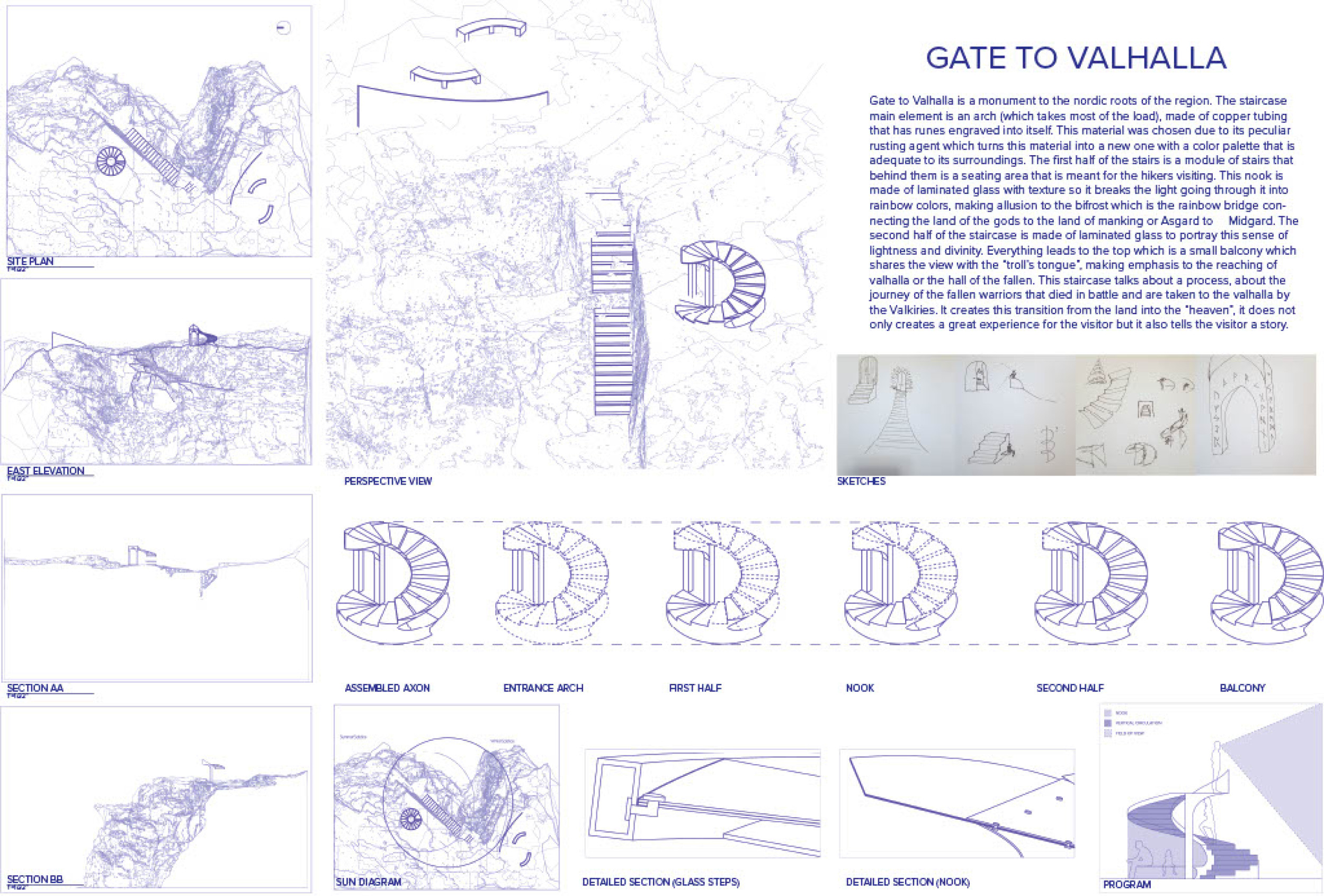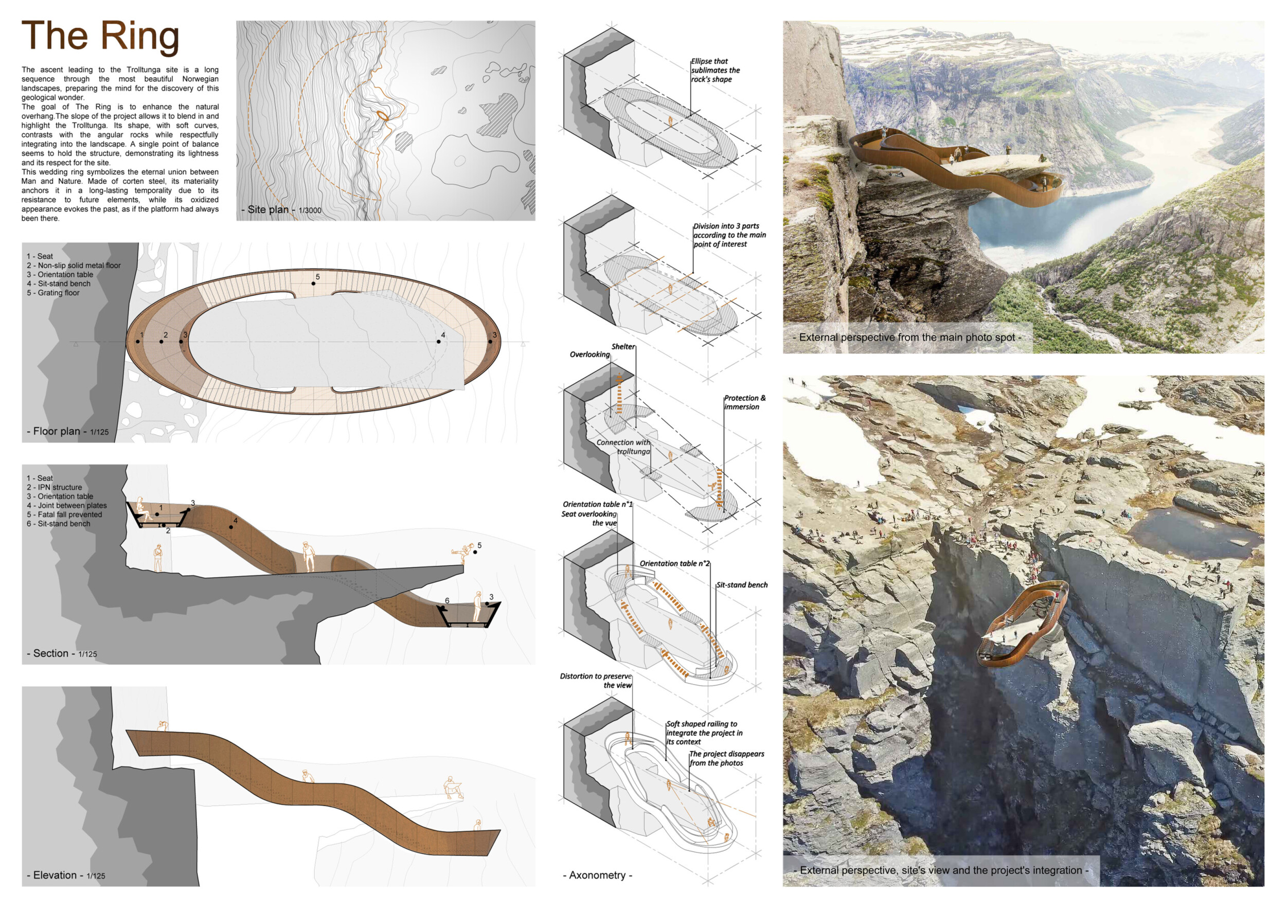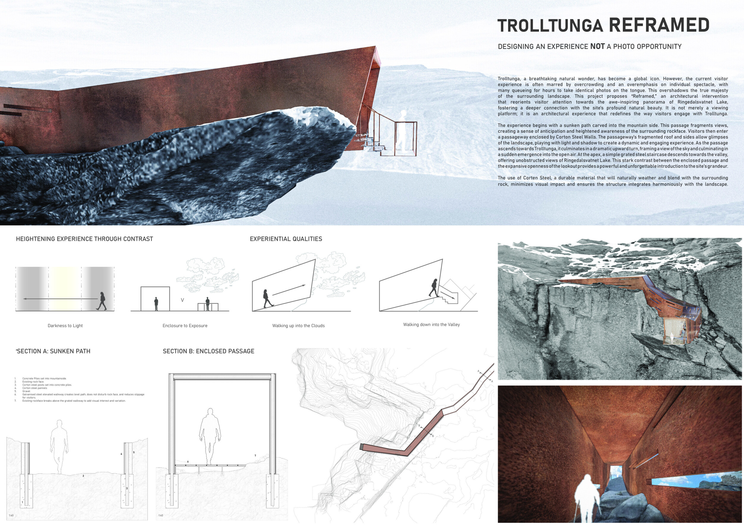 The project’s striking primary image effectively captures the cliff-edge observation point’s form, materials, and structure. The aerial perspective, paired with dramatic shadows, adds depth and visual impact. The text is overly long and lacks clear organization, making it difficult to navigate, and the author would benefit from larger fonts and subtitles to highlight key ideas.