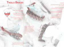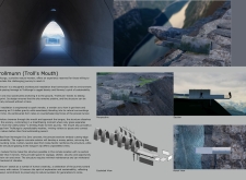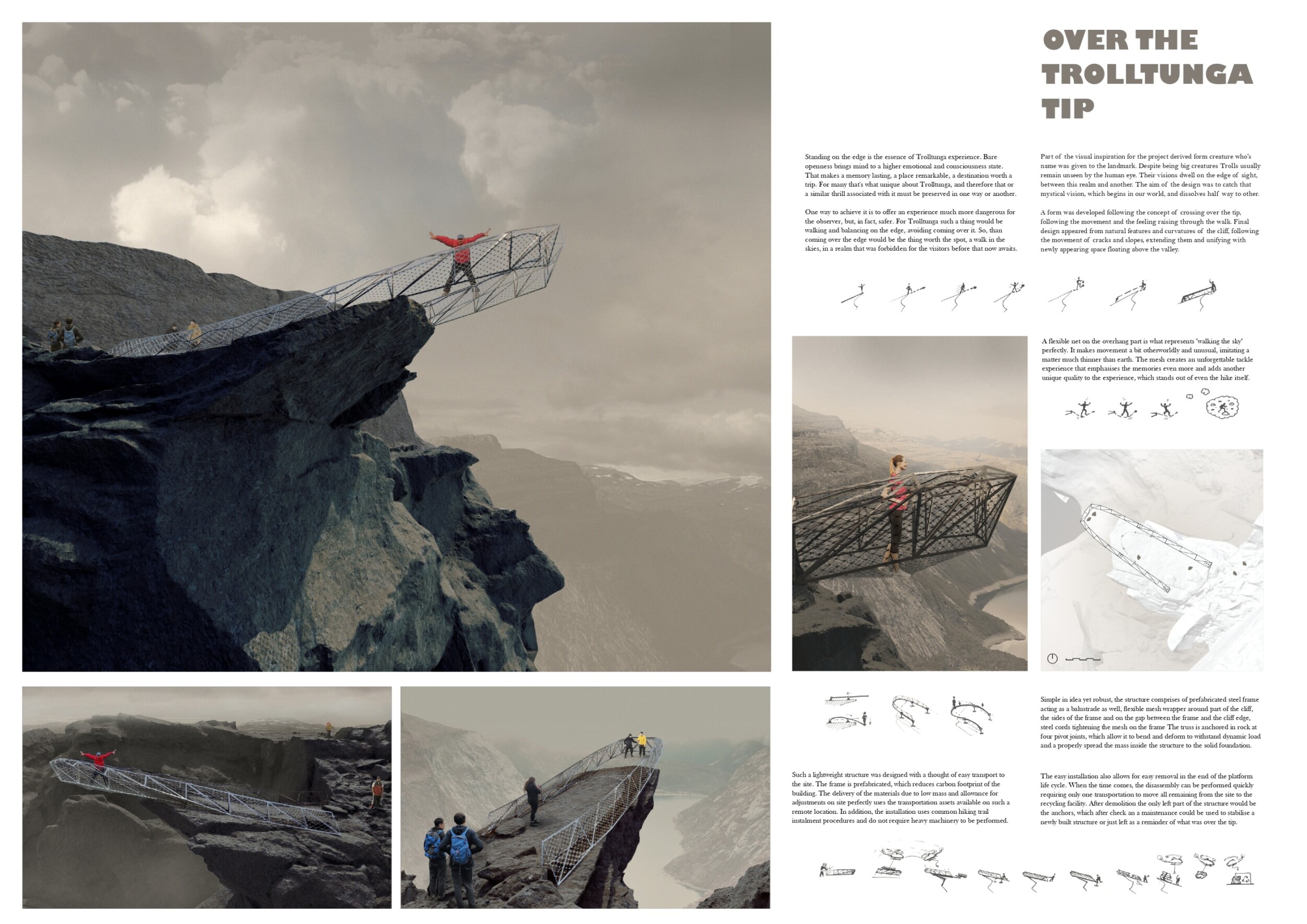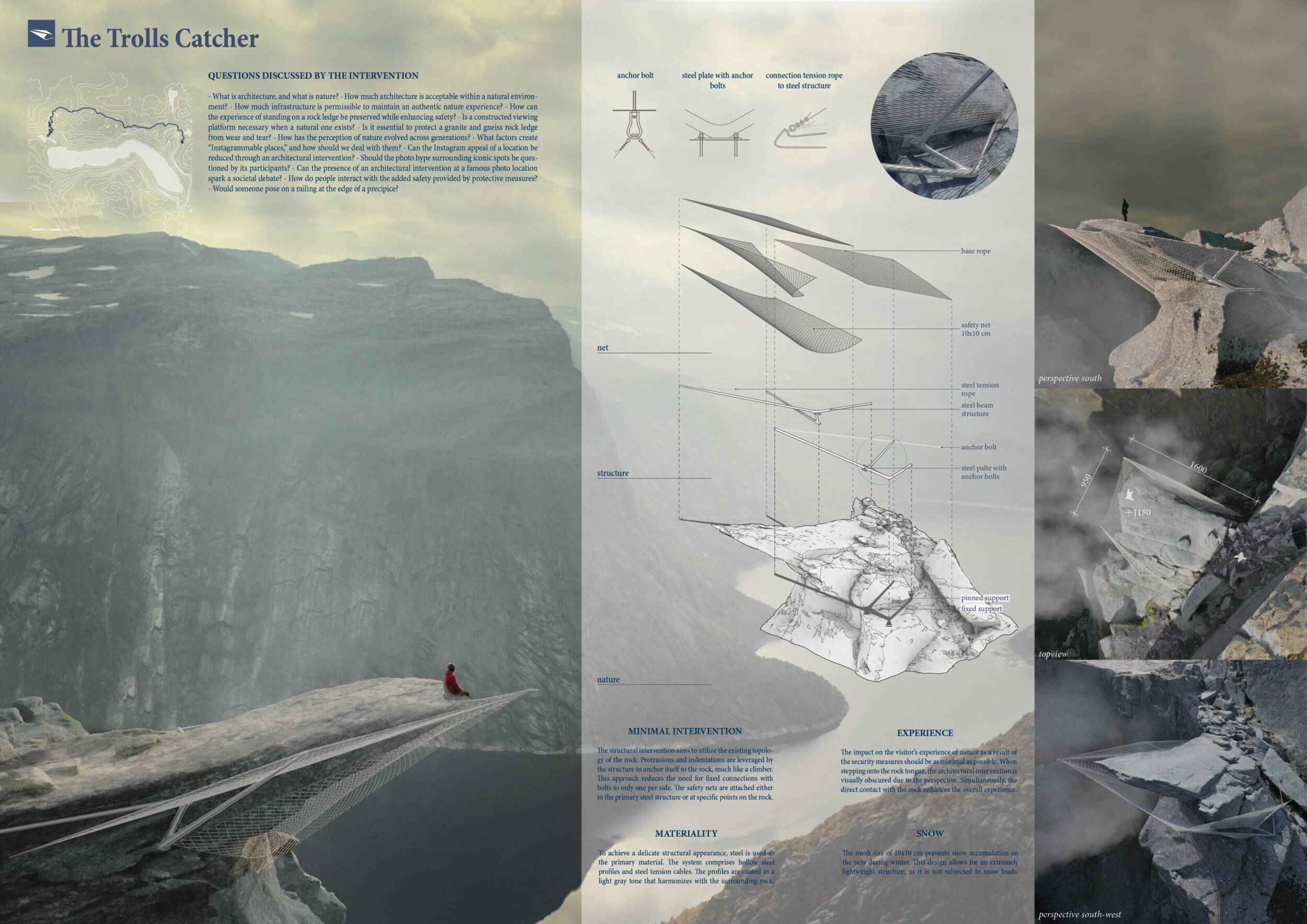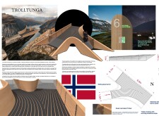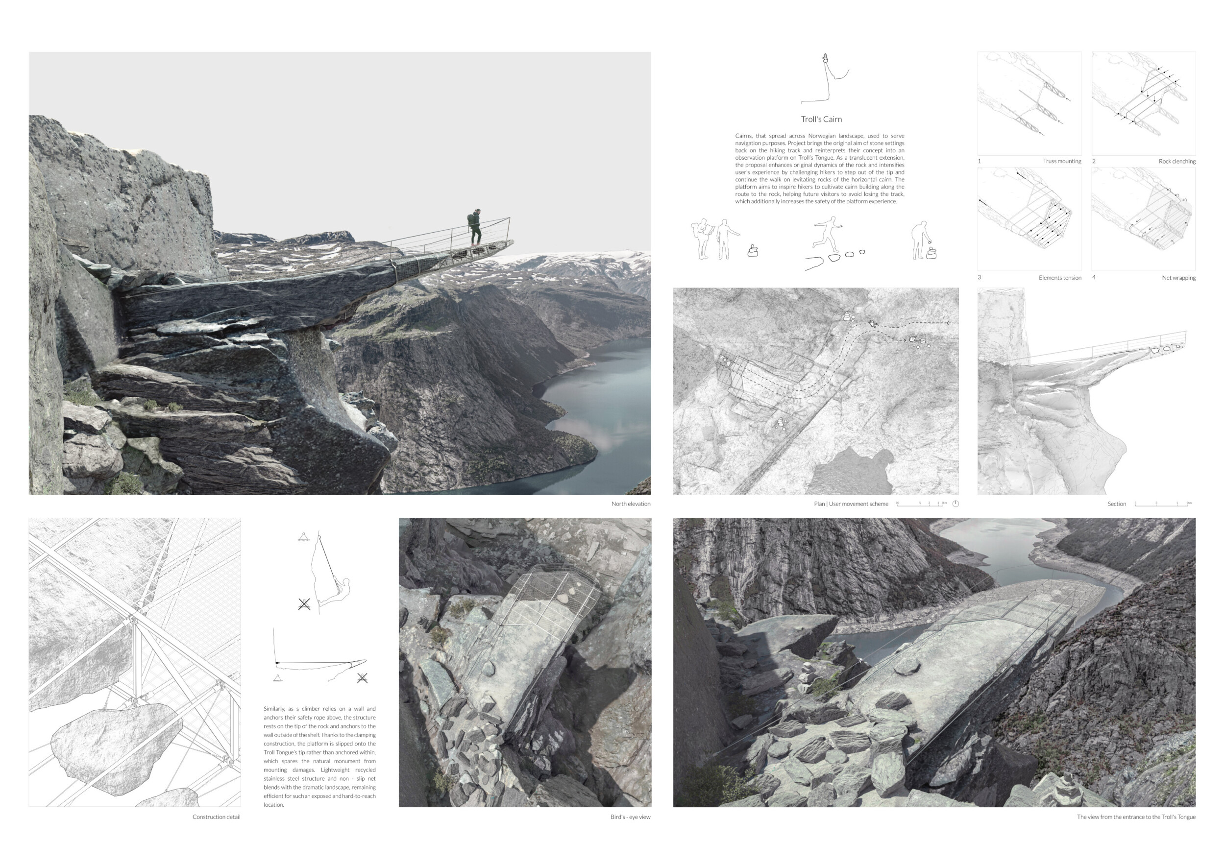 The Trolls Catcher is a minimal-intervention viewing platform designed to seamlessly integrate with the existing natural rock formation. Anchored with tension ropes and steel plates, the structure features a safety net suspended 100 meters above the ground, offering visitors a unique and thrilling experience. The lightweight design minimizes physical and visual impact on the landscape, ensuring harmony with the surroundings.