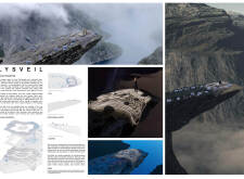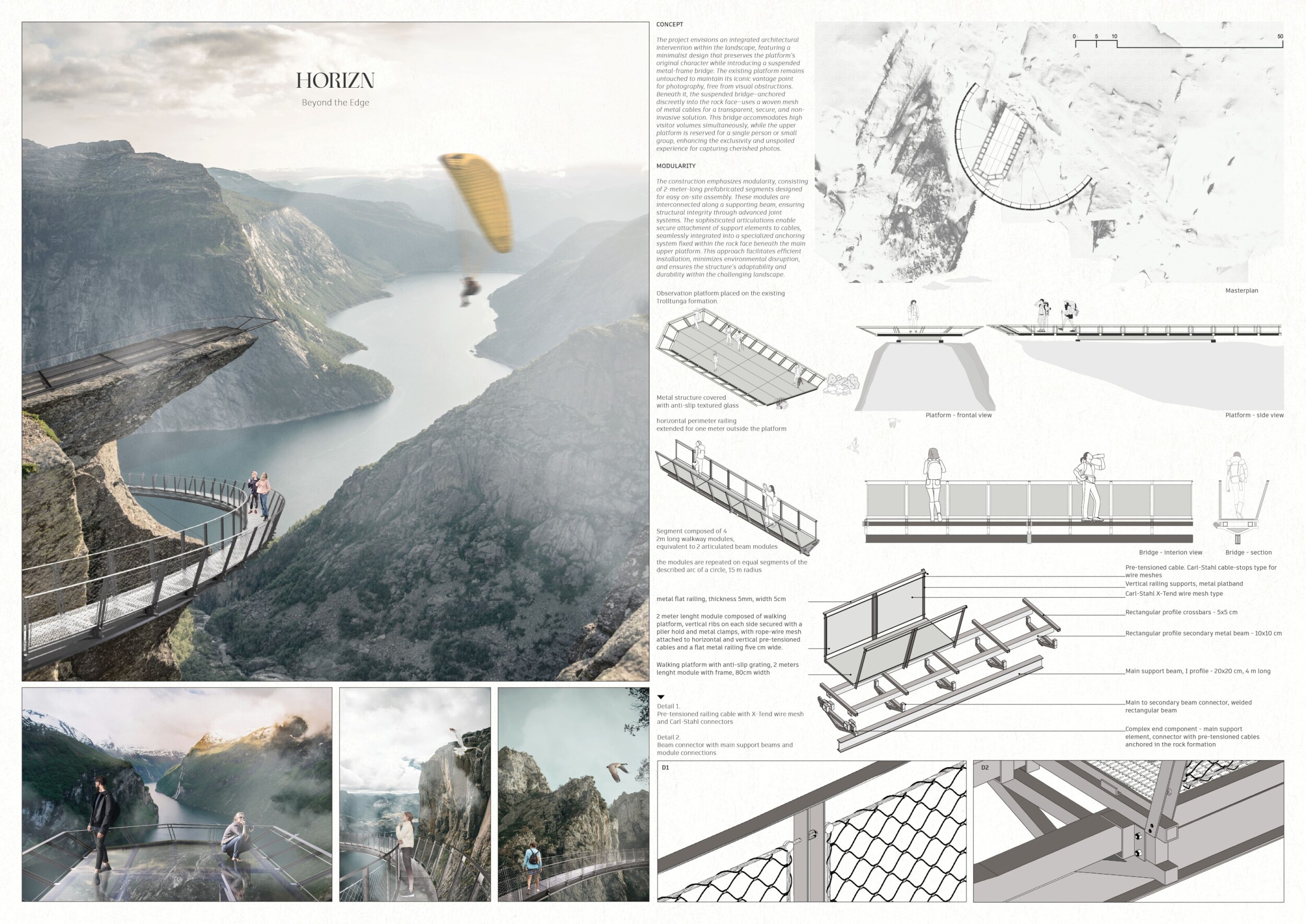 Horizn: Beyond the Edge is a cantilevered observation platform designed to enhance the visitor's experience of the surrounding natural landscape. The project emphasizes modular construction, utilizing prefabricated steel and tempered glass elements for easy assembly and minimal environmental impact. Positioned on an existing cliff, the platform seamlessly integrates with the terrain, offering unobstructed panoramic views.