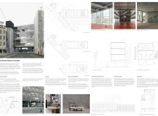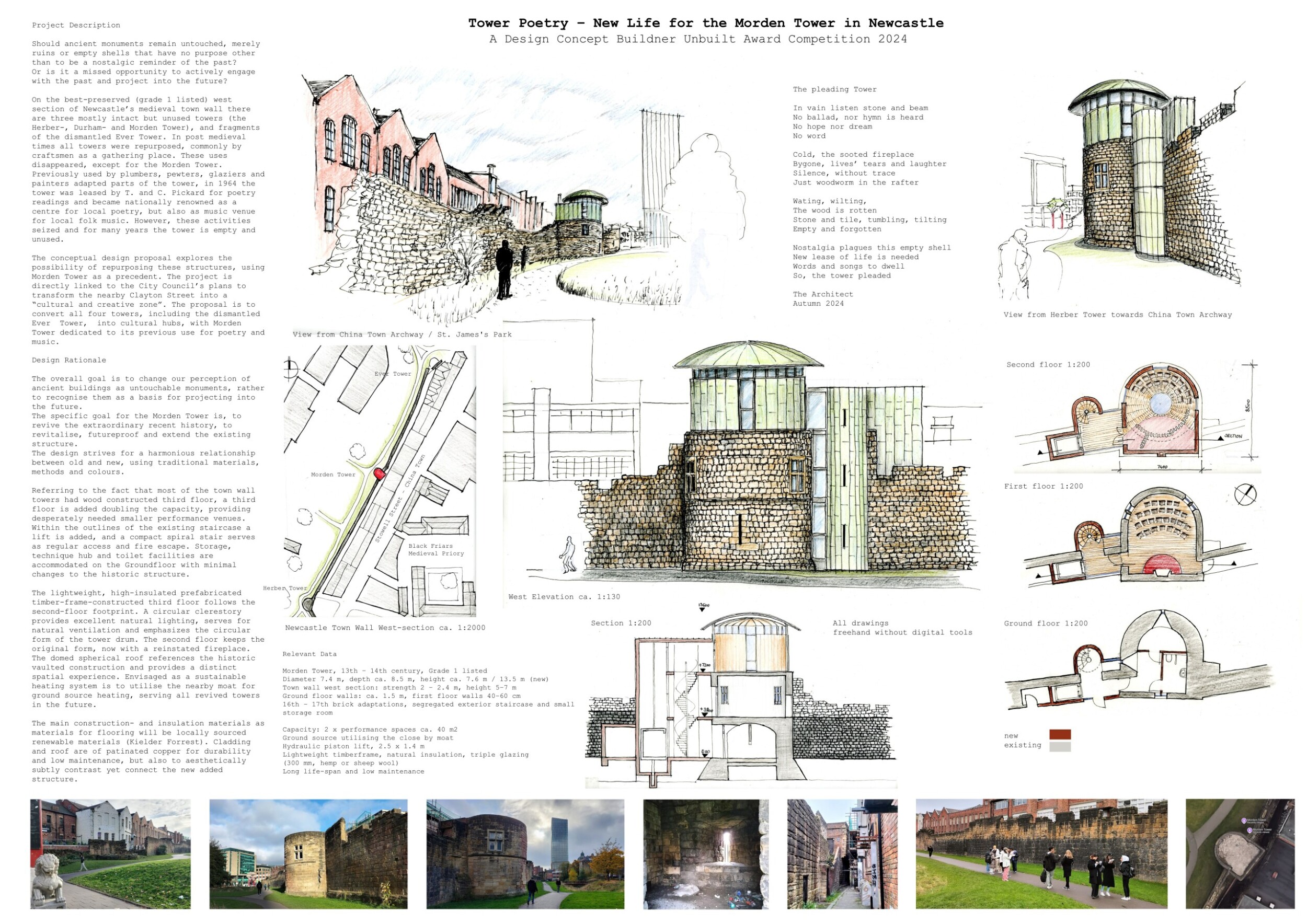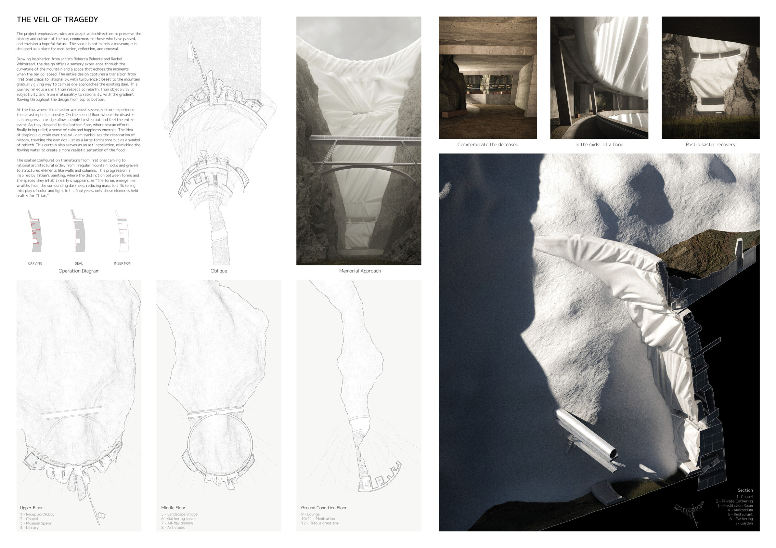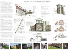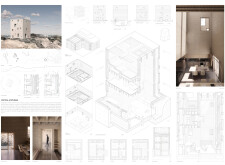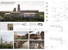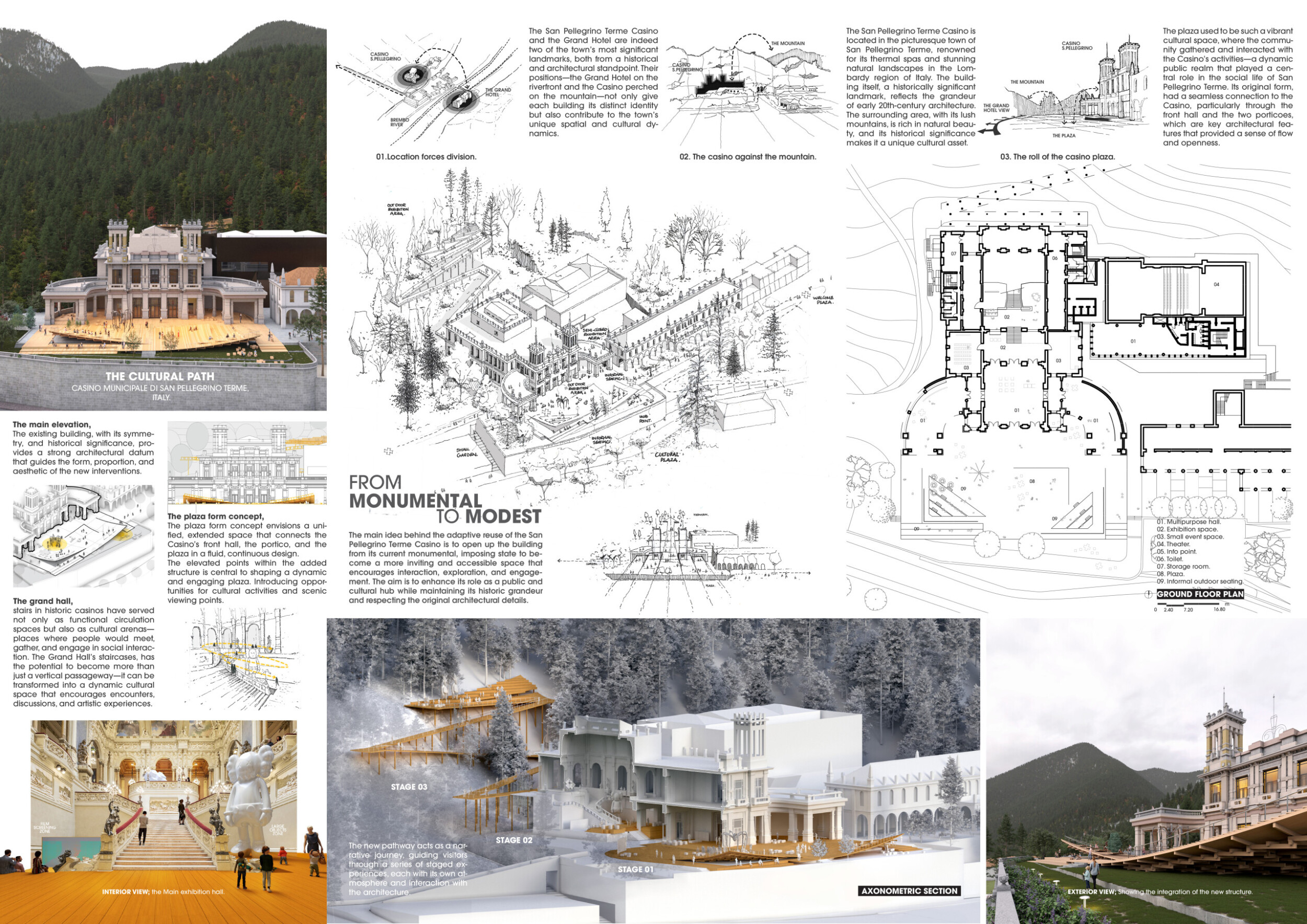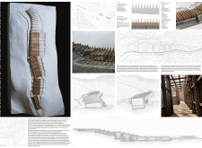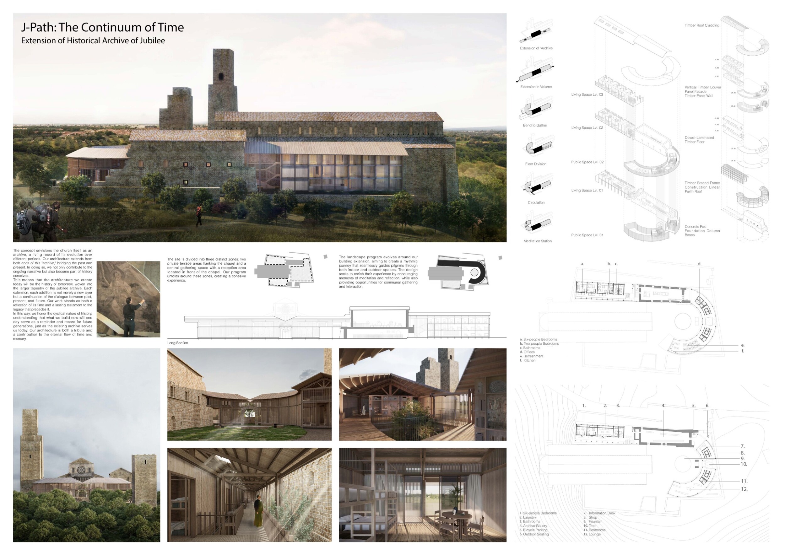 The project reinterprets a historic stone wall, transforming it into a contemporary architectural intervention. Located on a sloping site, the design integrates with the terrain while preserving the wall's cultural significance. A modular timber structure, aligned on a 3m grid, extends from the wall, creating elevated platforms and pathways that connect to entryways and surrounding trails. Spaces include exhibition zones, offices, and flexible work areas. The structure combines timber and stone, blending historical and modern materials. This tectonic approach balances preservation with innovation, establishing a dialogue between heritage, environment, and function while enhancing spatial experiences.