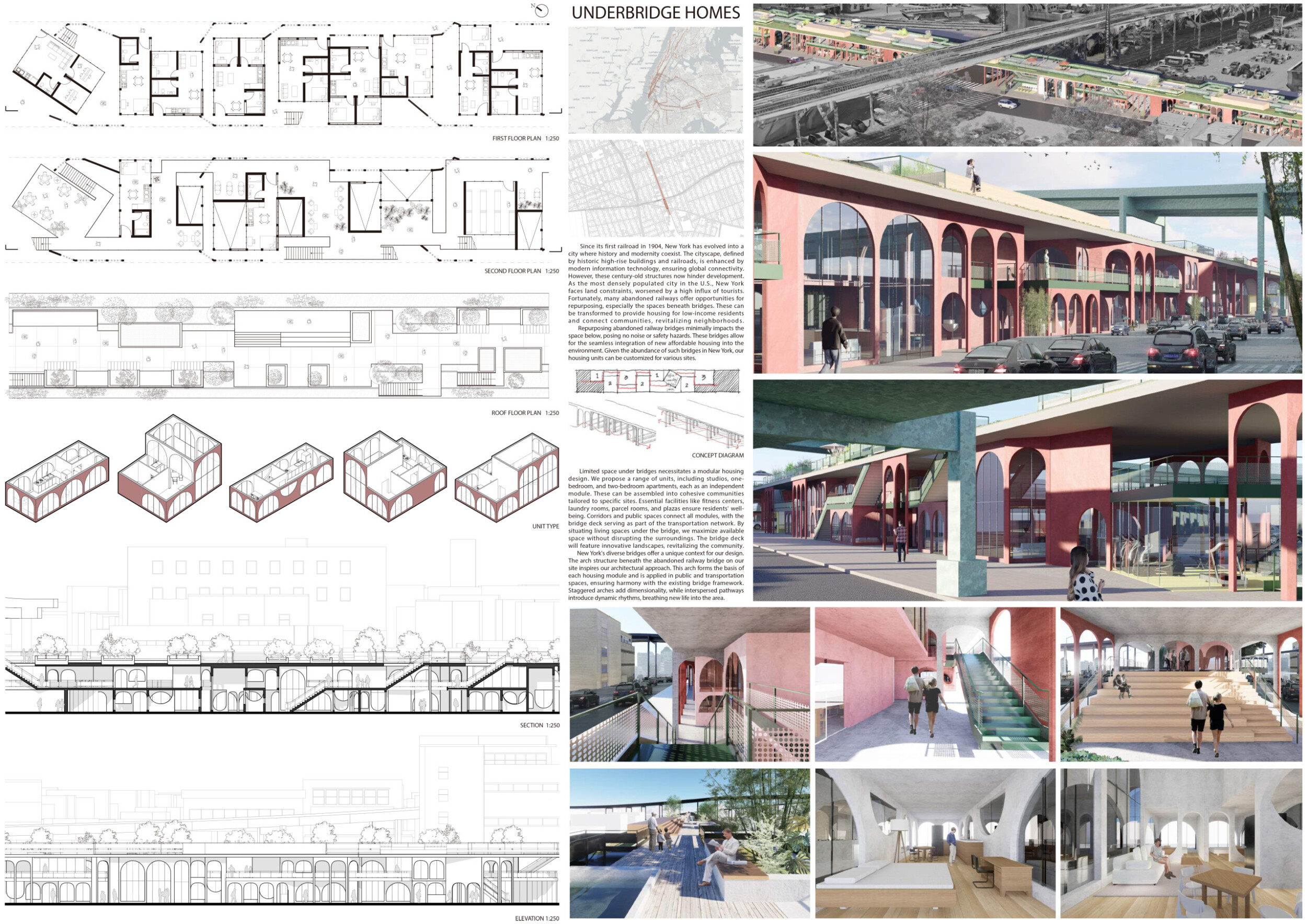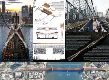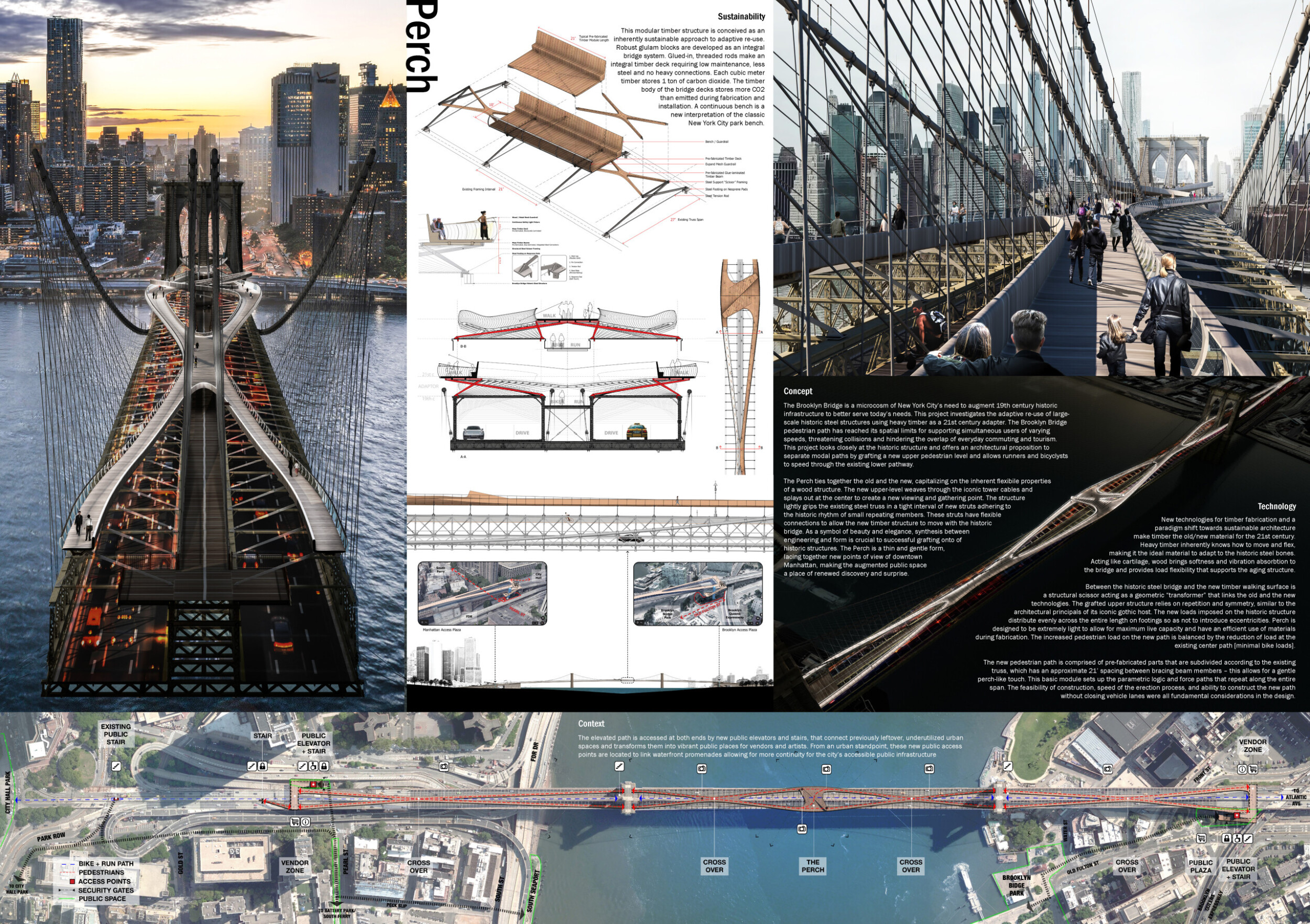 The Perch reimagines the Brooklyn Bridge as a dynamic public space, addressing the need for pedestrian and cyclist accessibility while preserving its historic fabric. A modular timber structure is added above the existing deck, creating elevated pathways and gathering spaces. The design enhances sustainability by using responsibly sourced timber, reducing carbon footprints, and integrating solar panels for energy generation. The Perch connects existing access points with new elevators and stairs, improving circulation and accessibility. By combining history with modern technology, the intervention provides panoramic views, increased public space, and a renewed sense of discovery, redefining the bridge as a contemporary urban experience.
