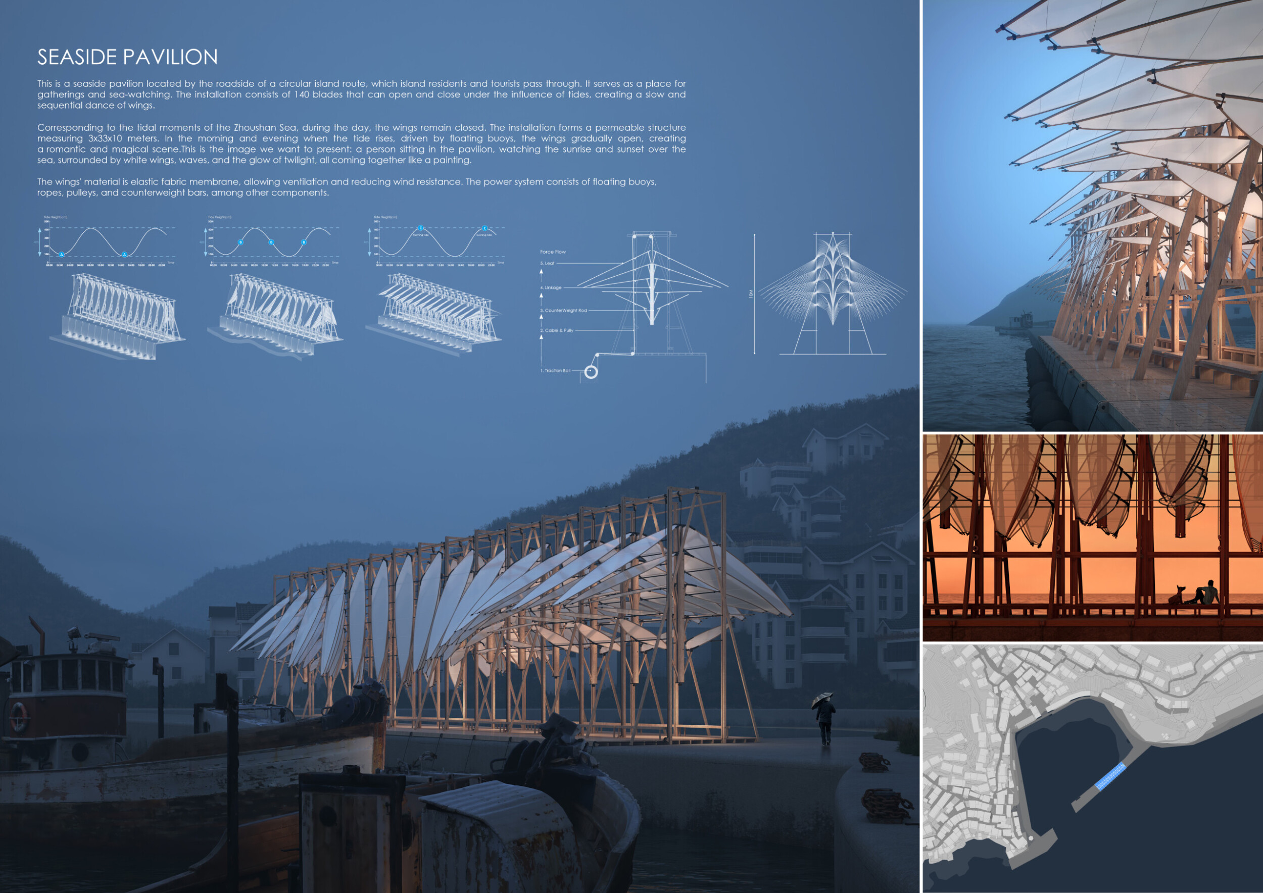 The Seaside Pavilion is a dynamic structure located along a circular island route, serving as a gathering space for residents and tourists. Inspired by tidal rhythms, the pavilion features 140 adjustable blades made of an elastic fabric membrane, which open and close with the tide, creating a graceful, sequential motion resembling wings. The structure spans 33x10 meters and allows ventilation while reducing wind resistance. Powered by floating buoys, pulleys, and counterweights, the pavilion harmonizes with the natural surroundings, offering visitors an immersive experience of sunrise, sunset, and sea views. It blends engineering, art, and nature, transforming the landscape into a living, moving installation.