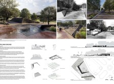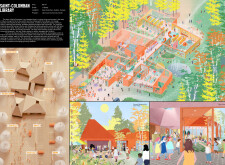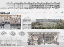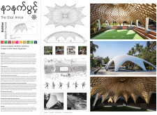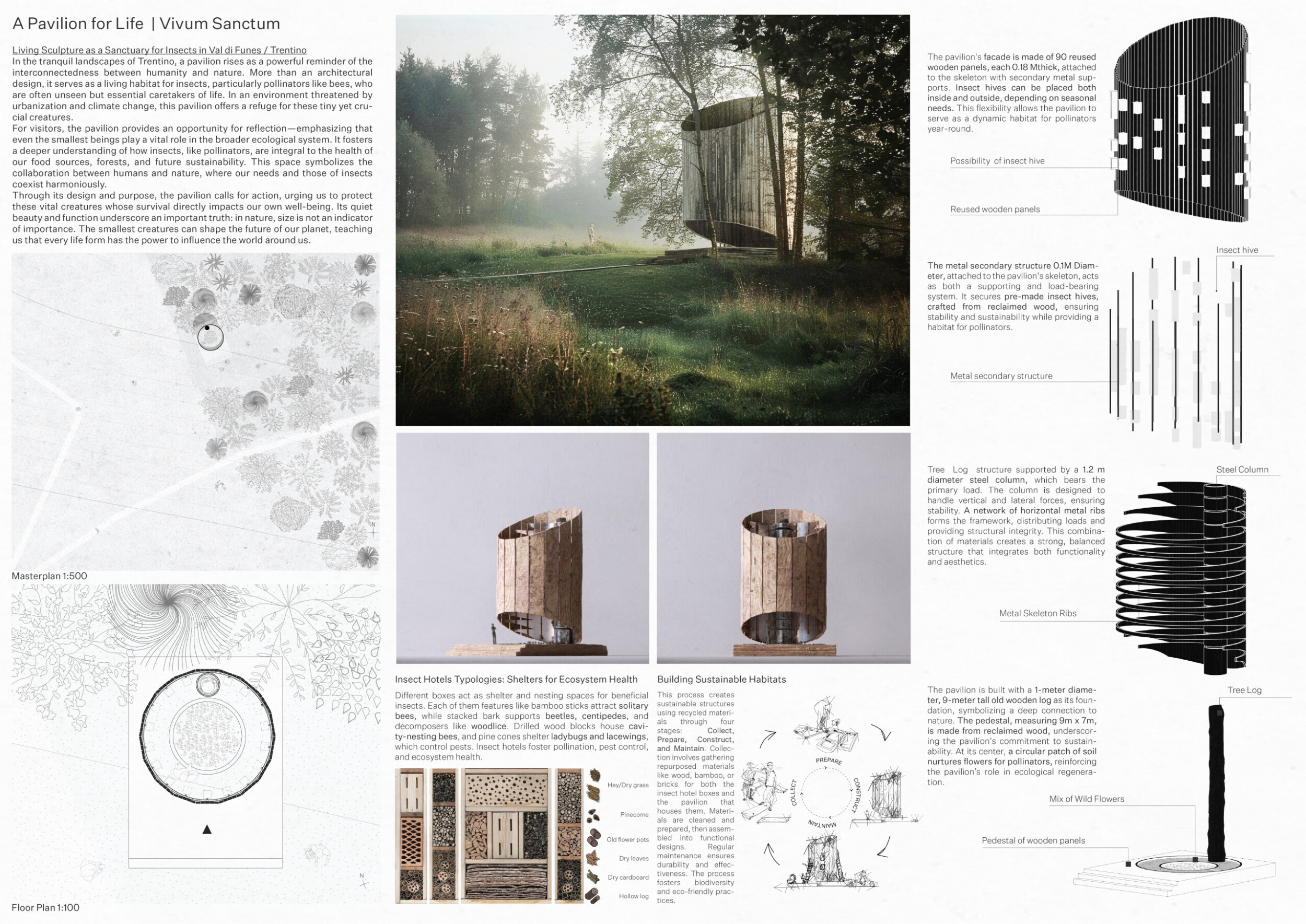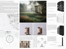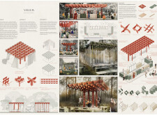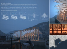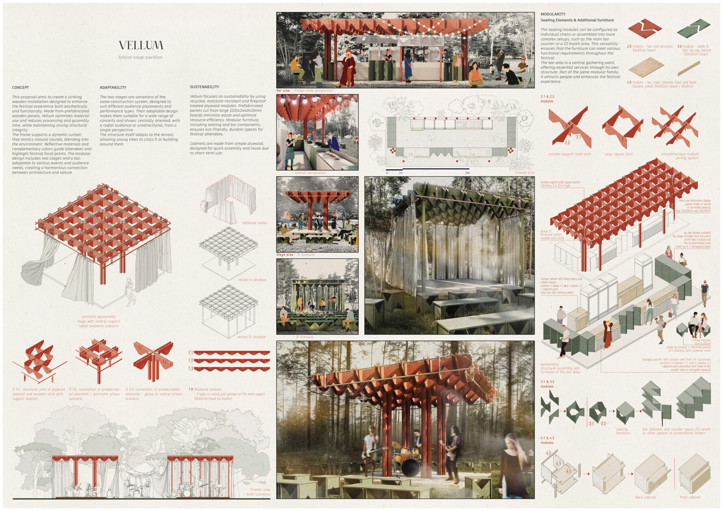 The Vellum pavilion is a modular, adaptable structure designed to blend architecture and nature seamlessly. It features a dynamic curtain system suspended from a lightweight timber grid, creating flexible enclosures that respond to natural breezes while offering shade and shelter. The pavilion adapts to various terrains and configurations, utilizing sustainable materials like plywood and pre-fabricated components for ease of assembly and reuse. Seating modules double as storage or platforms, enhancing versatility. The pavilion's design encourages interaction, modularity, and environmental harmony, serving as a functional stage, gathering space, and symbol of sustainable, temporary architecture.
