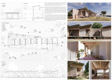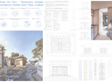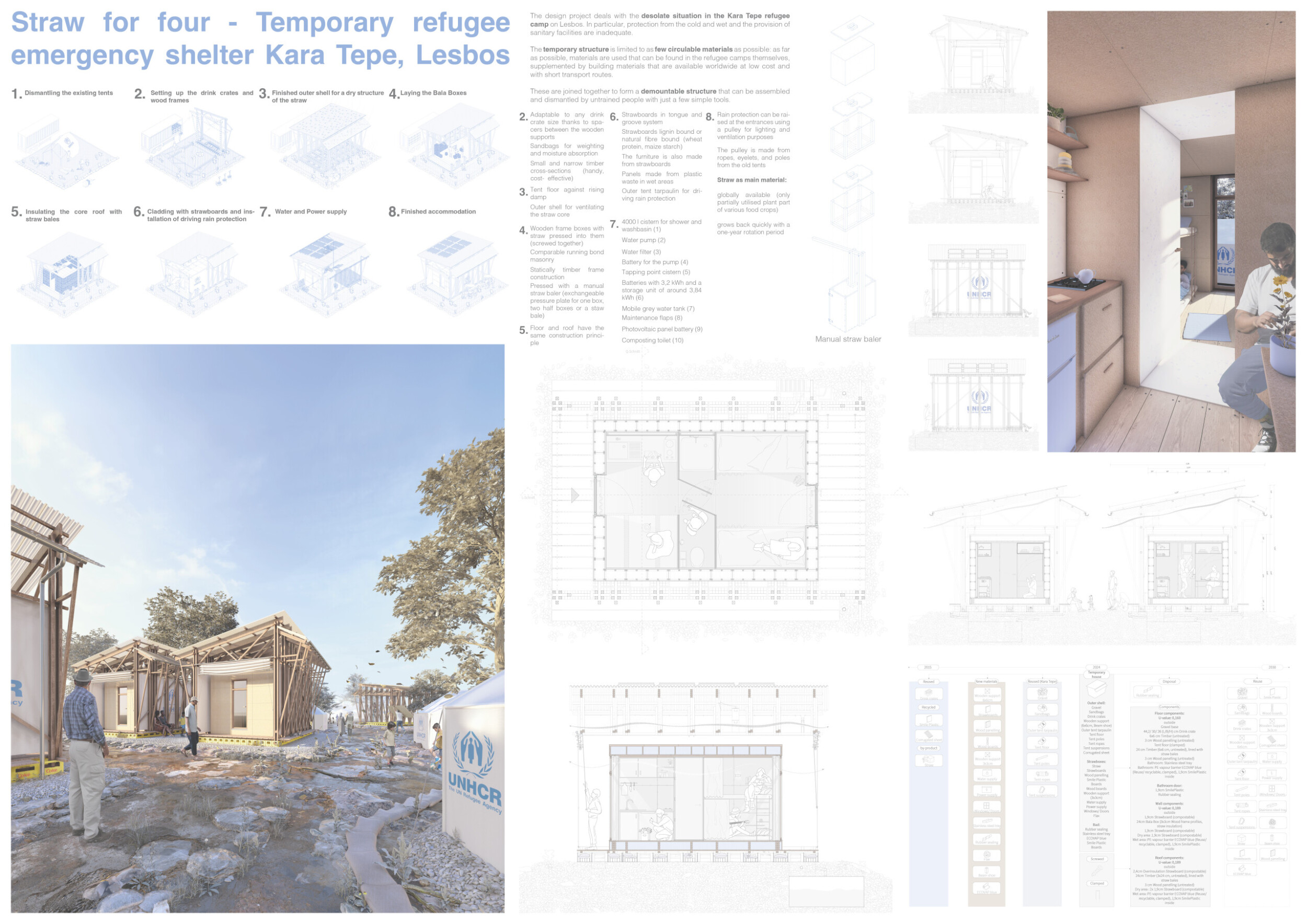 The project addresses the critical shelter needs in the Kara Tepe refugee camp on Lesbos. Designed as a demountable structure, it uses low-cost, recyclable materials such as straw bales, wood, and natural fibers for insulation and protection. The modular design supports quick assembly with minimal tools and labor, creating a durable, insulated space that ensures comfort and safety. Each unit accommodates four people, featuring essential amenities like water supply, ventilation, and thermal insulation. This sustainable solution emphasizes low environmental impact, easy construction, and protection against weather, providing dignified, temporary living conditions for displaced families.