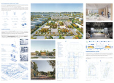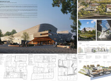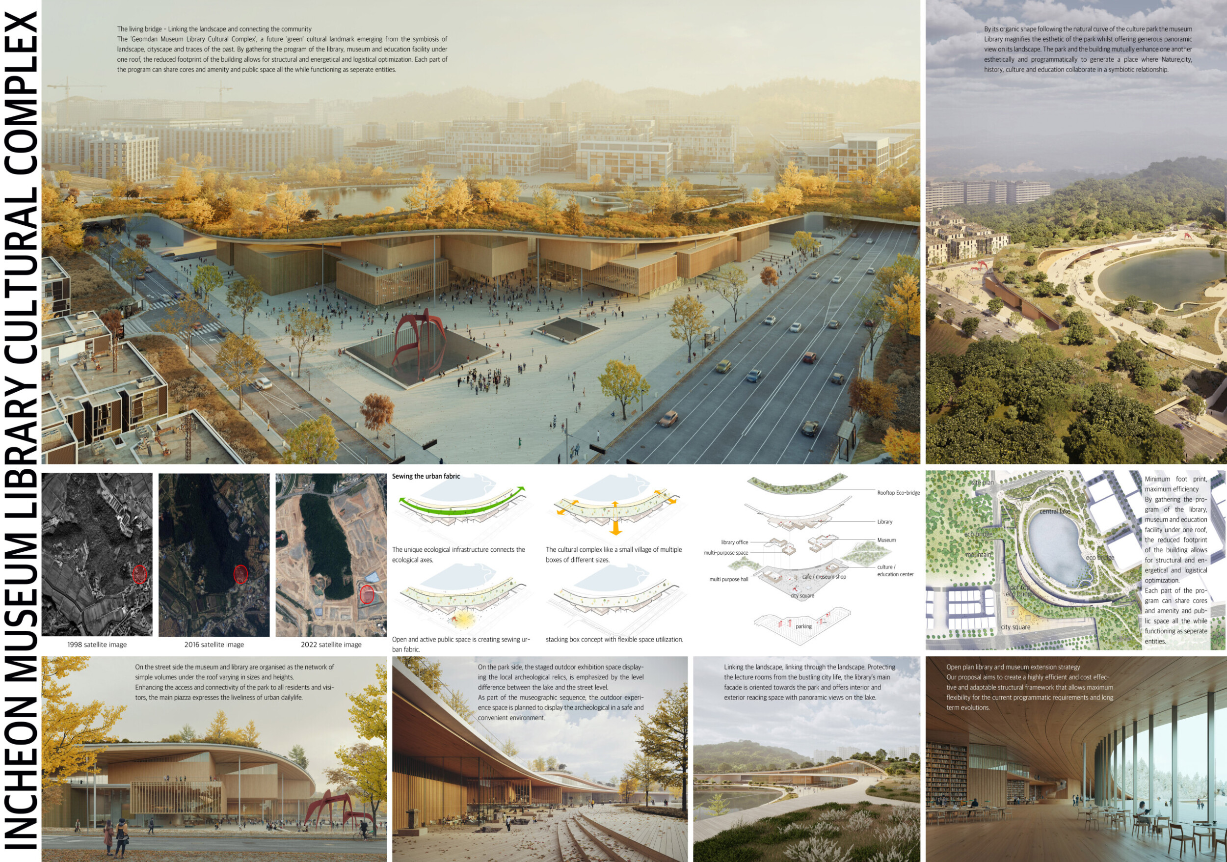 The Incheon Museum Library Cultural Complex integrates a museum, library, and education facility into a unified landmark, merging landscape, ecology, and urban fabric. Designed with a flexible "village" concept of interconnected volumes, the structure minimizes its footprint while creating open public spaces and dynamic connections to the adjacent cultural park. The design prioritizes sustainability through ecological infrastructure, outdoor exhibition spaces, and green terraces that link interior functions with the surrounding landscape. The main plaza fosters community interaction, while the curved architectural form follows the natural topography, blending history, culture, and education into a cohesive and vibrant urban environment.