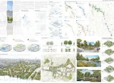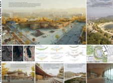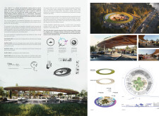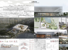 LAPUTA integrates a museum, library, archive, and cultural spaces into a cohesive complex, bridging urban life and natural landscapes. Located beside a lakeside park, the design fosters organic connections through a floating deck that breathes with its environment. The structure emphasizes spatial differentiation, providing distinct areas for exhibitions, study, events, and public interaction. A layered architectural strategy interweaves indoor and outdoor experiences, while an open central void promotes visual and physical connectivity. The project balances functionality and natural integration, serving as a dynamic cultural hub that encourages community engagement, learning, and immersion in nature.