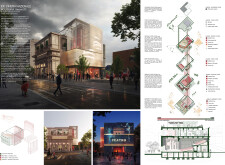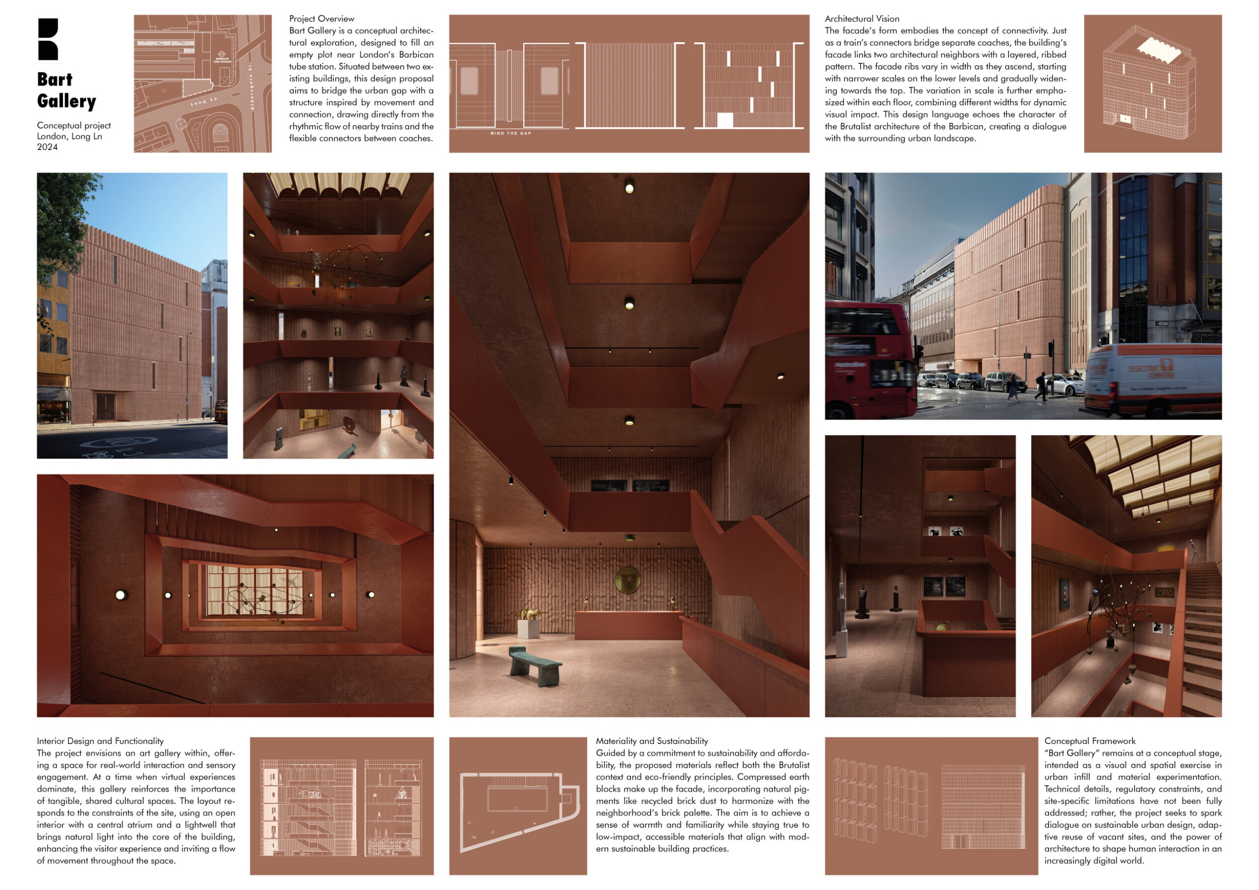Bart Gallery is a conceptual art gallery designed to fill an urban gap near London’s Barbican, drawing inspiration from movement and connectivity. The facade reflects the rhythmic motion of nearby trains, featuring layered, ribbed patterns that ascend with dynamic variation. The interior includes a central atrium with an open layout and skylight, enhancing natural light and encouraging fluid circulation. Constructed with compressed earth blocks and recycled brick, the design emphasizes sustainability while harmonizing with the Brutalist context. Combining tactile materials with modern solutions, the gallery fosters real-world interaction and sensory engagement, addressing the importance of human connection in an increasingly digital world.