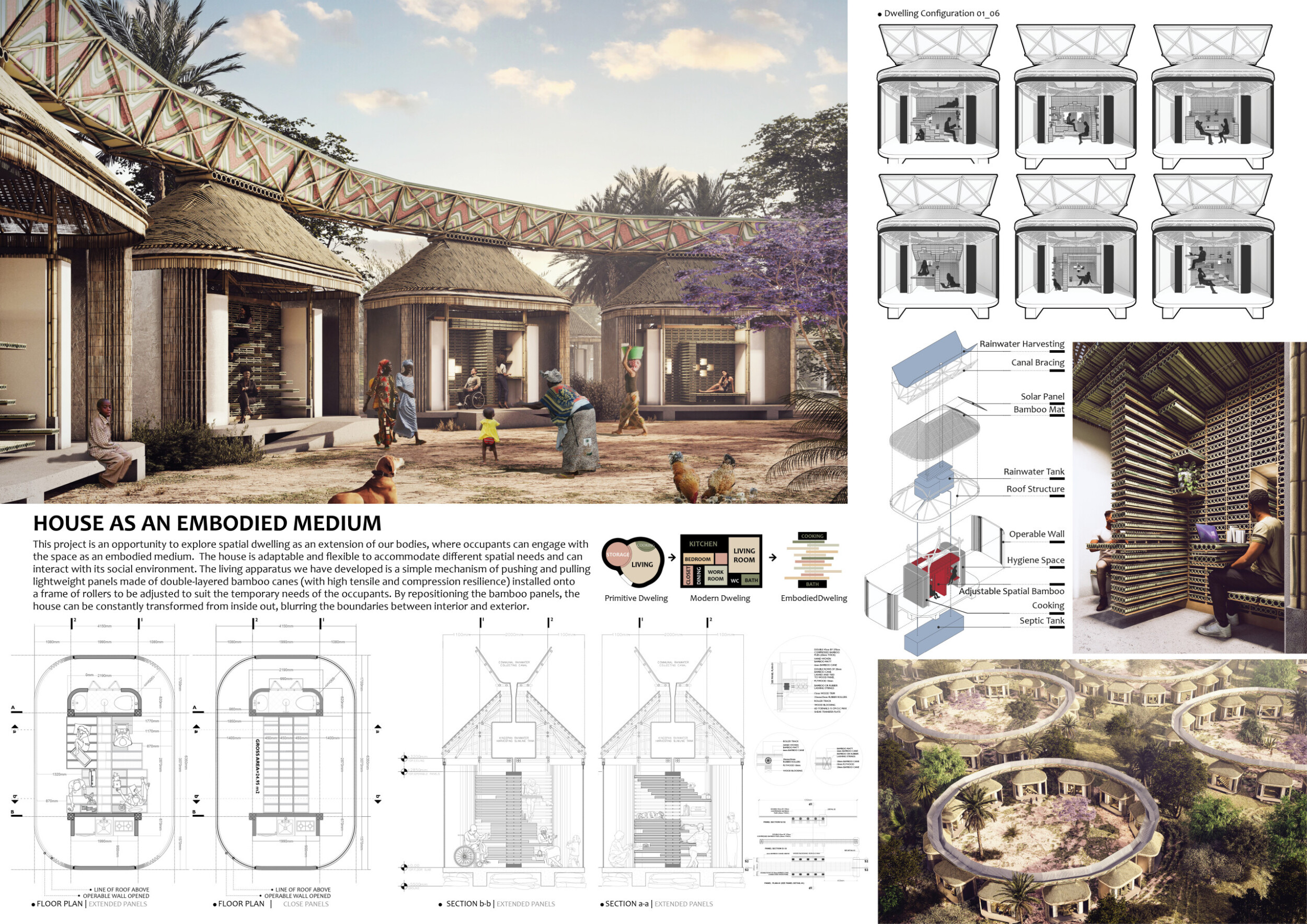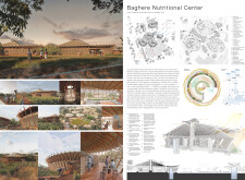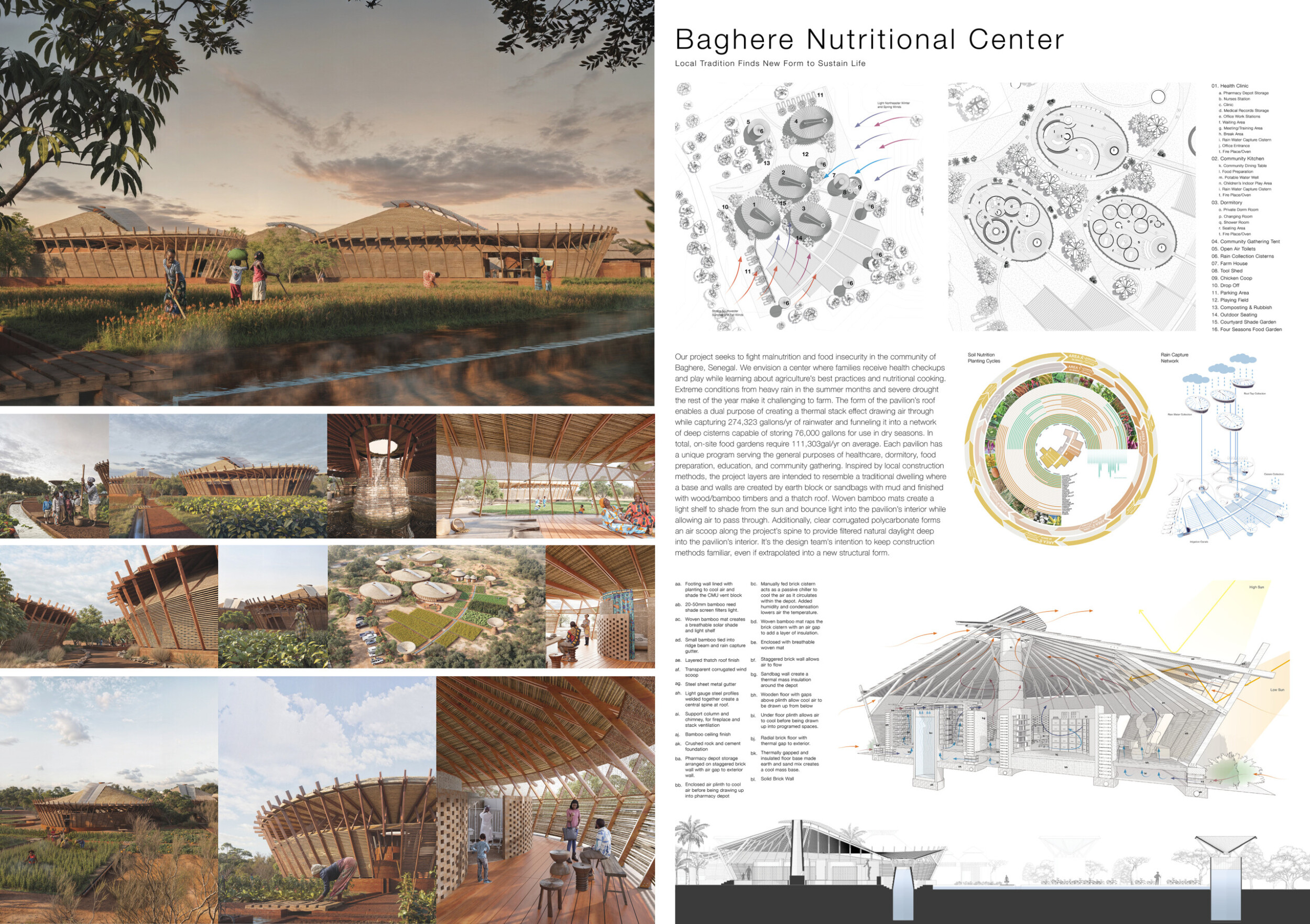 The Baghere Nutritional Center in Senegal addresses malnutrition and food insecurity by integrating health, education, and agriculture. Designed as a community hub, it promotes local agriculture, food preparation practices, and nutritional education. The center features a rainwater harvesting system capable of collecting 77,000 gallons annually, ensuring water access during dry seasons. Inspired by traditional building methods, the structure utilizes local materials, such as bamboo and earth blocks, for construction, providing thermal comfort and natural ventilation. The circular, open design maximizes daylight and airflow while fostering a connection to the landscape. This sustainable, community-driven project merges modern needs with cultural familiarity.