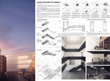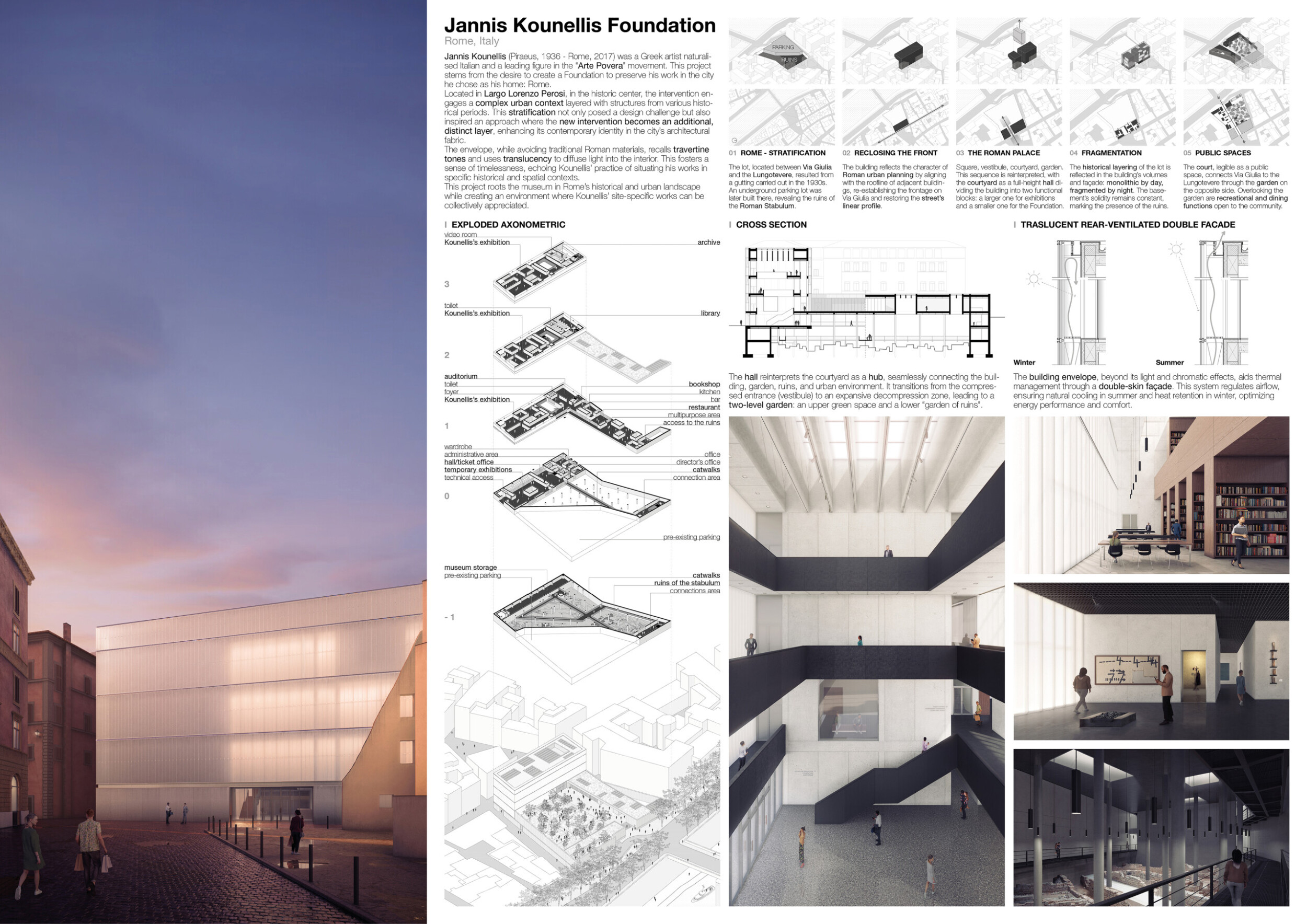 The Jannis Kounellis Foundation transforms a historic Roman site into a contemporary art and cultural hub, honoring the artist’s legacy. Located in Largo Lorenzo Perosi, the project integrates a translucent rear-ventilated double facade, balancing thermal performance and diffused light. The design layers historical and modern architecture, featuring exhibition spaces, an auditorium, library, and a central courtyard serving as a hub for public engagement. The “garden of ruins” reconnects visitors to the Roman heritage, creating a dynamic dialogue between art, history, and urban space. The project respects traditional Roman materials while introducing modern spatial solutions, fostering a collective and immersive cultural experience.