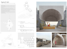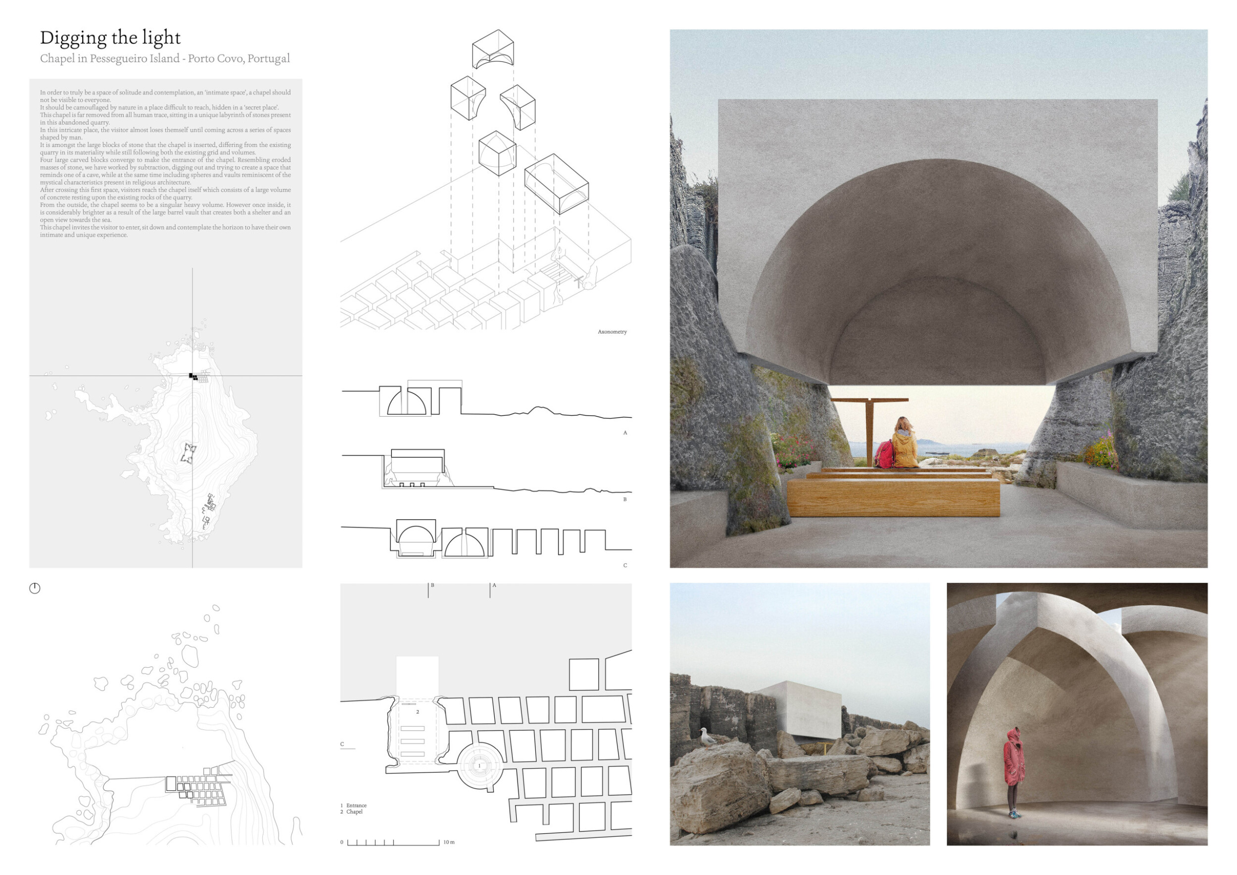 The Digging the Light chapel is a contemplative space carved into the rugged landscape of Pessegueiro Island. Inspired by themes of meditation and minimalism, the design embeds a geometric volume into the terrain, featuring large vaulted openings that frame views of the sea and sky. Natural light enters through carefully positioned apertures, creating a dynamic interplay of light and shadow. The structure integrates modular construction, combining modern precision with the raw, timeless texture of its surroundings. This intimate space invites visitors to pause, reflect, and connect with the landscape, offering a serene retreat that balances spirituality with architectural simplicity.