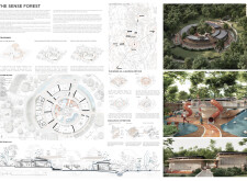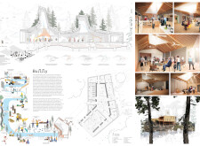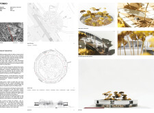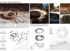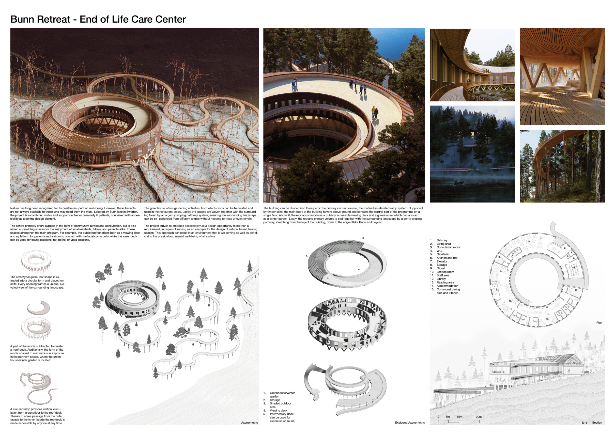 The Bunn Retreat is a serene end-of-life care center designed to foster comfort, dignity, and connection to nature. The circular structure serves as the heart of the center, offering communal spaces, therapy rooms, and private accommodations. A gently sloping elevated ramp winds through the surrounding forest, promoting accessibility and creating immersive experiences with nature. The roof features a greenhouse and water garden, supporting therapeutic gardening activities for patients and visitors. The design integrates natural materials and emphasizes harmony with the landscape, providing spaces for reflection, community, and healing while enhancing both physical and mental well-being.