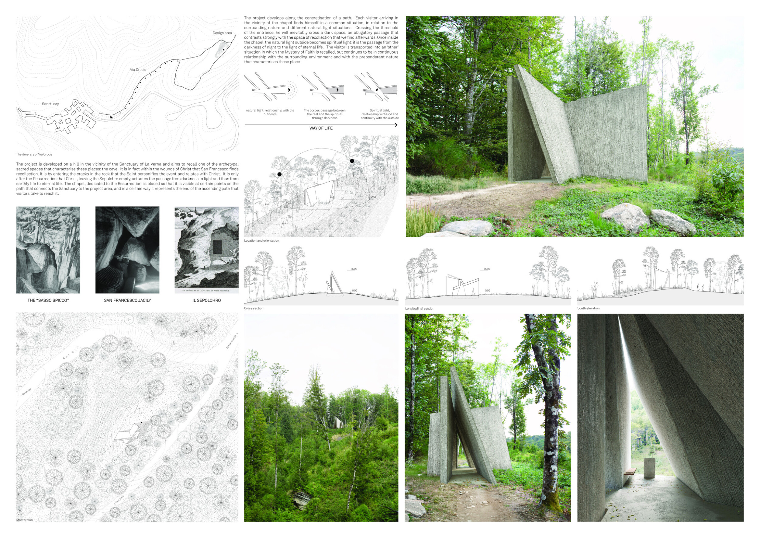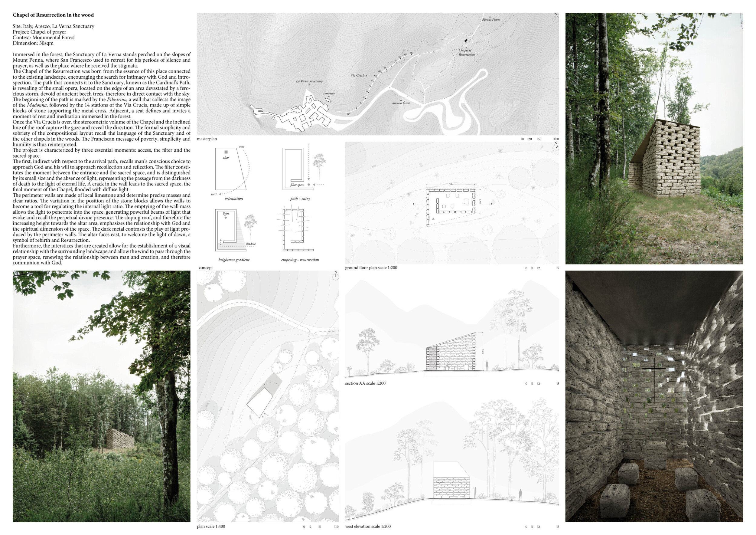 The Chapel of Resurrection, located within the Sanctuary of La Verna, merges spirituality with the natural landscape of the Montepenna Forest. Built from local limestone blocks, the chapel echoes Franciscan simplicity, emphasizing themes of death, life, and resurrection. Its rectangular form features a single crack in the stone wall, guiding light toward a cross, symbolizing the transition from darkness to divine presence. The chapel's minimal design fosters meditation and introspection, with its openings allowing light, wind, and the surrounding forest to permeate the sacred space. The stone material and earth-focused palette reinforce harmony between architecture, creation, and spiritual contemplation.