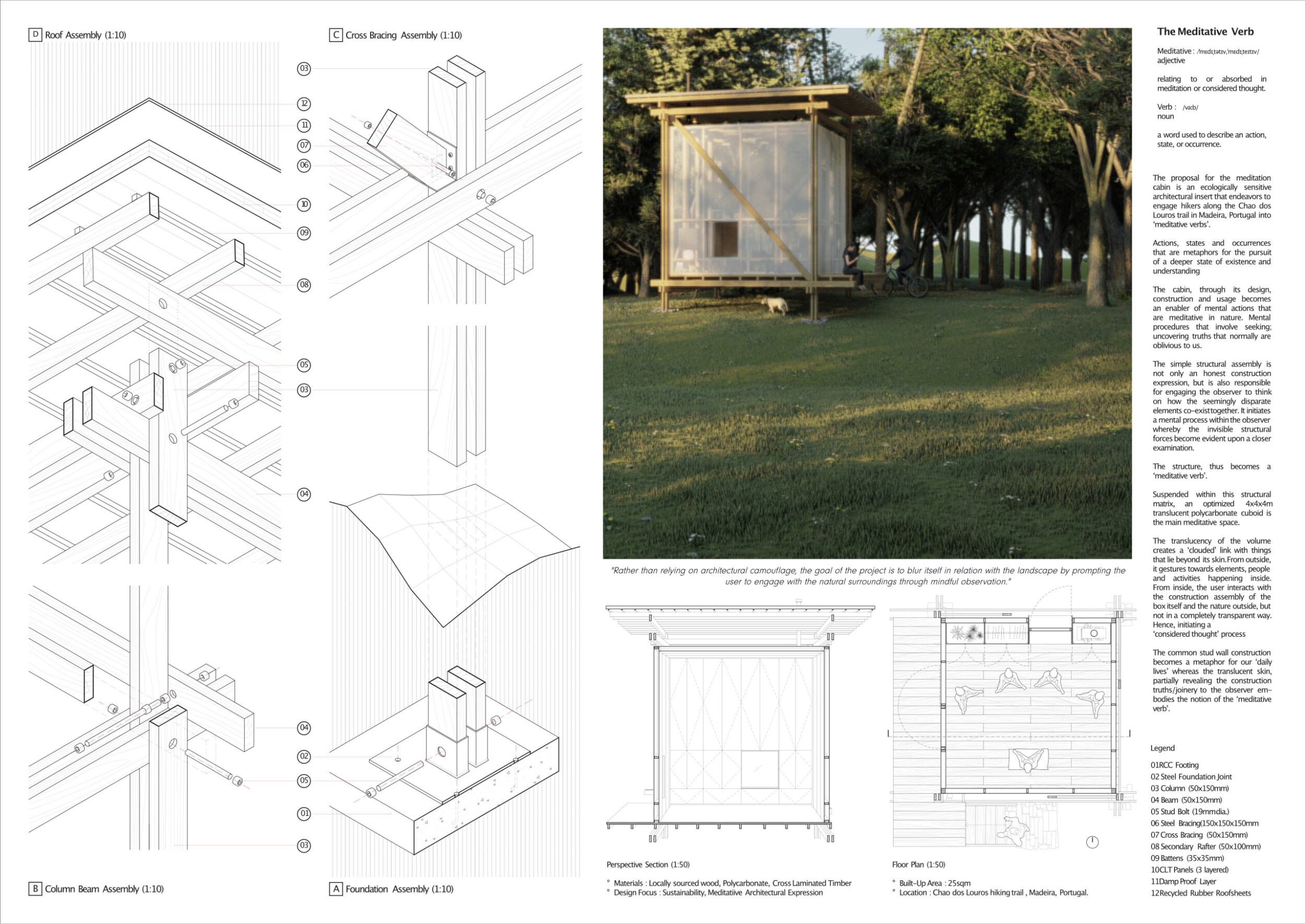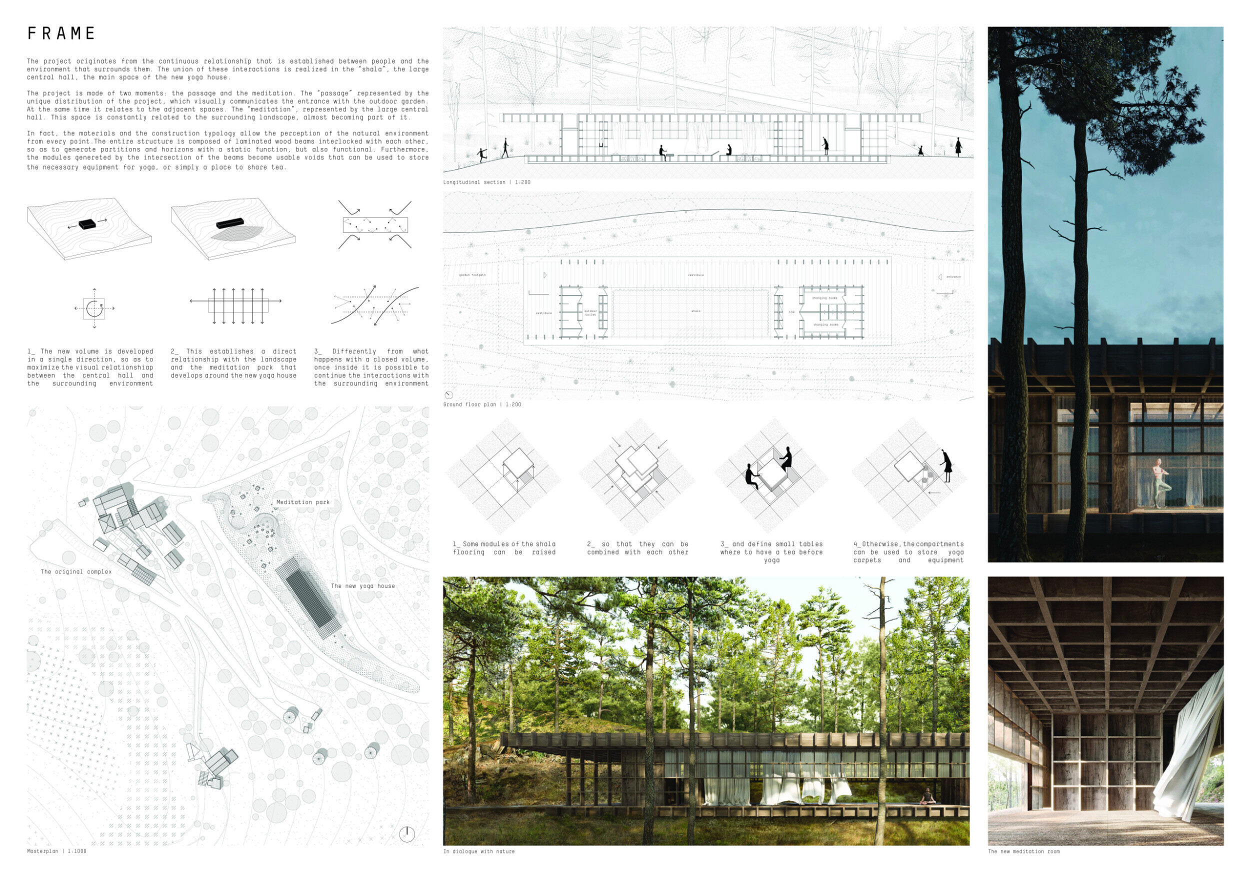 The Frame project explores the relationship between people and their environment, creating a meditative space integrated with nature. Designed as an open, permeable structure, it establishes a direct dialogue with the landscape. The modular grid system generates flexible spaces where raised flooring panels can serve multiple purposes—creating seating, storage, or small tables. The lightweight timber construction blends seamlessly with its surroundings, minimizing environmental impact while enhancing visual connection. The building’s transparent facade allows light and air to flow through, fostering tranquility and contemplation. This design harmonizes form and function, offering a serene retreat that encourages connection with nature.