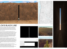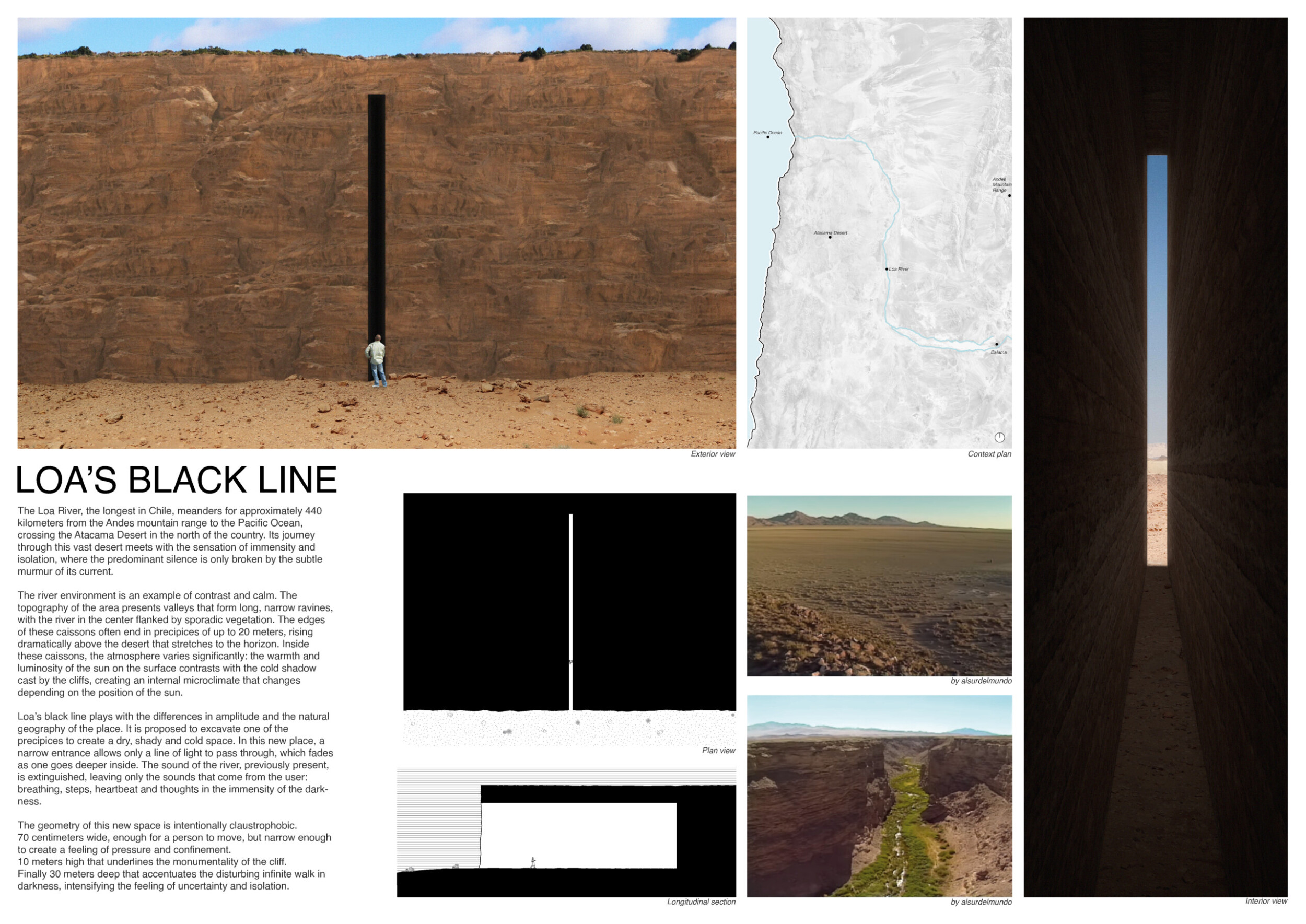 Loa’s Black Line is a spatial intervention along the Loa River, the longest in Chile, spanning 440 kilometers from the Andes to the Pacific Ocean. Set in the Atacama Desert, the project engages the immense isolation and contrast of the environment, creating a contemplative space within a natural ravine. A narrow, 70 cm-wide incision is cut into a cliff face, leading visitors 30 meters deep into a shadowed void. The space plays with light, sound, and scale, intensifying contrasts between the sunlit desert and the cold, dark interior. This spatial experience emphasizes isolation, amplifies silence, and explores human perception within vast landscapes.