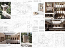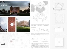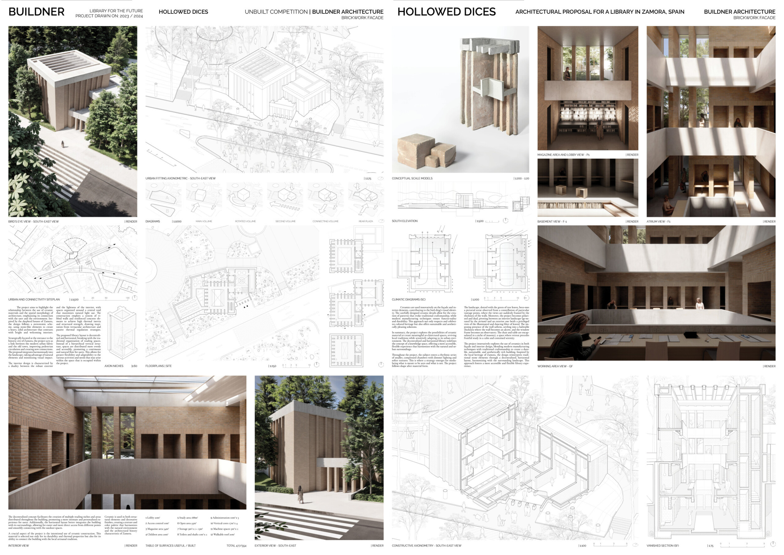The project reimagines a library as a spatially dynamic structure, blending solid and void through a modular brickwork facade. The design integrates with the urban fabric, creating a central volume with interconnected hollow spaces for light penetration and spatial flow. The library’s program includes reading areas, archives, and flexible spaces, distributed around a central atrium to enhance user interaction and visual connectivity. Conceptually derived from hollowed dice forms, the design emphasizes natural lighting, material simplicity, and spatial hierarchy. The proposal balances modern architectural language with functional clarity, providing a serene and engaging environment for learning and collaboration.
