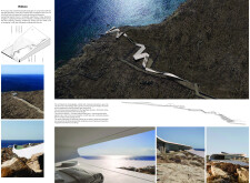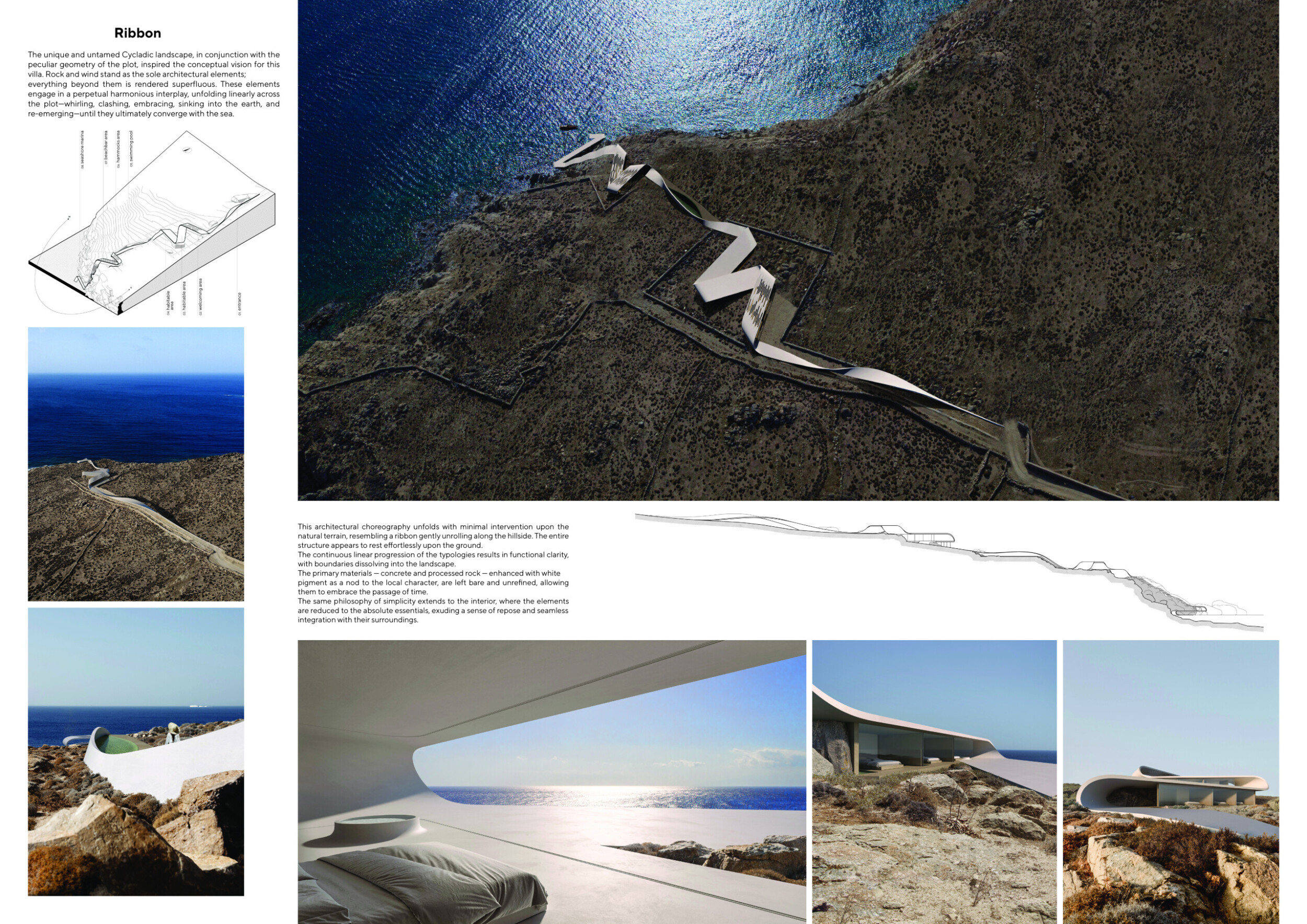 The Ribbon project integrates seamlessly into the untouched Cycladic landscape, resembling a ribbon-like form that unfolds along the natural terrain before converging with the sea. Designed with minimal intervention, the structure follows the hillside’s contours, creating a fluid architectural progression that blends into the environment. Materials like concrete and processed rock, enhanced with white pigments, mirror the site's rugged character while embracing the simplicity of local textures. The interior reduces elements to the absolute essentials, providing functional clarity and a sense of repose. This linear design balances natural integration and architectural elegance, reflecting harmony between form, land, and sea.