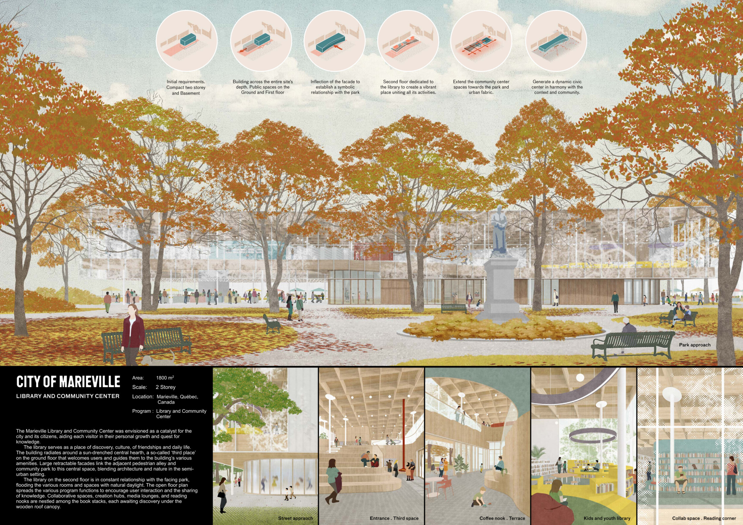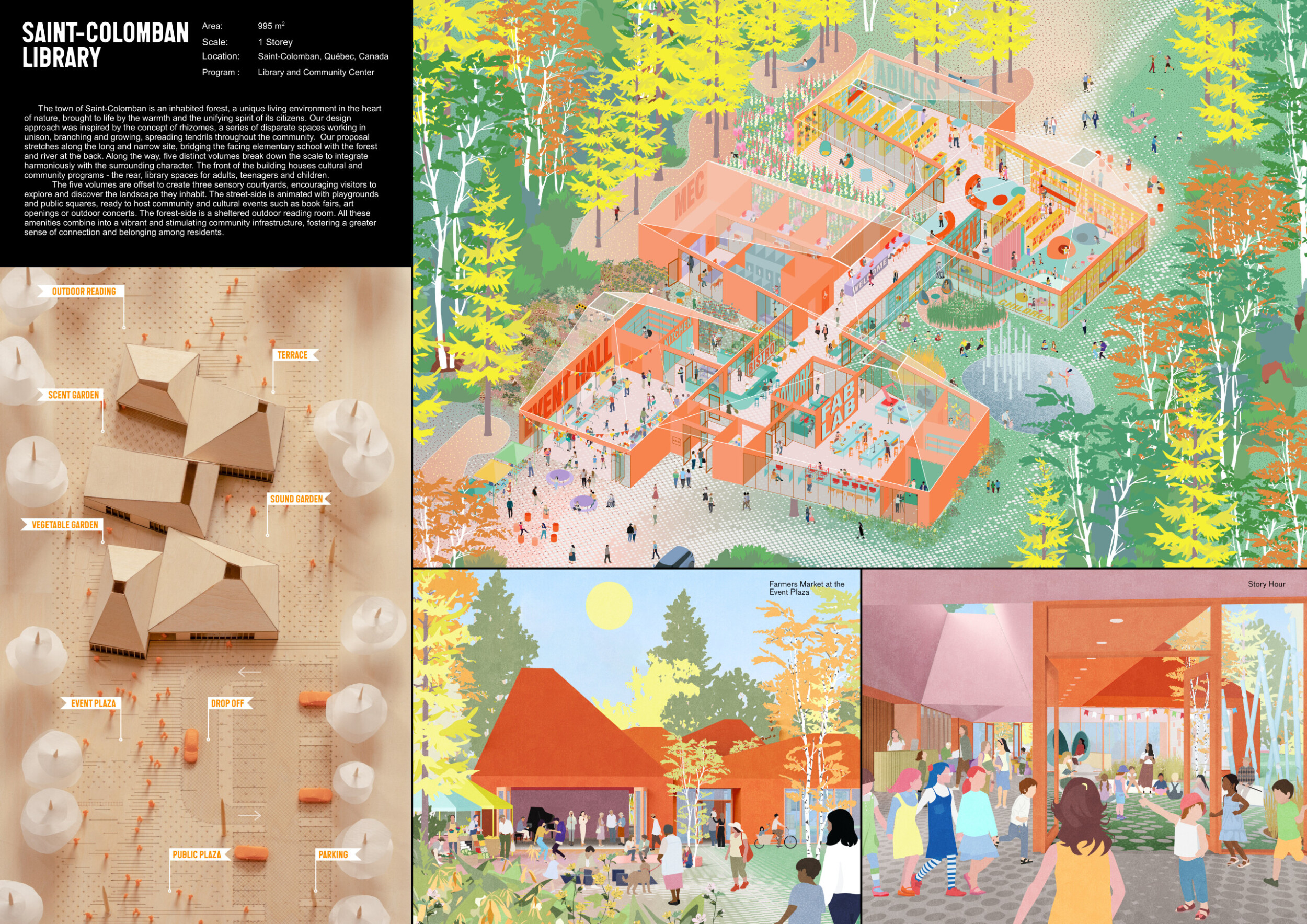 Unique colorful images and a clear architectural strategy. -Michael Meredith The drawings of Saint Colomban exude great energy and a strong sense of community. The seamless connection between the interior and exterior spaces creates a welcoming environment for people of all ages.