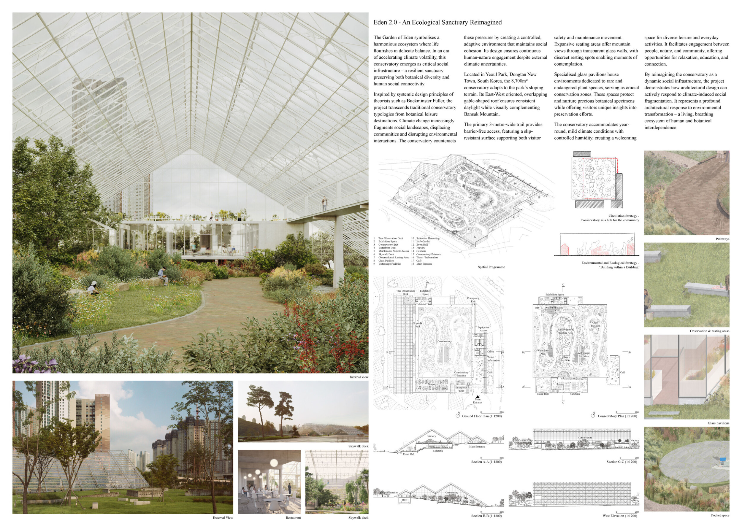 Eden 2.0 is a 3.4-hectare ecological conservatory in Yeoul Park, Dongtan, South Korea. Designed as critical social infrastructure, it preserves ecological diversity while fostering human-nature interaction. Its East-West oriented, overlapping gabled roofs optimize light conditions, complementing the site's sloped terrain. Specialized glass pavilions house biodomes for rare and endangered plant species, supporting conservation and seed propagation. The controlled, adaptive environment ensures year-round usability, featuring pathways, observation areas, and seating. Eden 2.0 serves as a multi-functional space for leisure, education, and contemplation, addressing climate-driven social dislocation and enhancing community engagement within a resilient, human-botanical ecosystem.