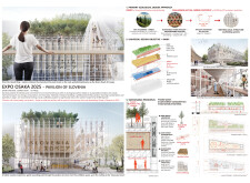 The Pavilion of Slovenia emphasizes sustainability, reflecting the country’s identity and environmental commitment. Designed with zero waste, low energy consumption, and minimal transport, the pavilion avoids prefabricated timber by utilizing a rented local scaffolding system, reducing carbon emissions by 87,600 kg CO₂. The structure features a universal ramp leading visitors through multifunctional spaces, an exhibition area, and a rooftop “Slovenian forest,” symbolizing Slovenia as the Green Heart of Europe. Prioritizing sustainable principles, the design integrates a zero-waste landscape, temporary tree nursery, and low-carbon materials, creating an immersive outdoor experience while promoting ecological responsibility and efficient resource use.