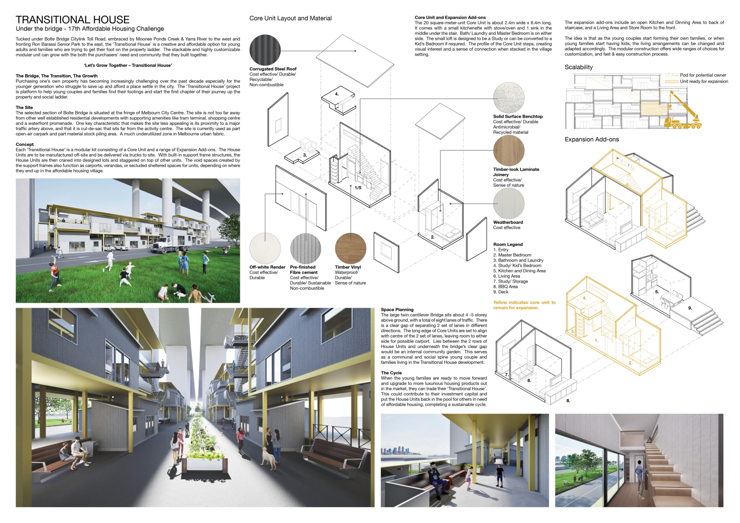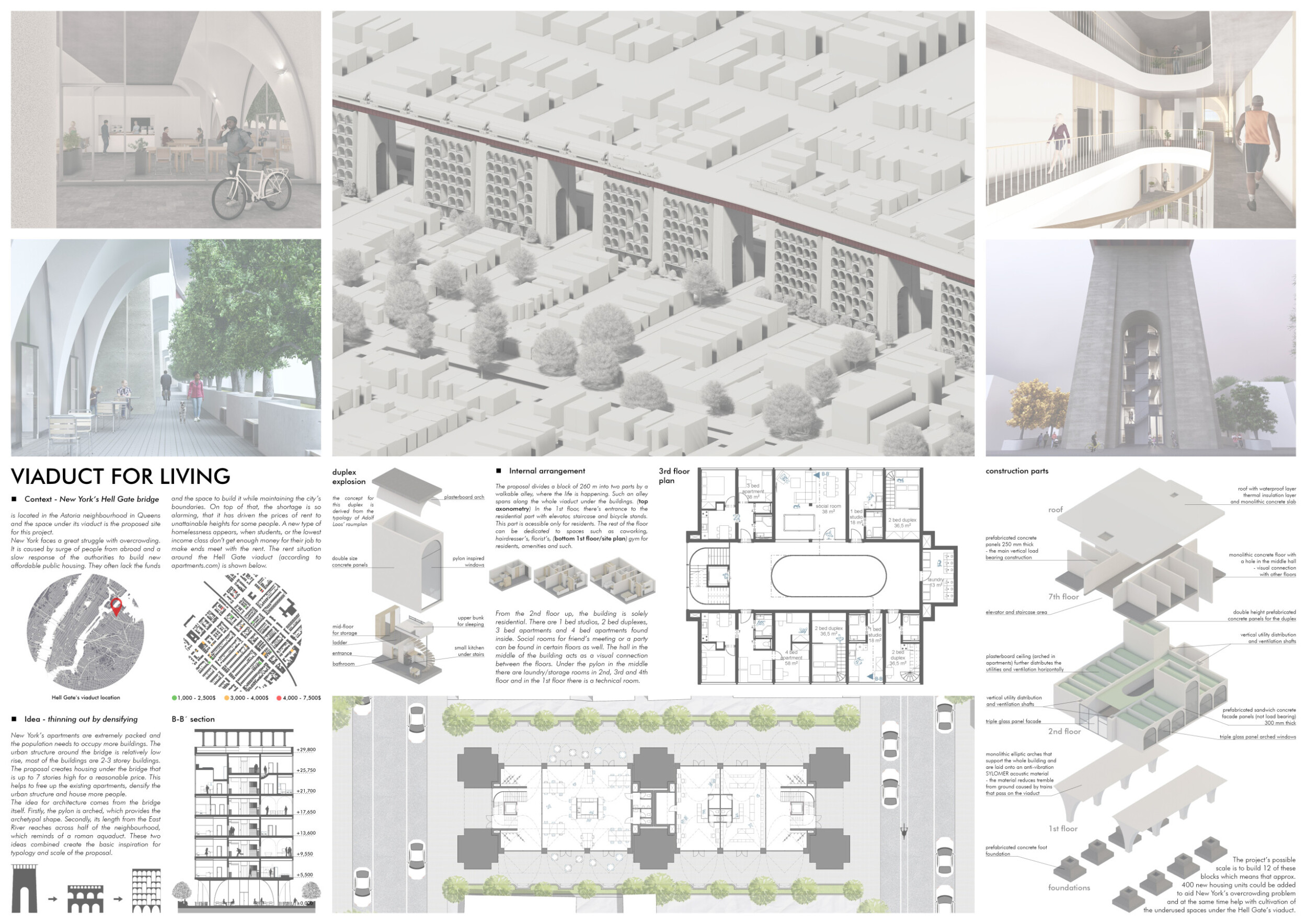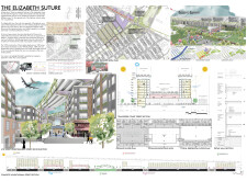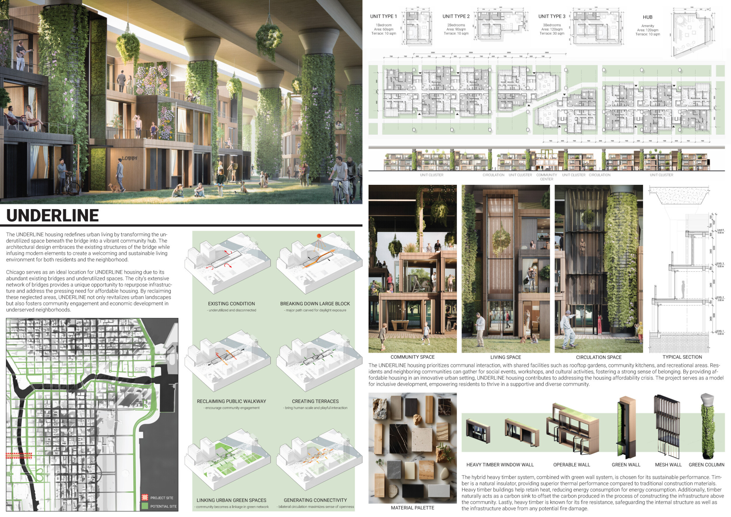 The panel is well curated, though could benefit from a few key improvements. The excellently rendered visuals, could be nehanced with the use of additional annotations to clearly highlight key design concepts for first-time viewers. The text is lengthy for a single panel, reducing readability. Read more It would be advantageous to abridge and reorganize the text to align more closely with the corresponding drawings, ensuring more streamlined communication. This realignment would enhance clarity and strengthen the overall narrative. The plan drawing is rather repetative and would benefit from from being trimmed with the addition of an enlarged typical unit plan to introduce various scales and more clearly communicate the spatial experience.
