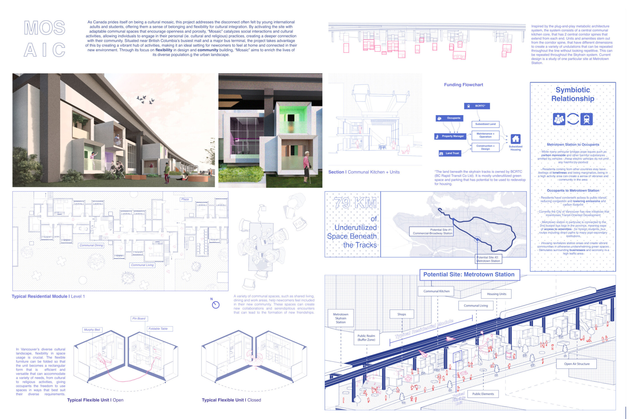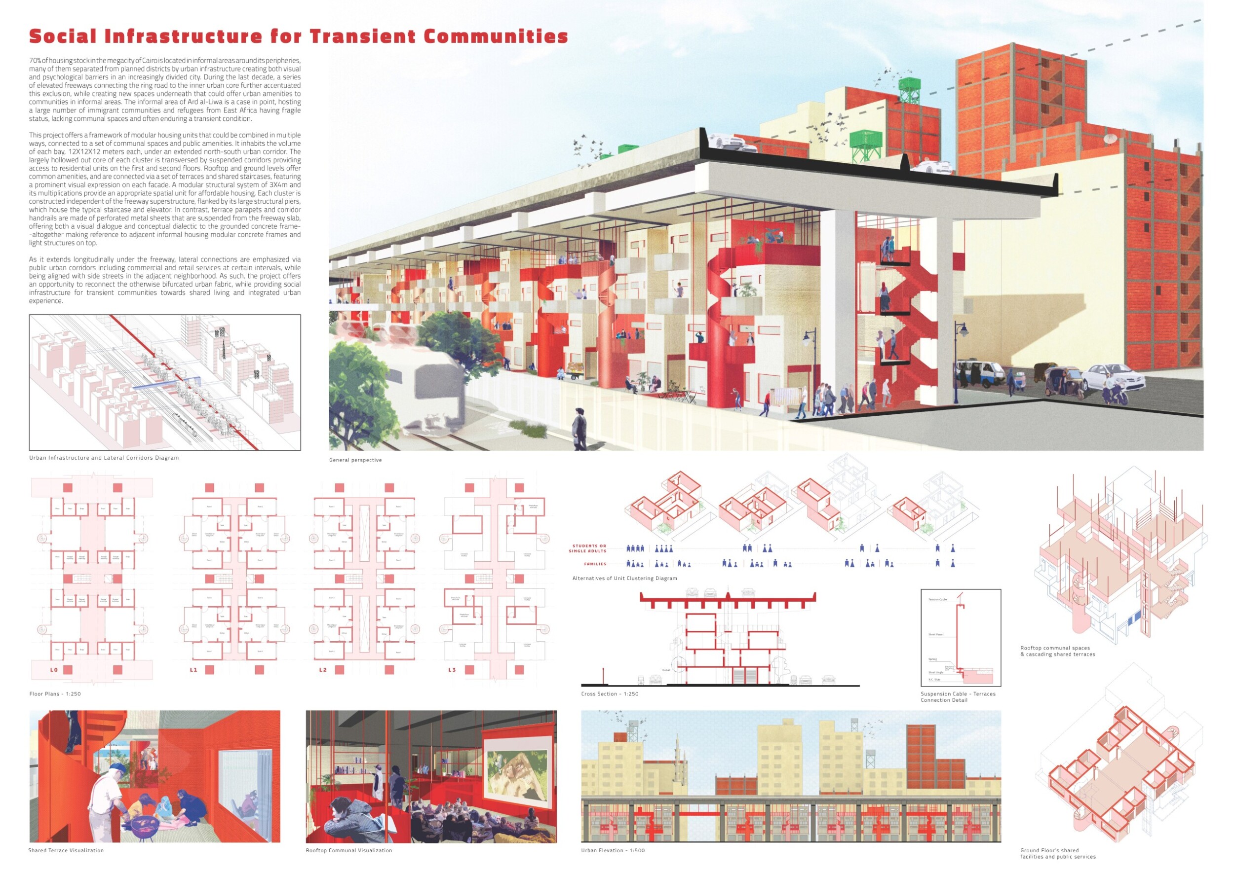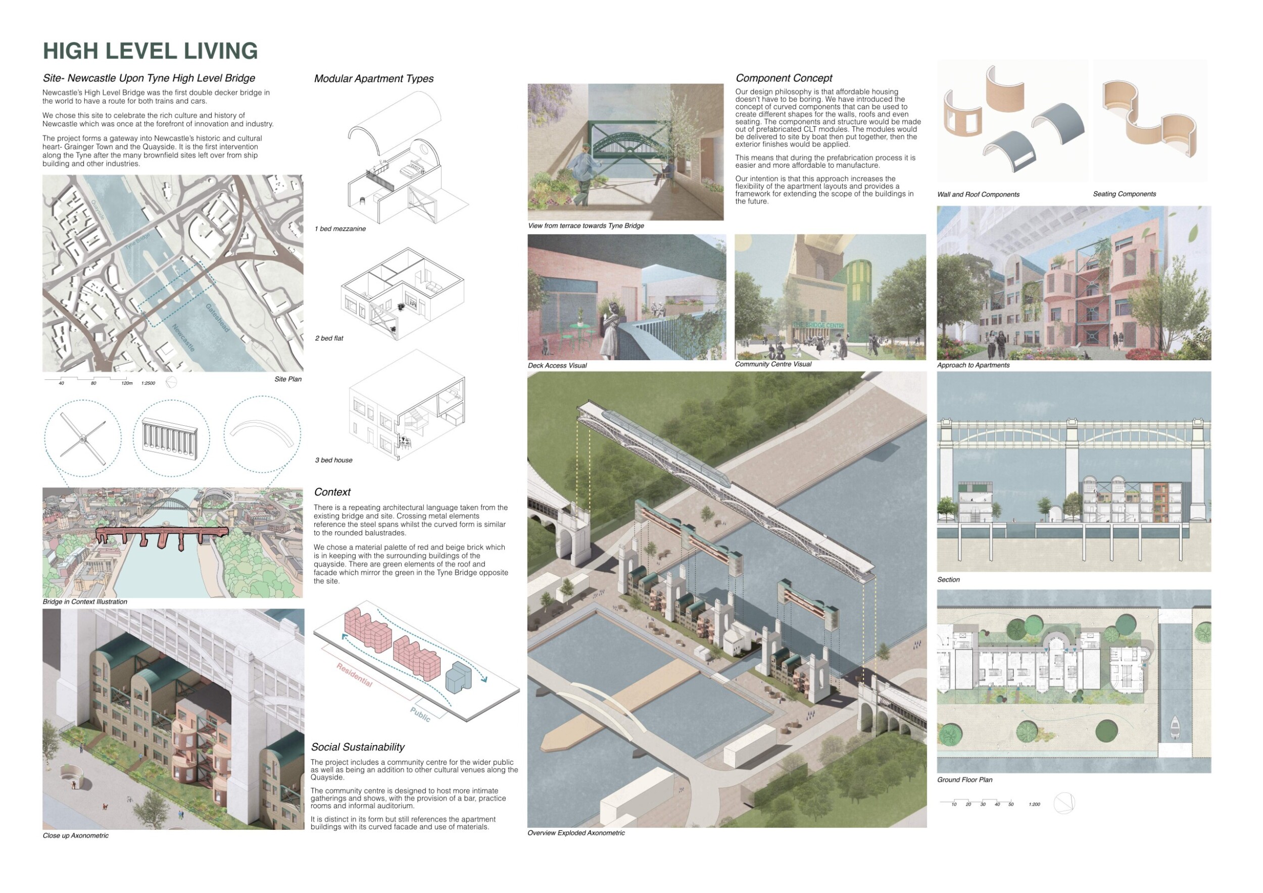 The panel is well curated, though could benefit from a few key improvements. The excellently rendered visuals, could be nehanced with the use of additional annotations to clearly highlight key design concepts for first-time viewers. The text is lengthy for a single panel, reducing readability. Read more It would be advantageous to abridge and reorganize the text to align more closely with the corresponding drawings, ensuring more streamlined communication. This realignment would enhance clarity and strengthen the overall narrative. The plan drawing is rather repetative and would benefit from from being trimmed with the addition of an enlarged typical unit plan to introduce various scales and more clearly communicate the spatial experience.