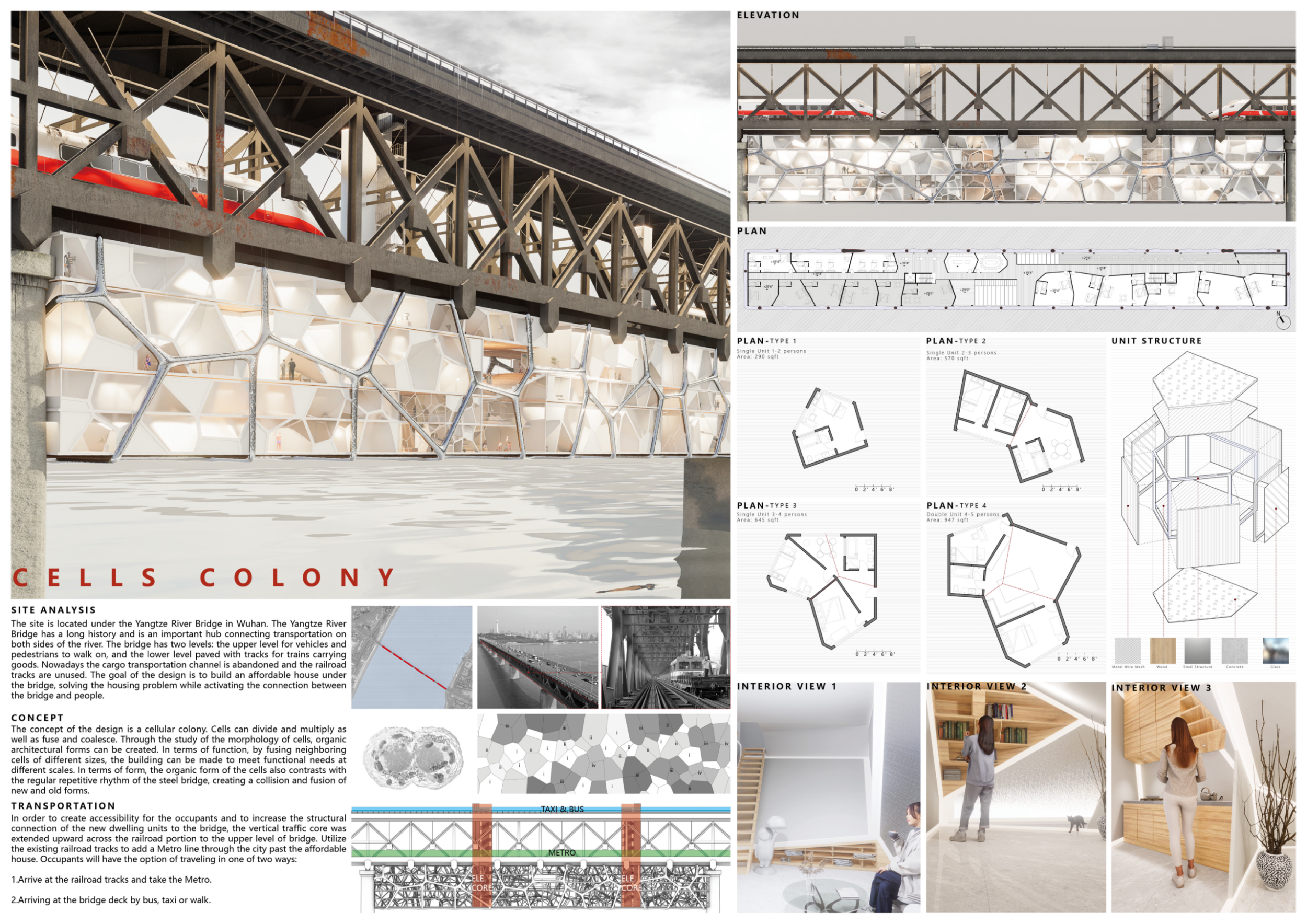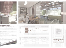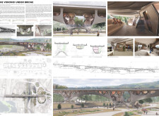 The proposal explores an interesting spatial solution, creating a honeycomb 3D network that challenges the concept of being "under the bridge" to becoming "within the bridge." It provides a geometric solution to create a landscape experience for the user.