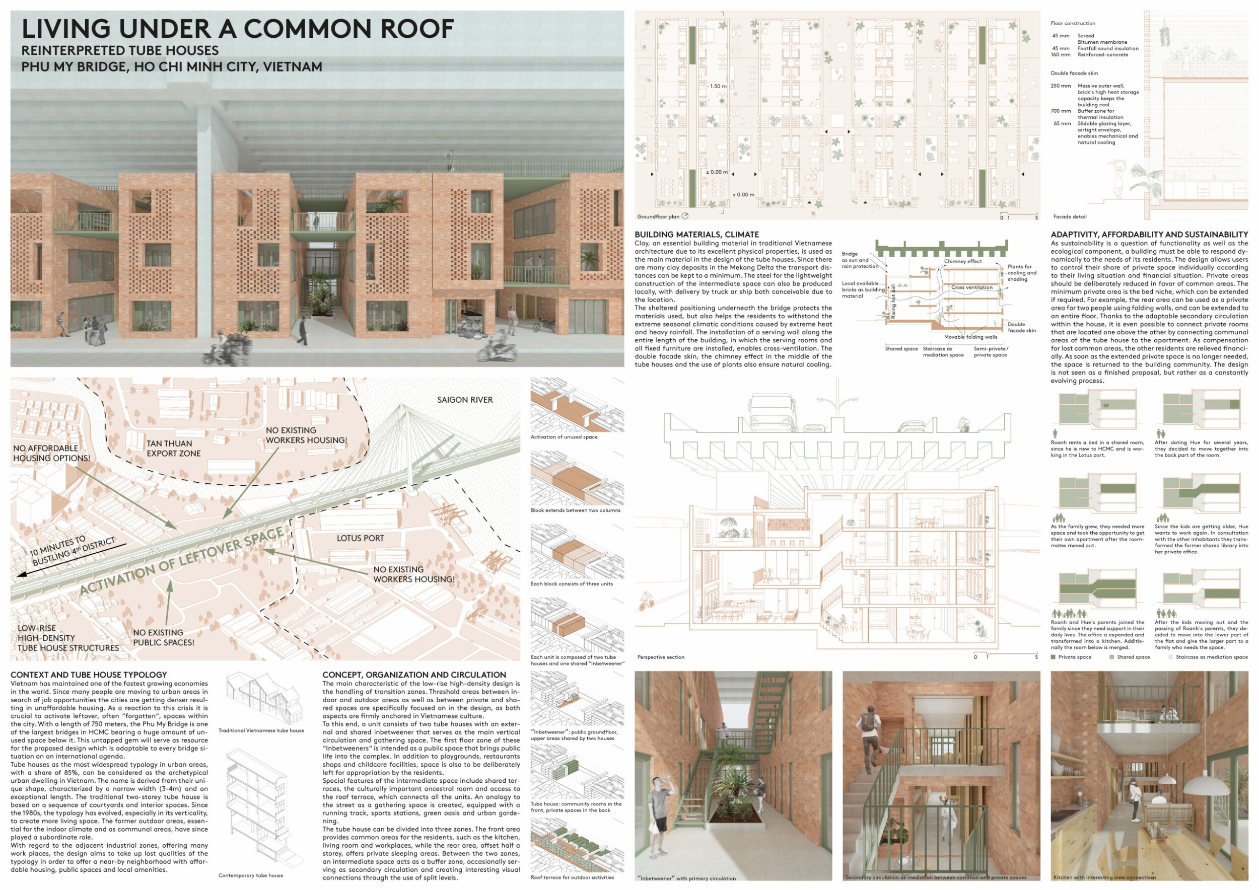 Clay, a key material in traditional Vietnamese architecture, is central to the tube houses in 'Living Under a Common Roof'. Locally sourced clay and steel minimize transport distances. Positioned under the bridge, the houses are protected from extreme weather. A serving wall and double facade ensure cross-ventilation and natural cooling. Adaptability, affordability, and sustainability are core principles. Read more The design dynamically responds to residents' needs, allowing adjustments to private and common spaces. Adaptable circulation connects vertical private rooms, with financial compensation for extended private areas. This evolving design addresses Vietnam's housing crisis by activating underutilized spaces like the 750-meter-long Phu My Bridge. The traditional tube house, narrow yet long, has evolved to create more vertical living space. This design revives communal and climate benefits, offering affordable housing near industrial zones. Emphasizing transition zones between indoor/outdoor and private/shared spaces, each unit comprises two tube houses and shared vertical circulation. Public areas like playgrounds, shops, and green spaces foster community and sustainability.