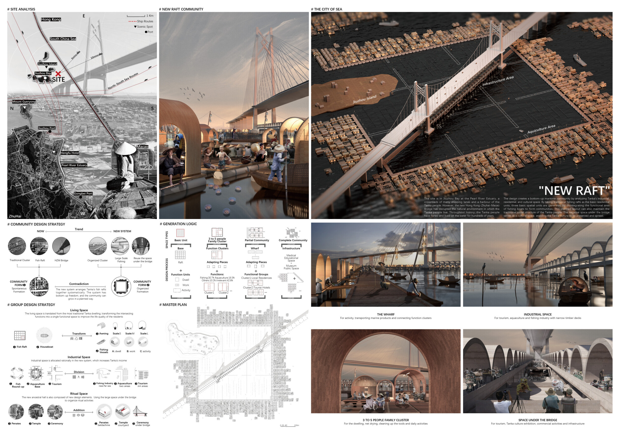 The selected site is in Jiuzhou Bay within the Pearl River Estuary, a crossroads with many shipping lanes and a harbor for the Tanka people. According to the authors, the new Hong Kong-Macau bridge has disrupted the natural environment of the Tanka community, who have fished and lived on the water here for centuries. The design aims to create a 'bottom-up' maritime community. Read more Three elemental units are created using the module of a typical Tanka fishing raft, with a layout meant to maintain the physical structure of existing communities. The negative space beneath the bridge is transformed into a cultural space.