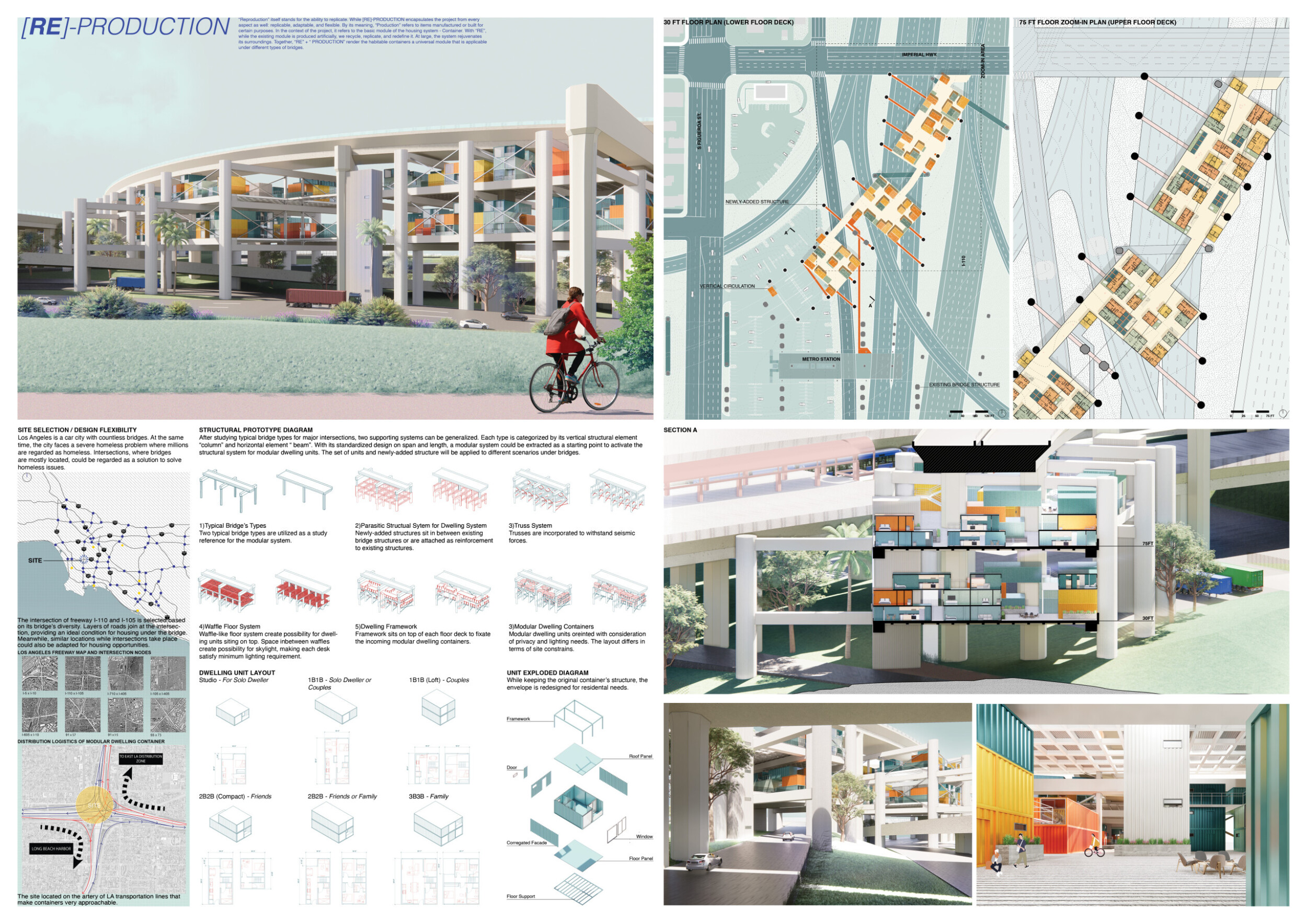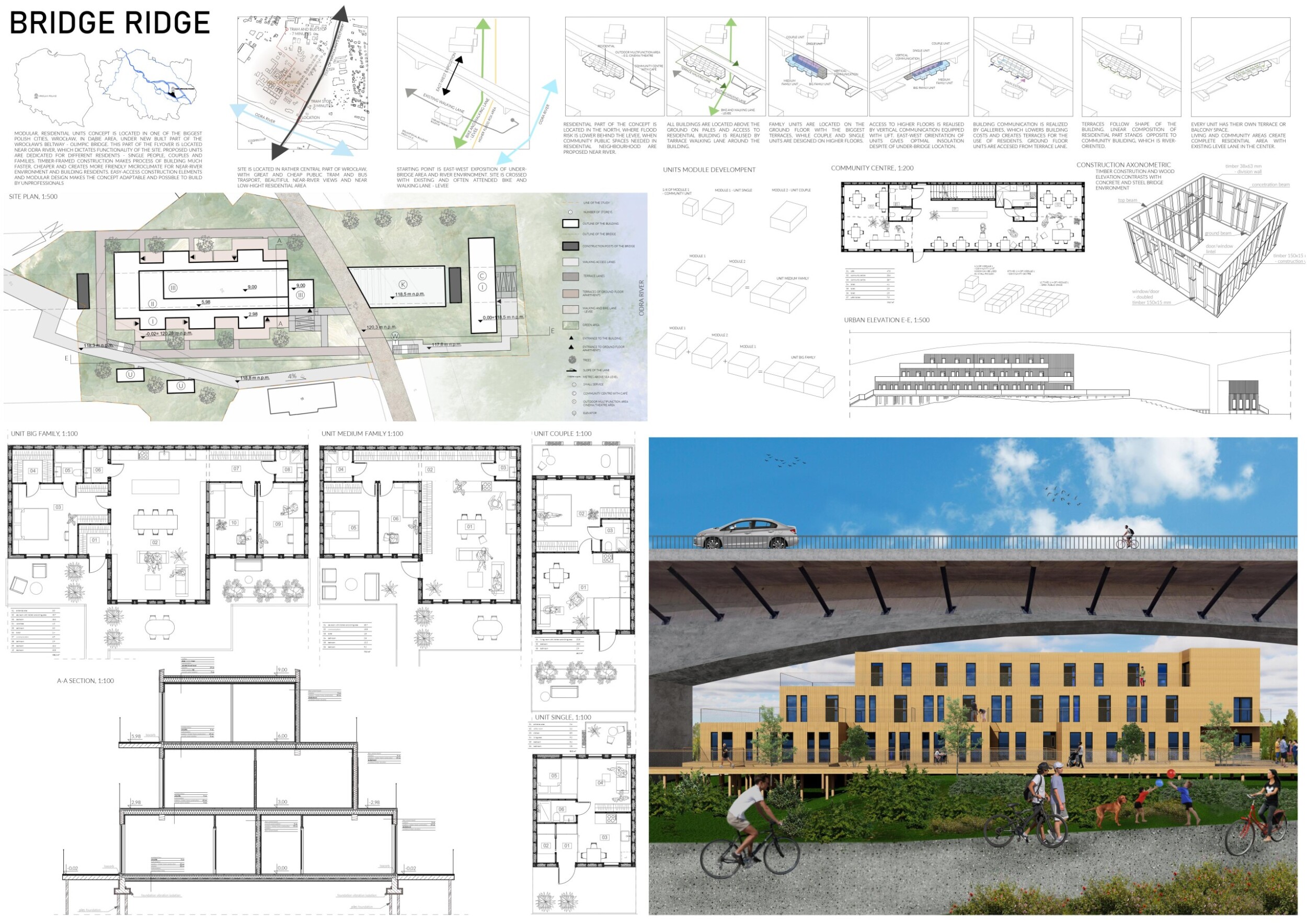 A bold proposal that pushes the idea of what "underbridge housing" can be. There is rich geometric potential in the modular system.