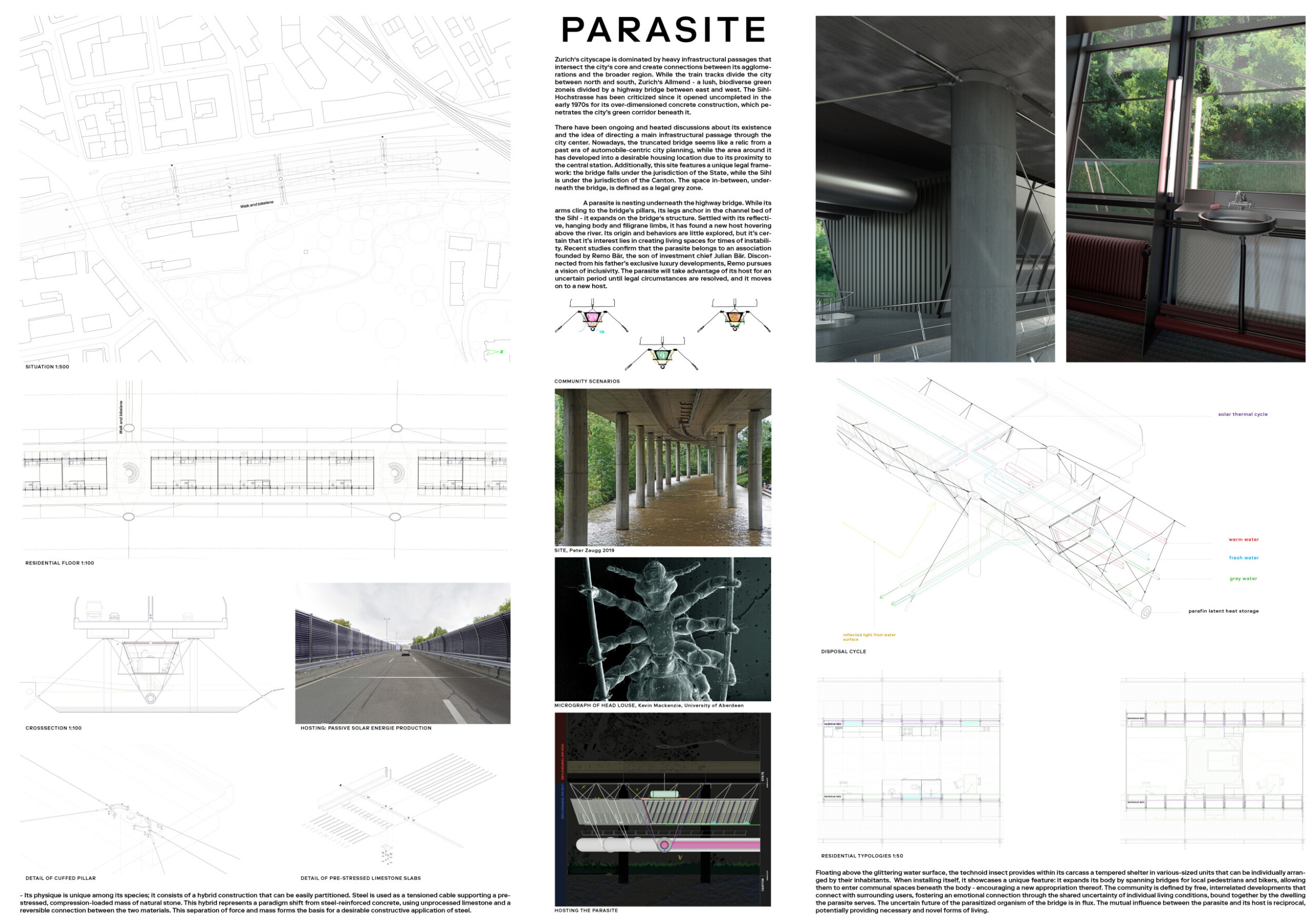 This single-panel architecture competition submission impresses with its clear hierarchy and unique, powerful visuals that vividly describe the design and its underlying story. The layout is expertly organized, guiding the viewer's eye effortlessly through the narrative. However, the text is quite small and could benefit from larger fonts, bold keywords, and subtitles for improved readability. Additionally, the numerous, well-drawn diagrams, while visually appealing, overwhelm the panel. Read more Reducing their number or combining them would enhance clarity and focus. Overall, the submission is exceptionally well-done, but slight adjustments in text presentation and diagram quantity would improve its ability to communicate the key concepts.