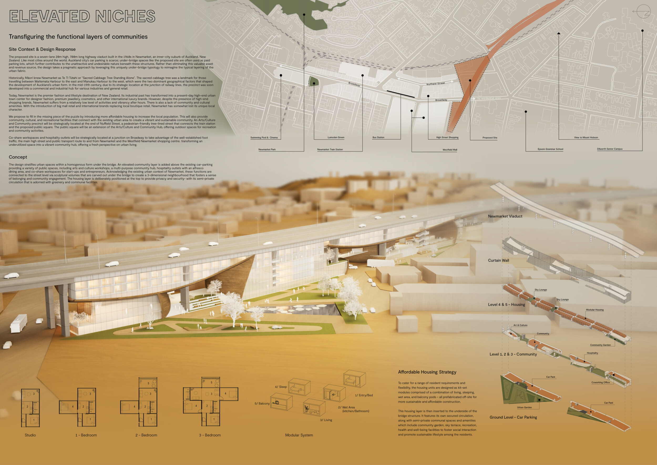 The Gardiner Expressway, once a symbol of futuristic 1960s urban planning, now divides downtown Toronto from Lake Ontario, creating polluted, unused spaces beneath it. As Toronto's population nears 7 million, the demand for affordable housing in the downtown core is immense. The HiveWay proposes to transform a 2 km stretch of the Gardiner, from Lower Jarvis Street to east of the Don Valley Parkway, into vibrant, affordable housing. Read more Utilizing the planned rerouting of this segment, the vision integrates housing directly with the infrastructure. Precast concrete box girders are designated for new stretches, offering faster, modular construction. The concept envisions housing cars within the girders' voids, leaving space above and below for residential units, mixed-use amenities, and green spaces. Hexagonal modules will host soundproof, insulated housing units, while ground and intermediate levels will offer community services, retail, and recreational areas. The HiveWay aims to convert a relic of outdated urban planning into a sustainable, integrated development, revitalizing Toronto's urban landscape.