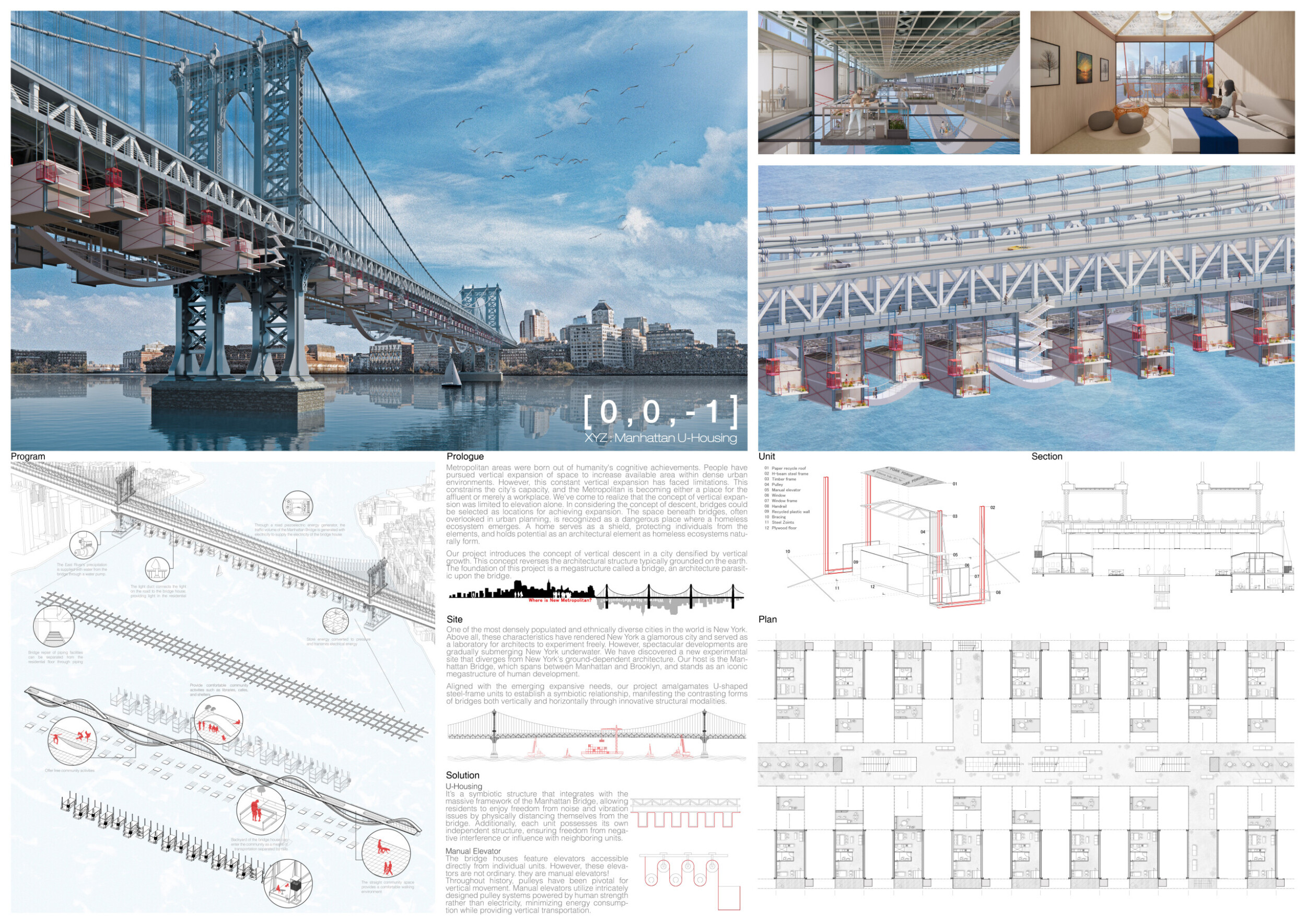 XYZ: Manhattan U-Housing reimagines urban expansion by utilizing the space beneath the Manhattan Bridge. The bridge is supplied with water from the East River and powers a piezoelectric generator through traffic. Light ducts connect streetlights to residential areas, which include libraries, cafes, and shelters. This project addresses urban density and social stratification by creating U-shaped steel-frame units that integrate with the bridge, providing noise and vibration isolation. Read more Each unit is independent, avoiding interference with neighbors, and features manual elevators powered by human strength, minimizing energy consumption while ensuring vertical mobility.