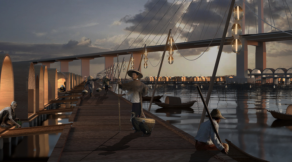 The 1st and Student Award went to Yujun Cai from China, National University of Singapore, for a design transforming Jiuzhou Bay beneath the Hong Kong-Macau bridge into a 'bottom-up' maritime community. This project uses three elemental units based on traditional Tanka fishing rafts, maintaining the physical structure of existing communities and transforming the negative space beneath the bridge into a cultural area.