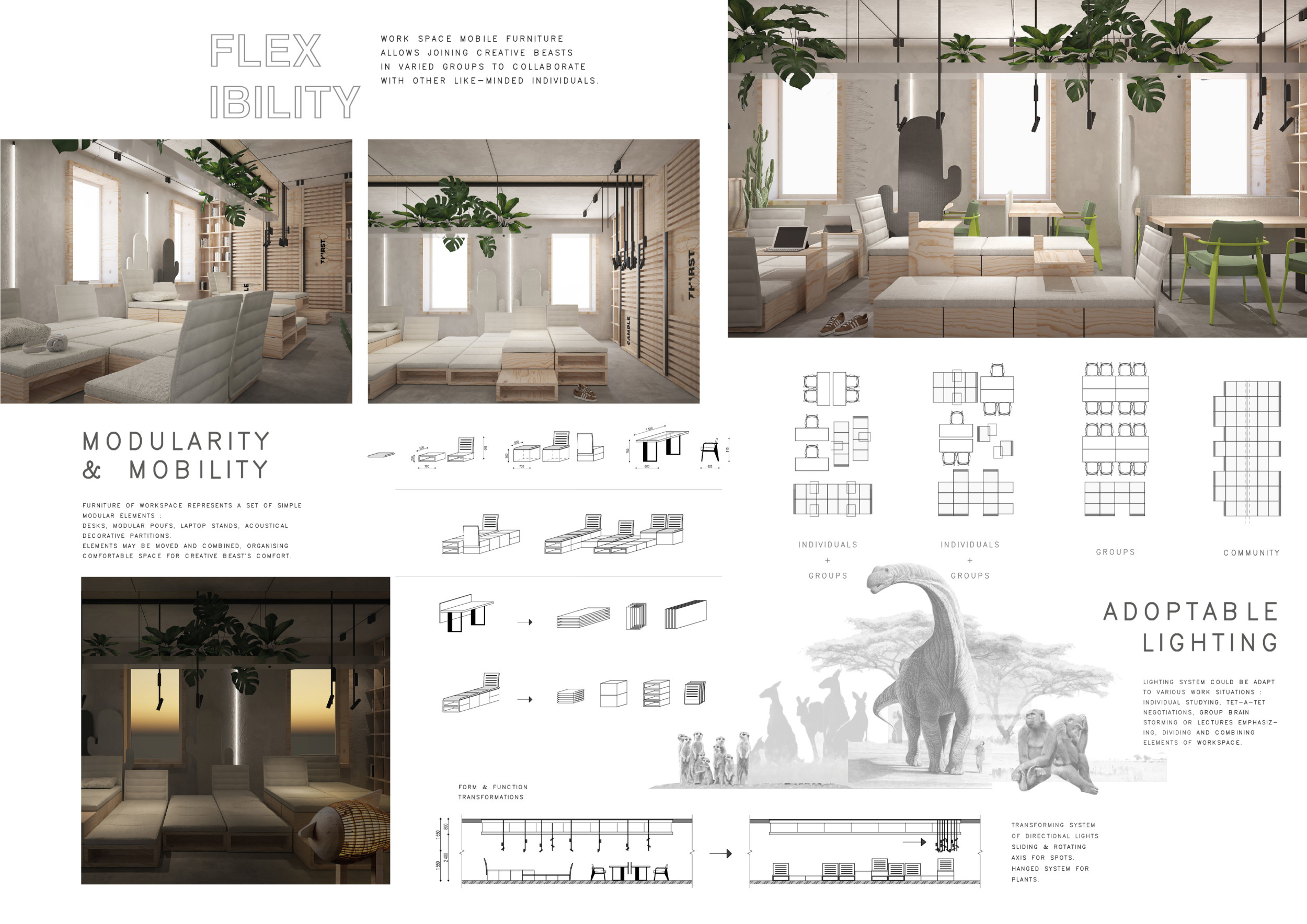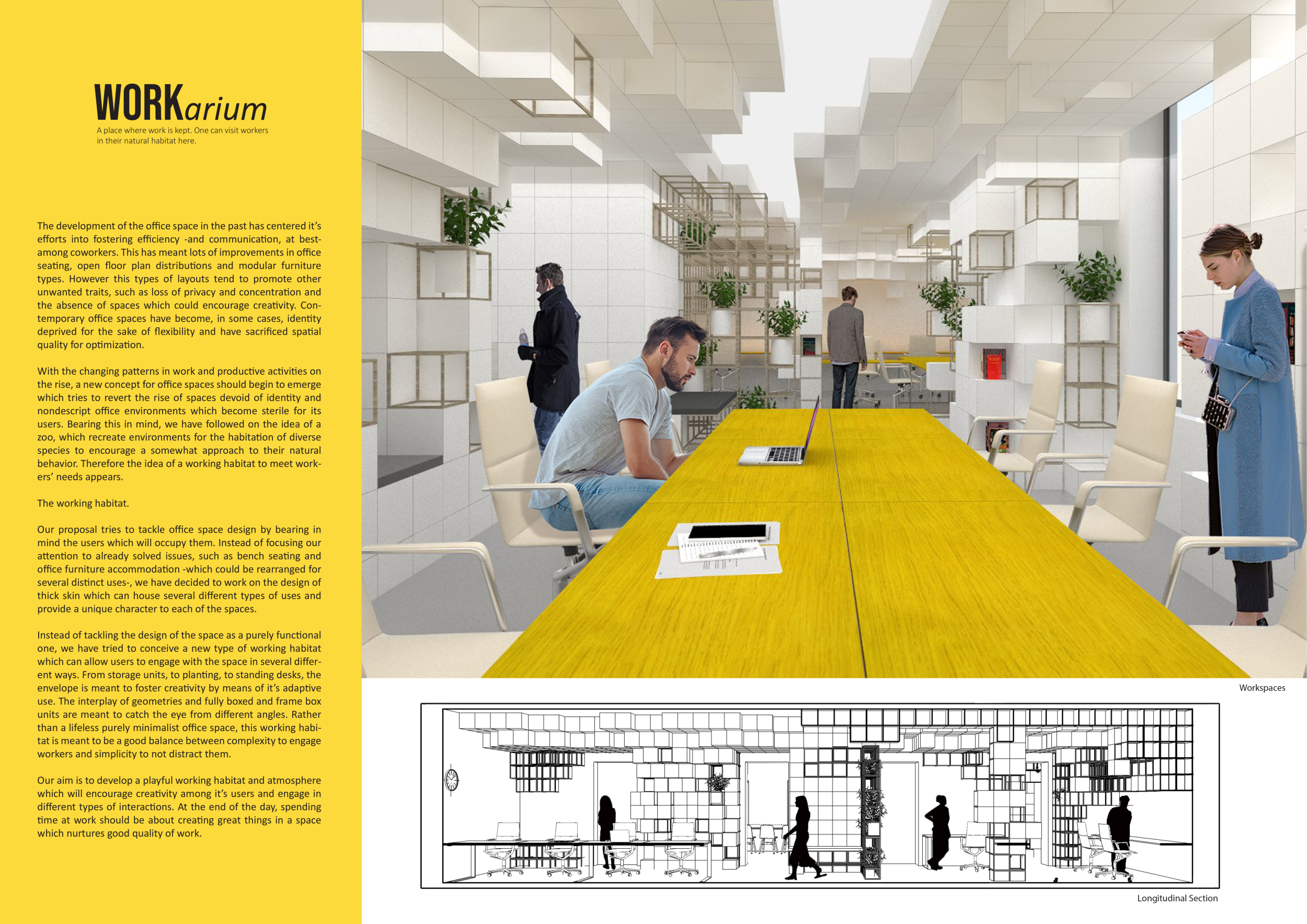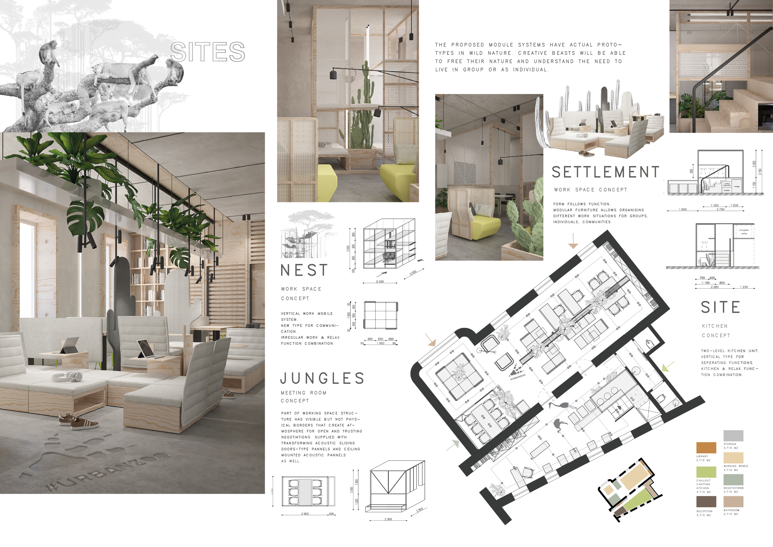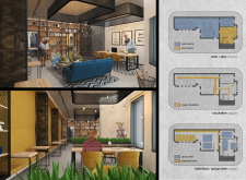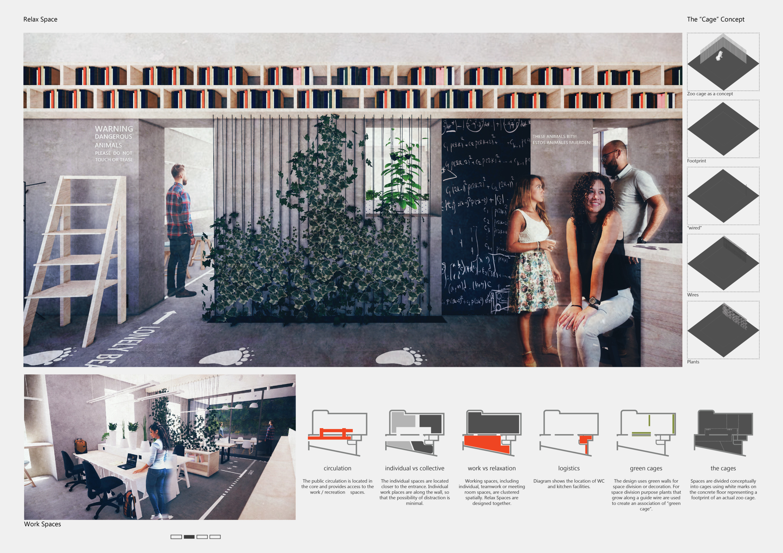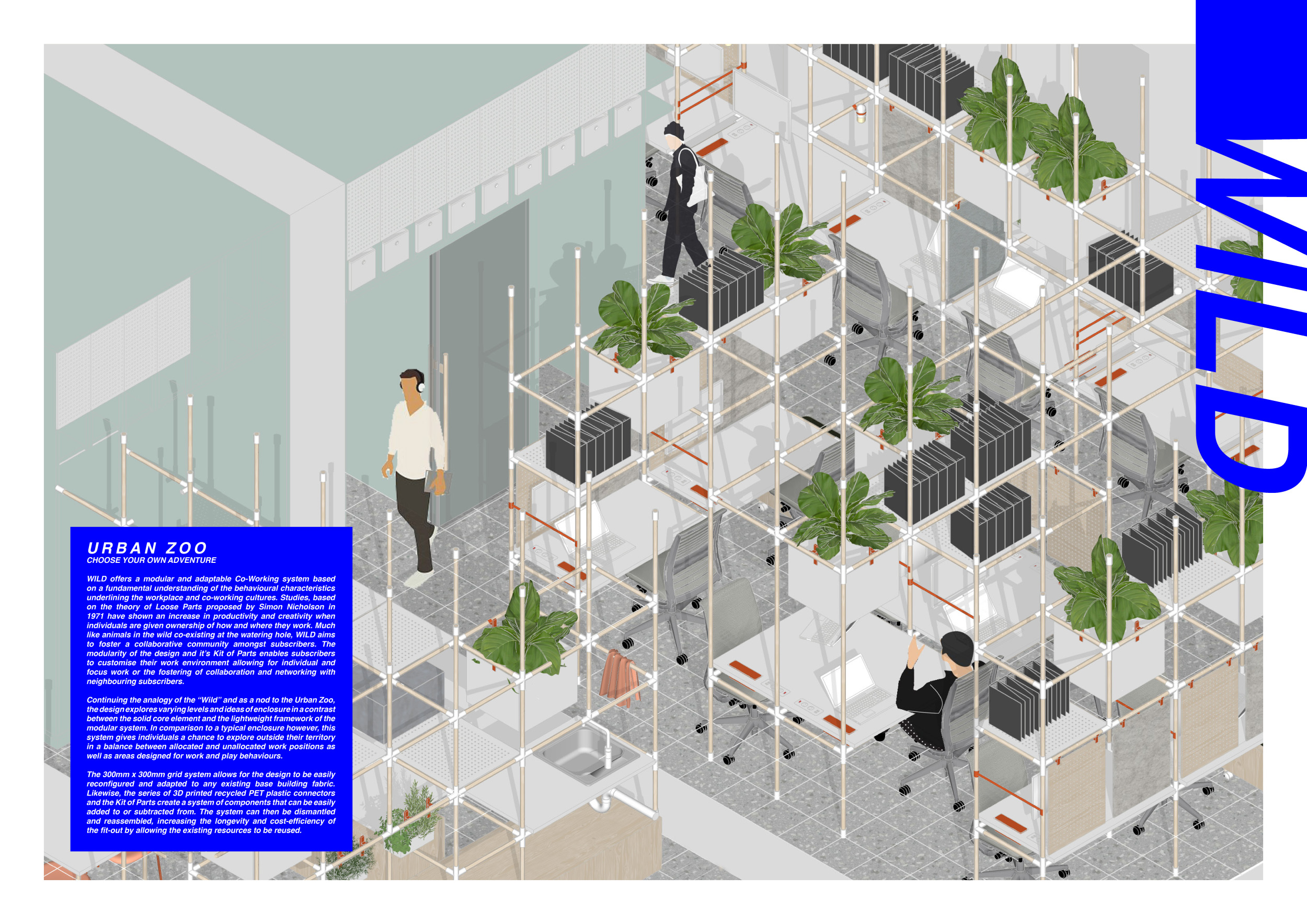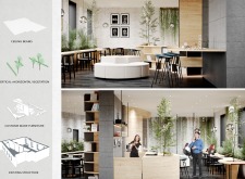 WILD took modular design to the next level, with its “Kit of Parts” enabling users to customise their work space towards either individual, isolated work, or fostering collaboration and networking within the space. The project really played well with the theme of a zoo environment, exploring varying levels of exposure established through the lightweight framework of its modular system. Read more The jury selected this project as a runner-up because the highly-functional proposed grid system showed extreme originality and ingenuity, offering a variety of different types of working spaces, presentation platforms, and storage areas. And while the design has great potential in becoming a part of the Urban Zoo Coworking bran, the jury did have slight concerns about the practicalities of the structure installation, maintenance, and cost.