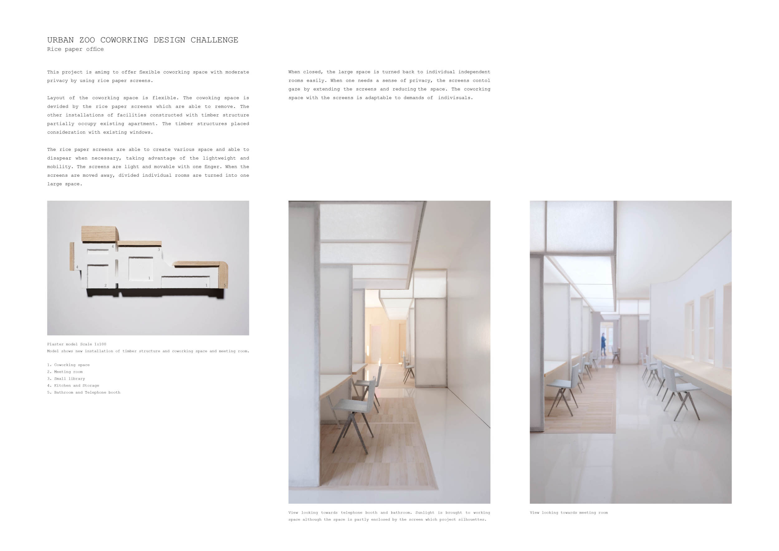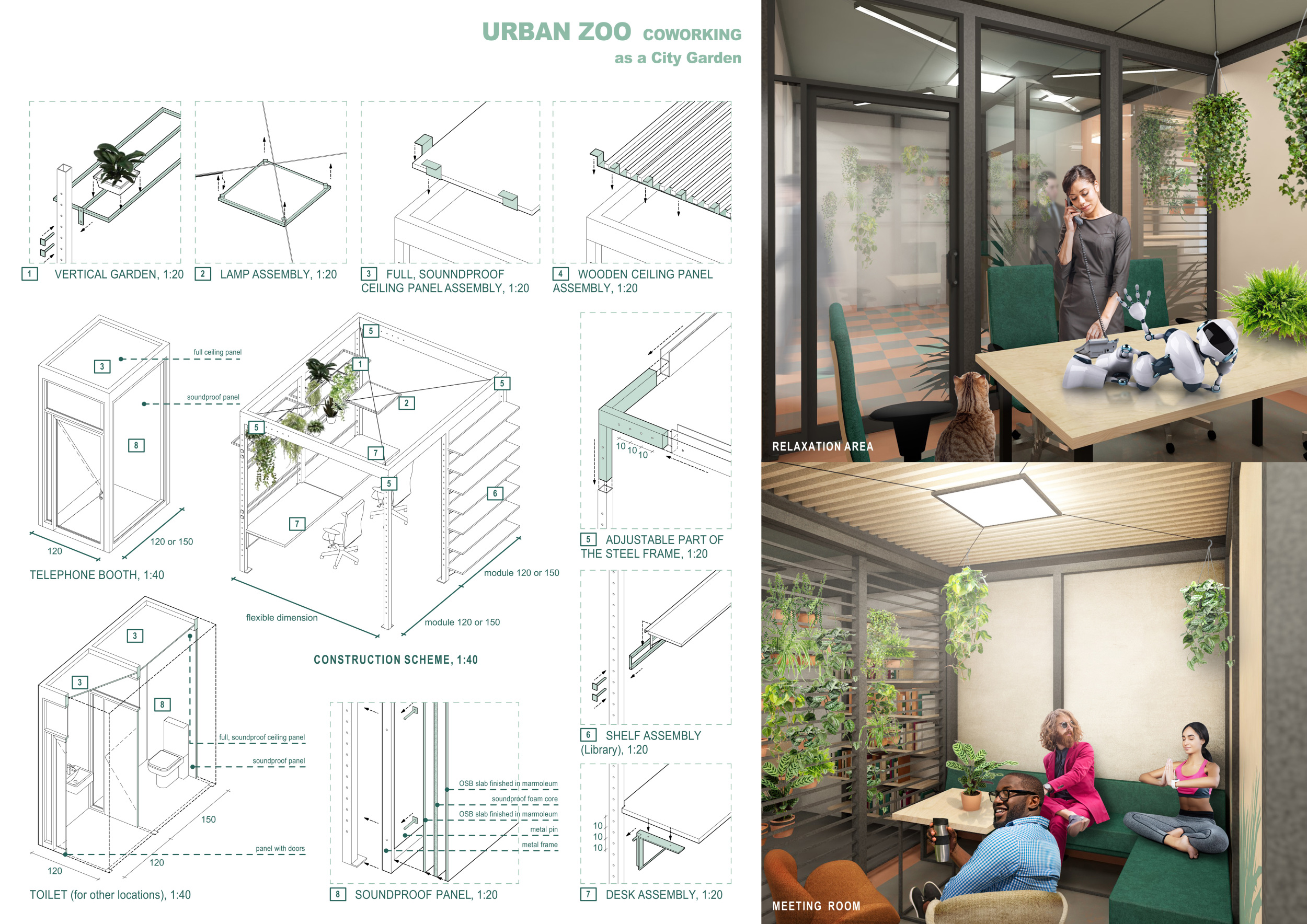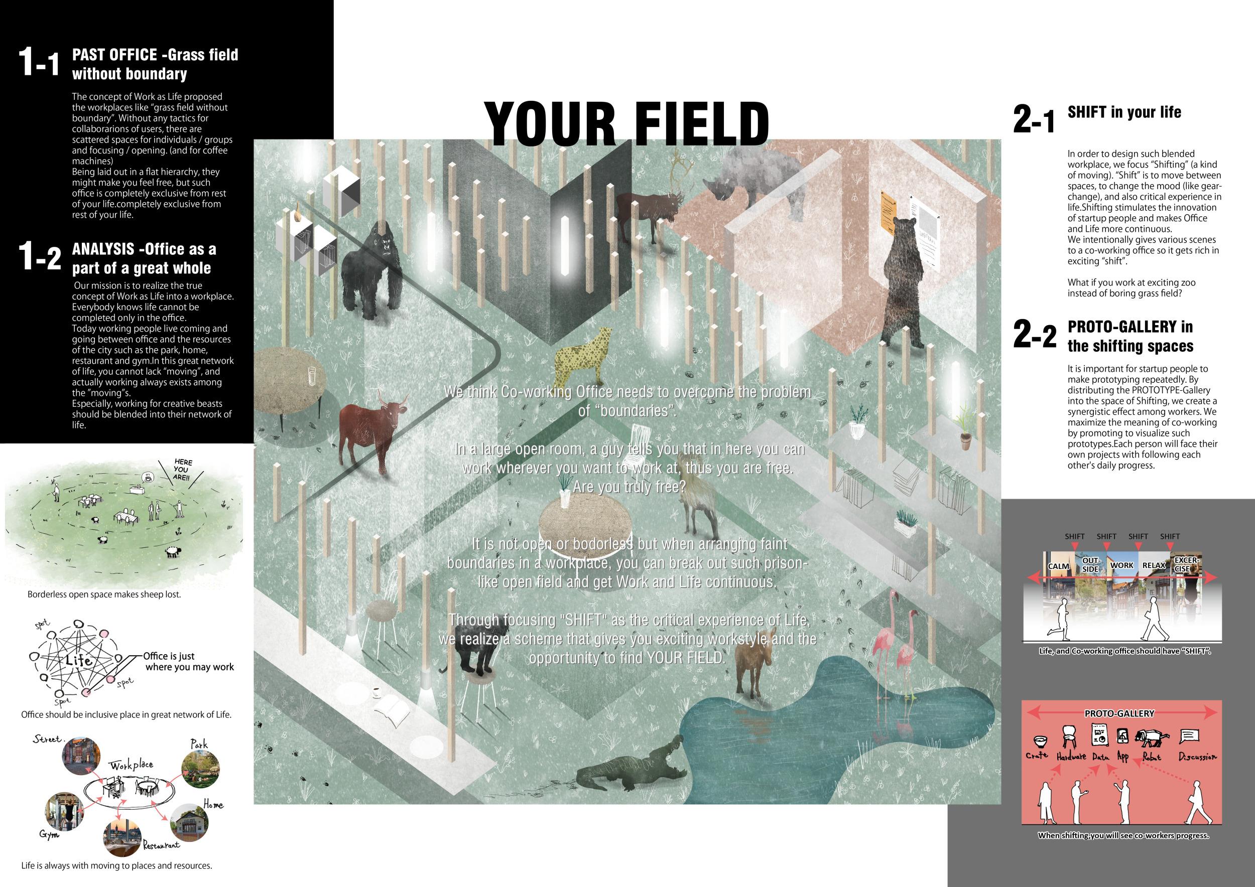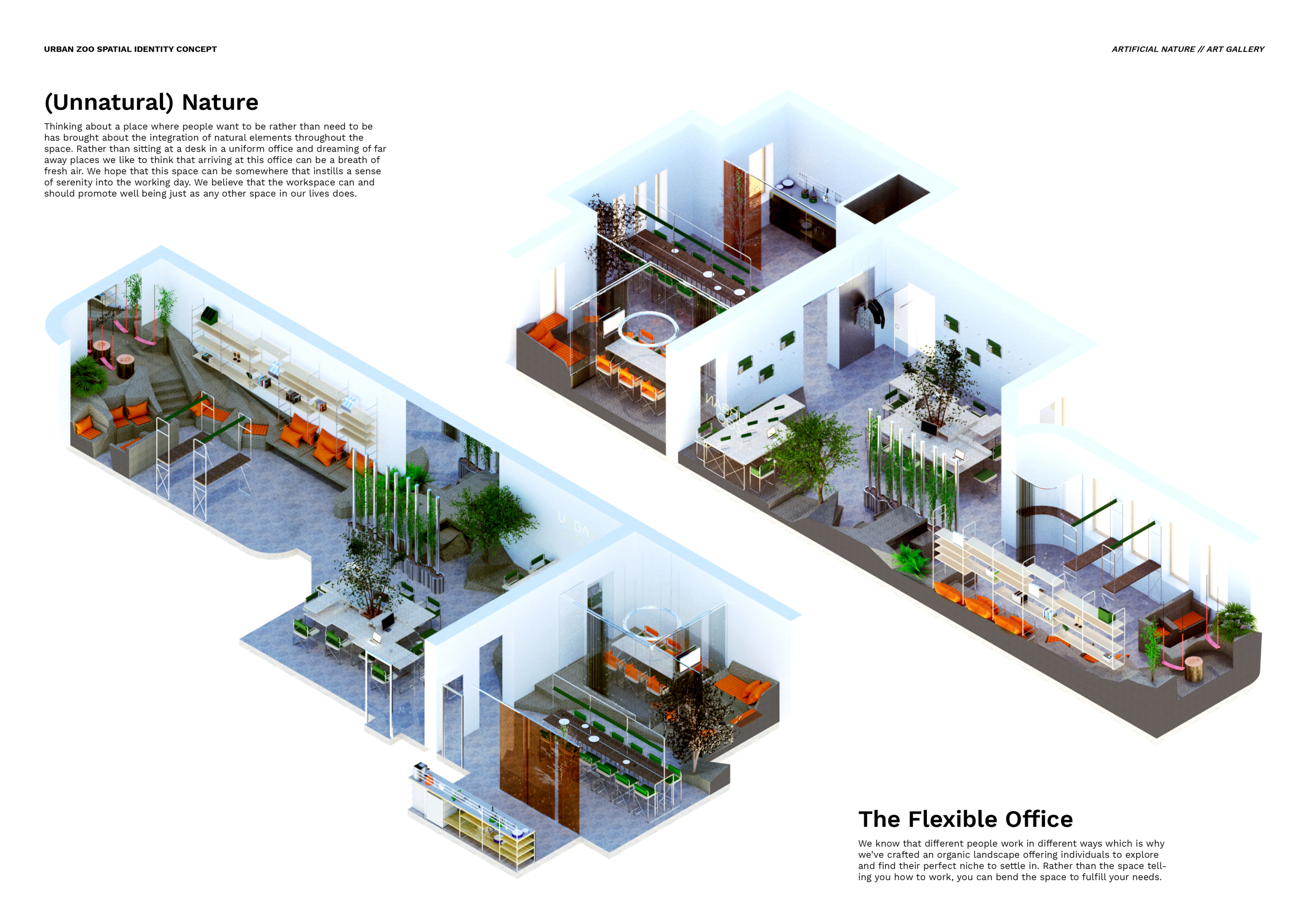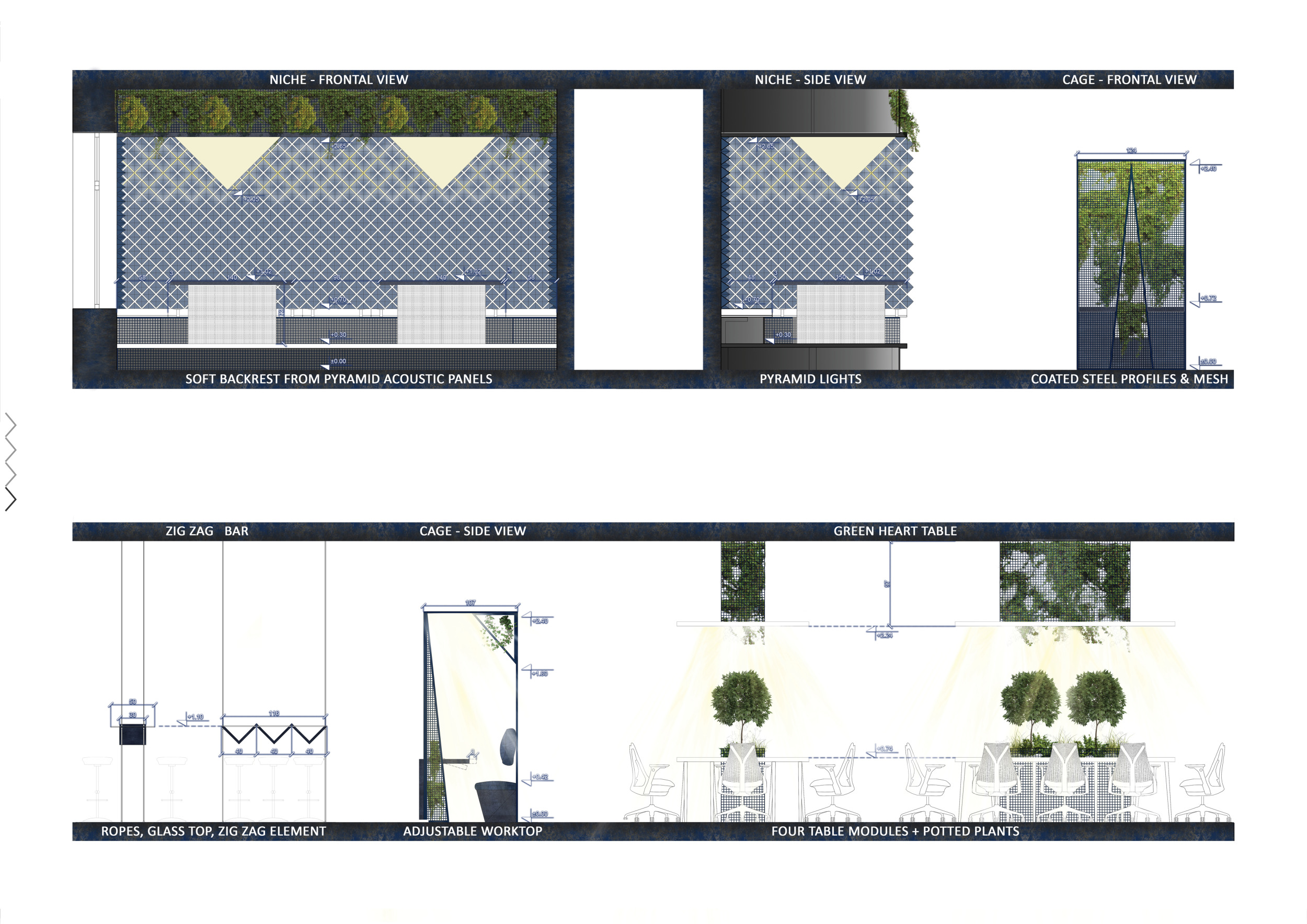WILD took modular design to the next level, with its “Kit of Parts” enabling users to customise their work space towards either individual, isolated work, or fostering collaboration and networking within the space. The project really played well with the theme of a zoo environment, exploring varying levels of exposure established through the lightweight framework of its modular system. Read more The jury selected this project as a runner-up because the highly-functional proposed grid system showed extreme originality and ingenuity, offering a variety of different types of working spaces, presentation platforms, and storage areas. And while the design has great potential in becoming a part of the Urban Zoo Coworking bran, the jury did have slight concerns about the practicalities of the structure installation, maintenance, and cost.