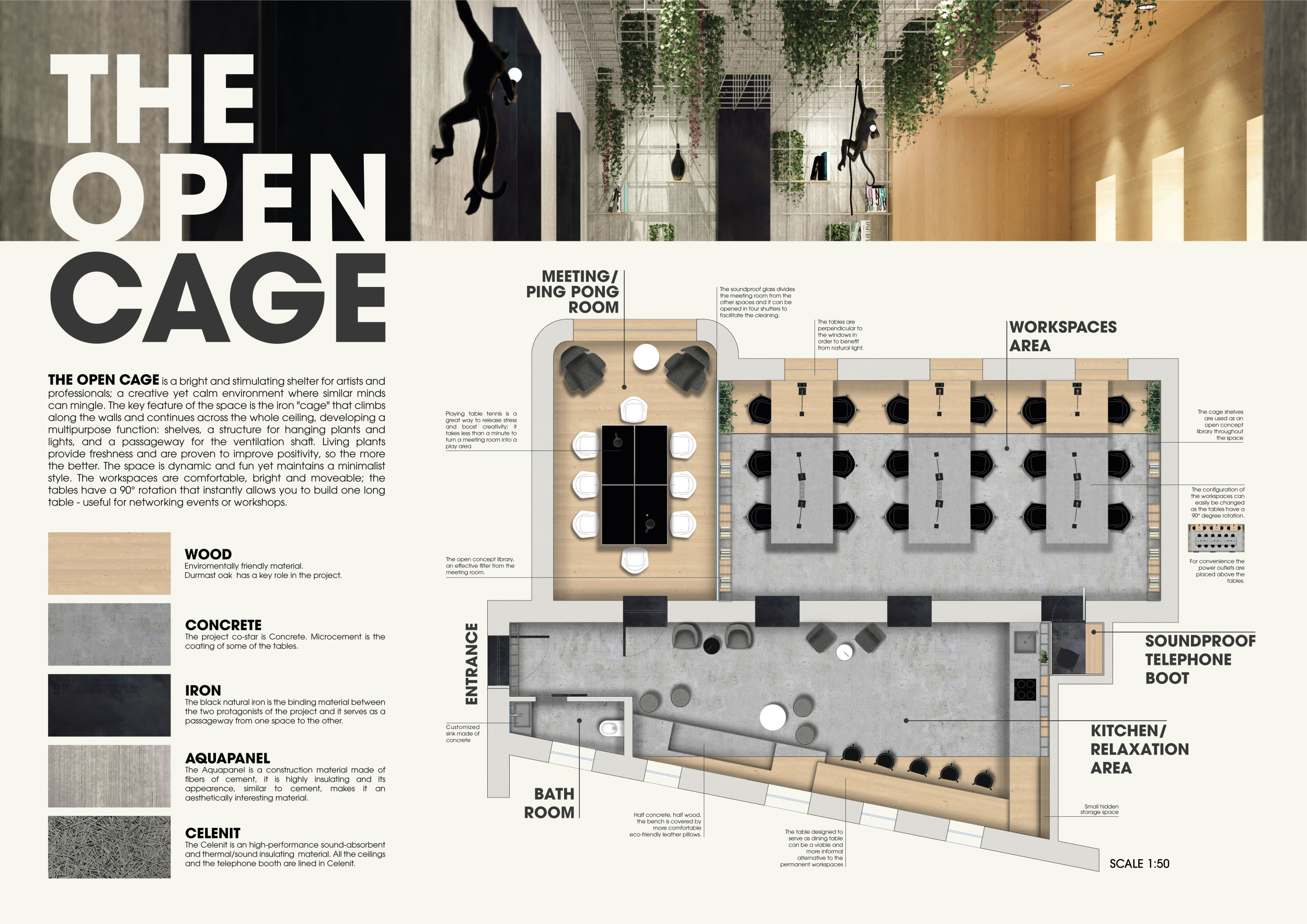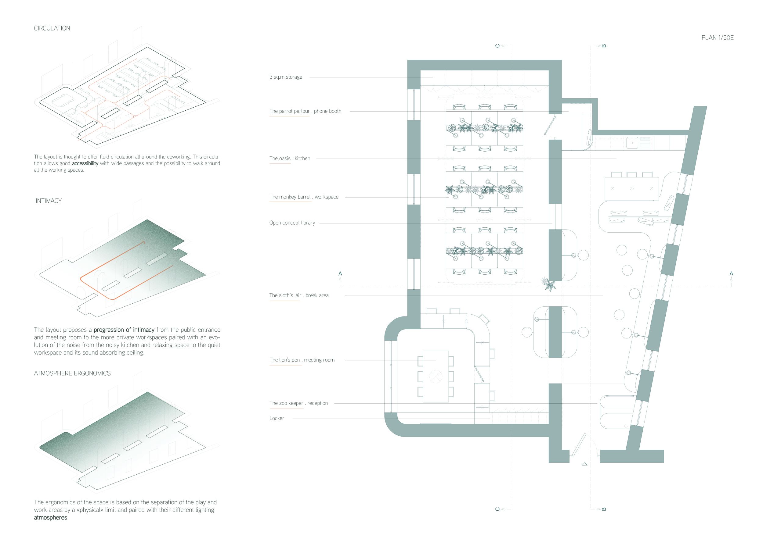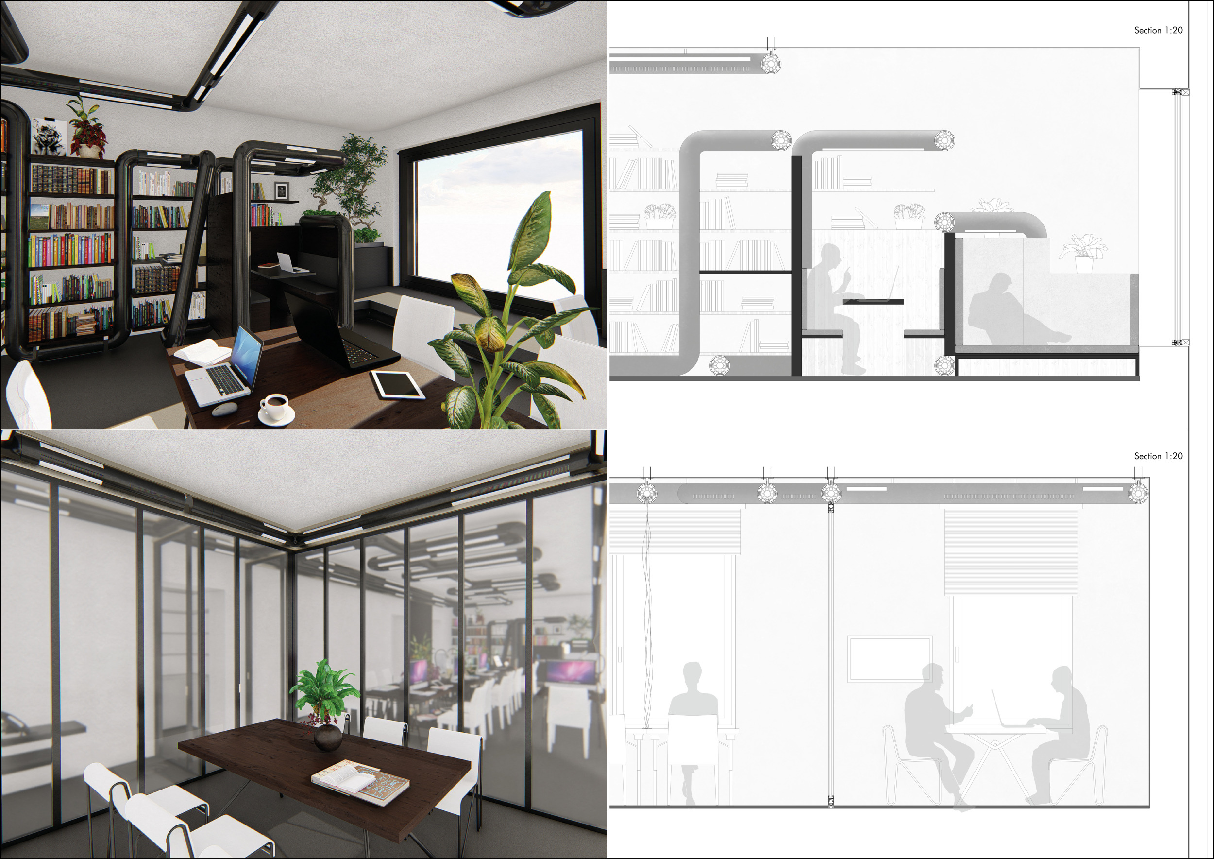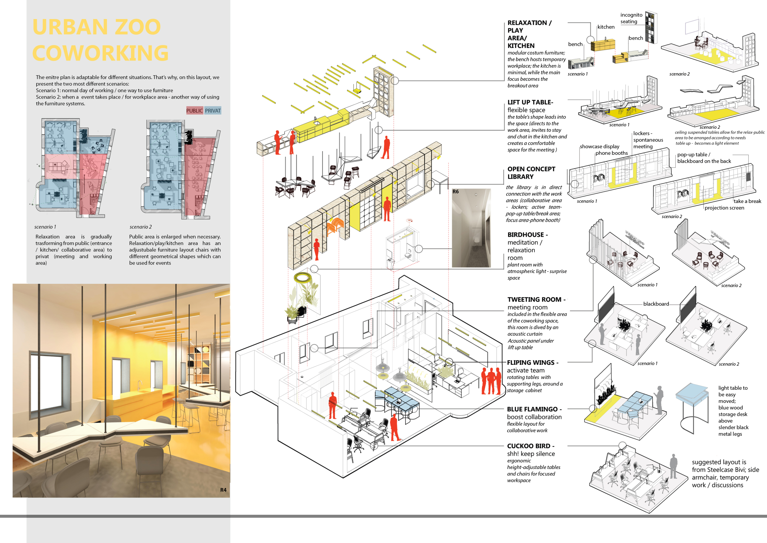 WILD took modular design to the next level, with its “Kit of Parts” enabling users to customise their work space towards either individual, isolated work, or fostering collaboration and networking within the space. The project really played well with the theme of a zoo environment, exploring varying levels of exposure established through the lightweight framework of its modular system. Read more The jury selected this project as a runner-up because the highly-functional proposed grid system showed extreme originality and ingenuity, offering a variety of different types of working spaces, presentation platforms, and storage areas. And while the design has great potential in becoming a part of the Urban Zoo Coworking bran, the jury did have slight concerns about the practicalities of the structure installation, maintenance, and cost.