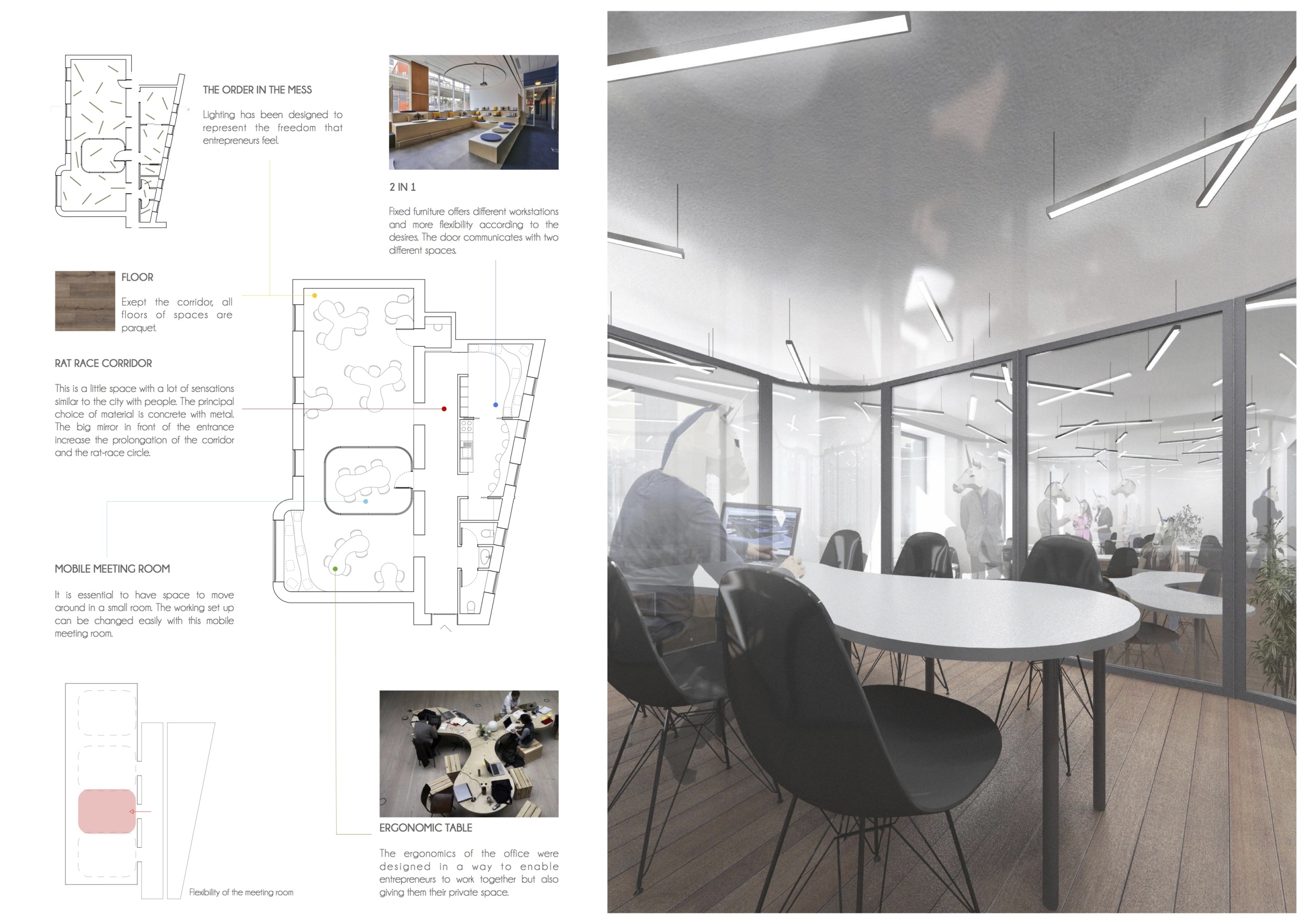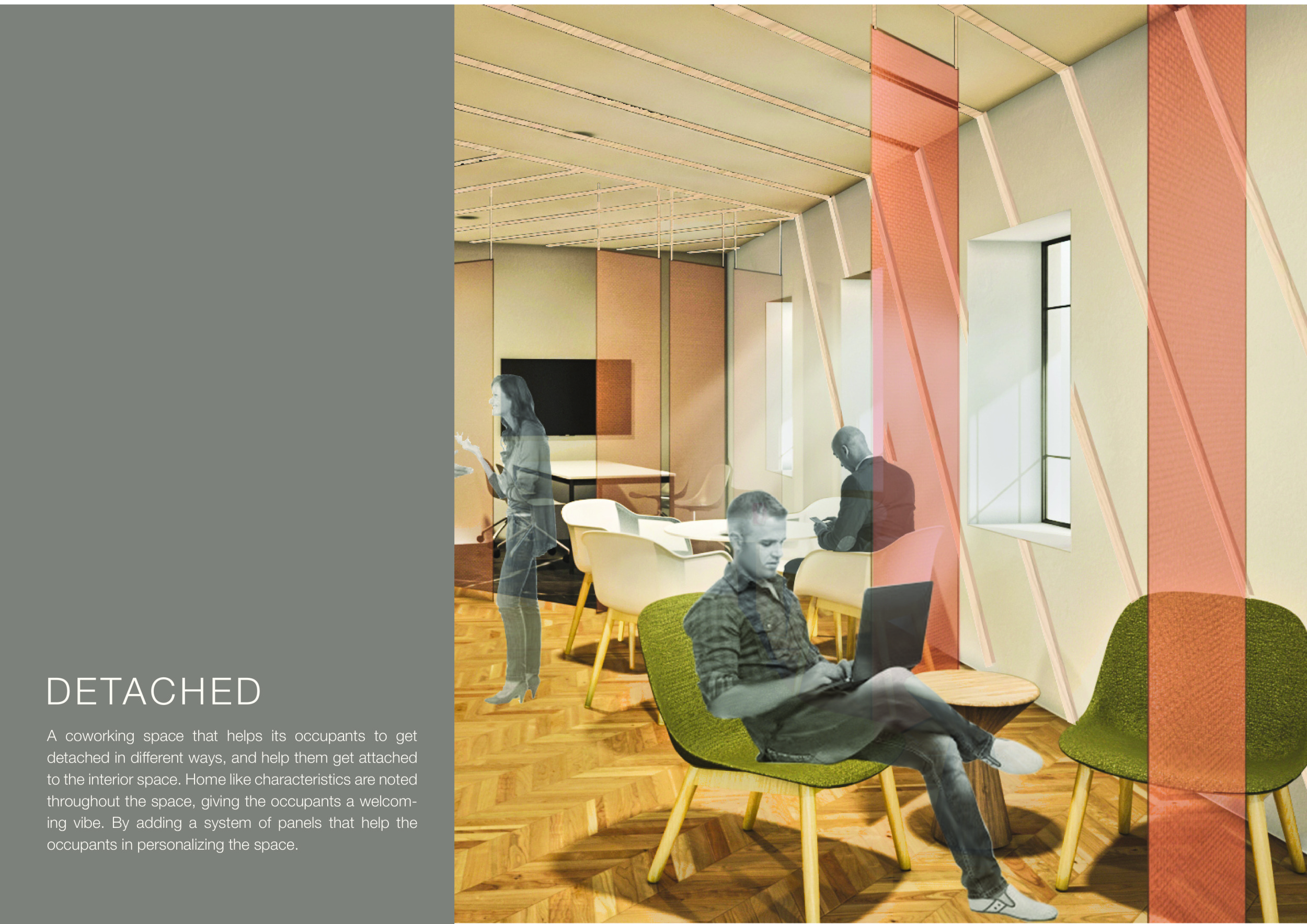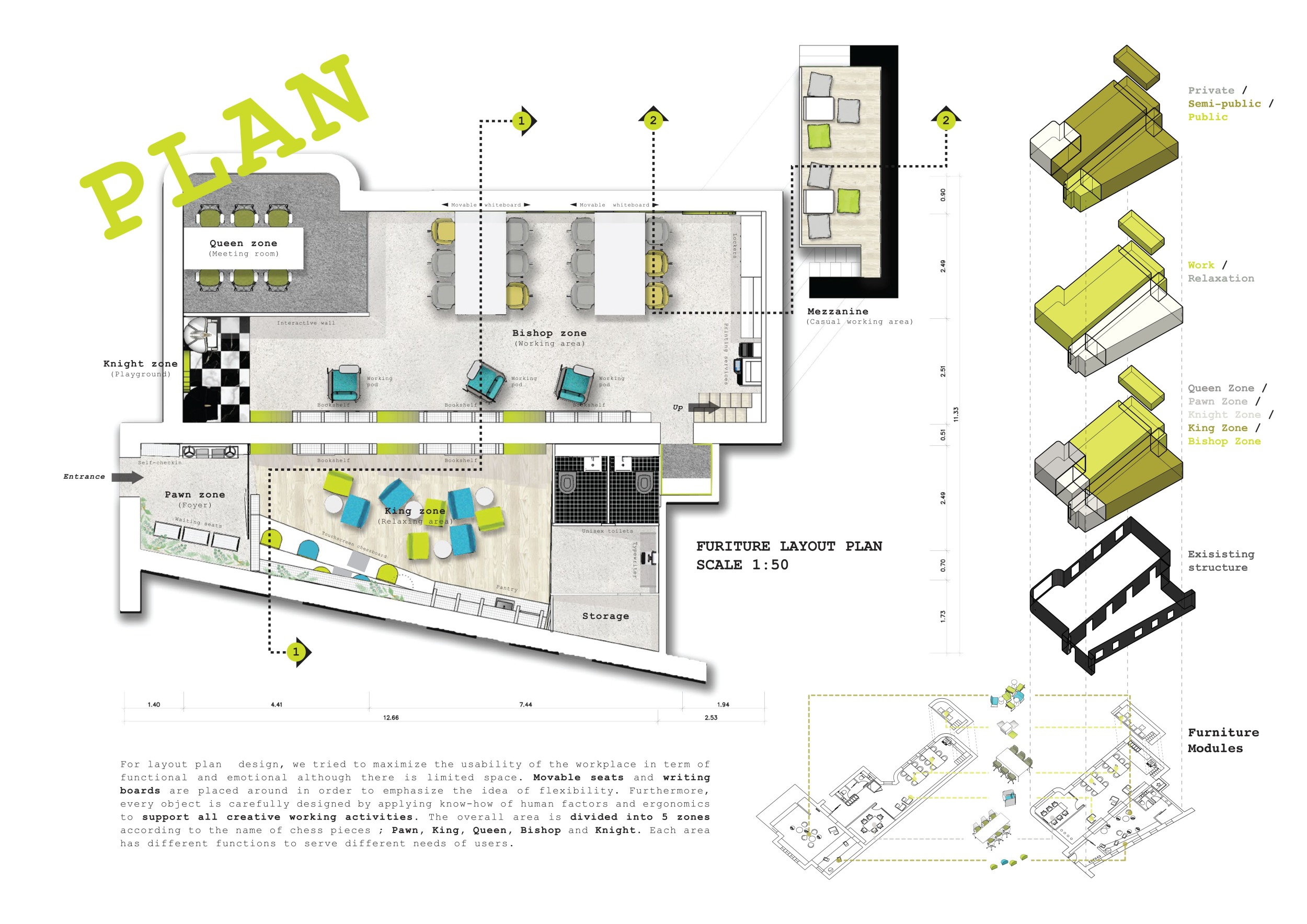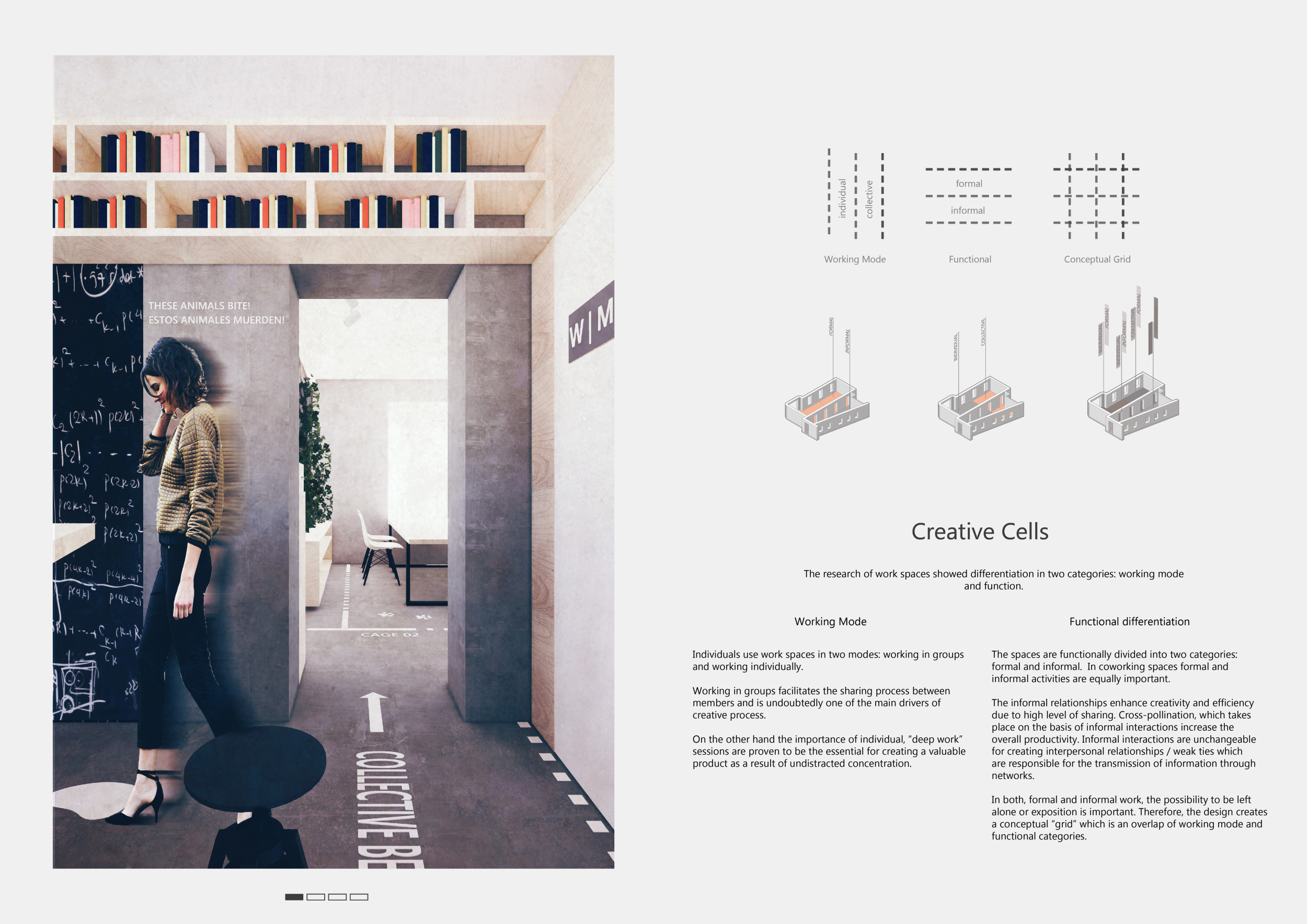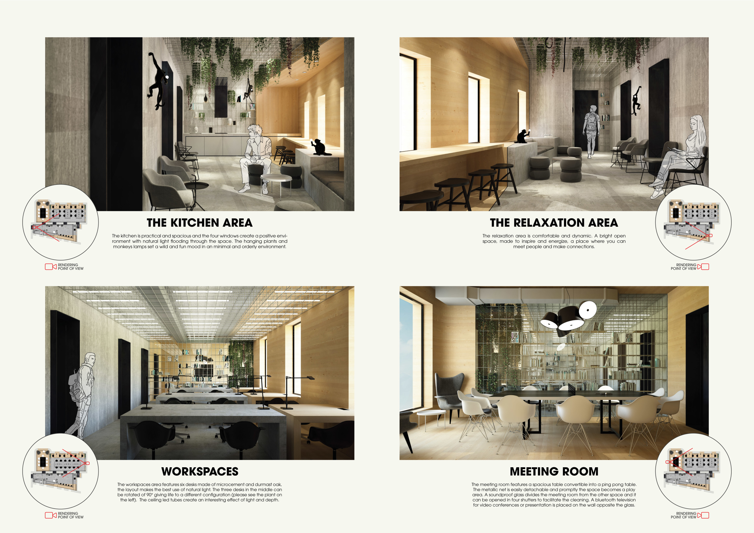 WILD took modular design to the next level, with its “Kit of Parts” enabling users to customise their work space towards either individual, isolated work, or fostering collaboration and networking within the space. The project really played well with the theme of a zoo environment, exploring varying levels of exposure established through the lightweight framework of its modular system. Read more The jury selected this project as a runner-up because the highly-functional proposed grid system showed extreme originality and ingenuity, offering a variety of different types of working spaces, presentation platforms, and storage areas. And while the design has great potential in becoming a part of the Urban Zoo Coworking bran, the jury did have slight concerns about the practicalities of the structure installation, maintenance, and cost.