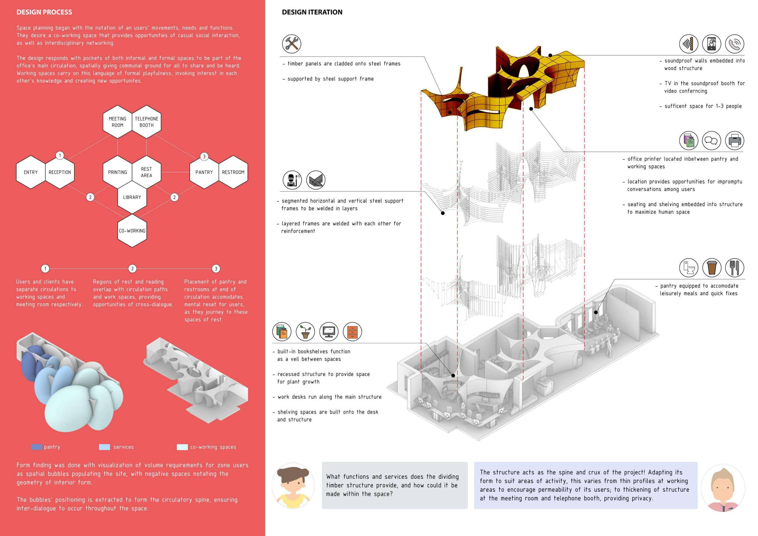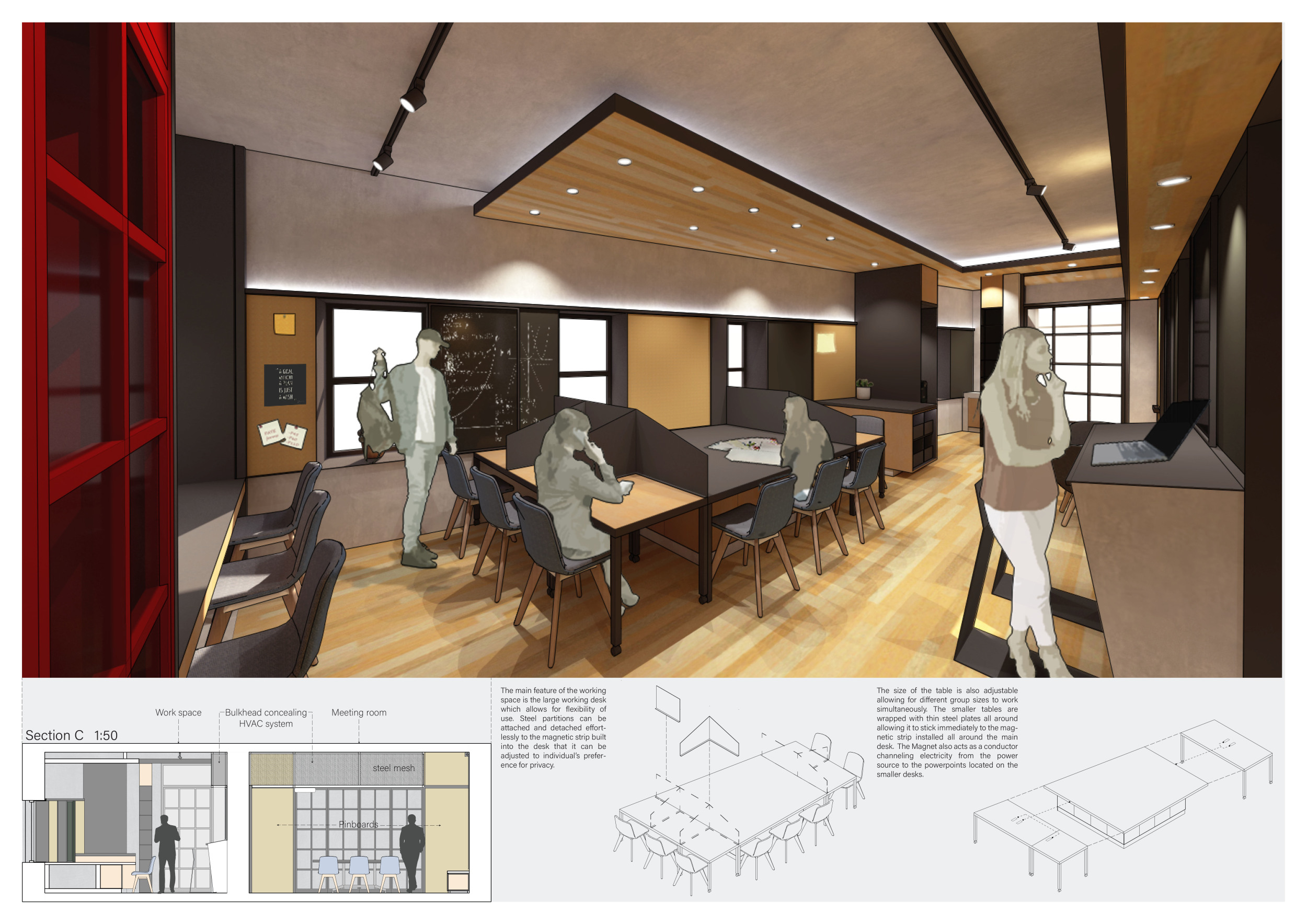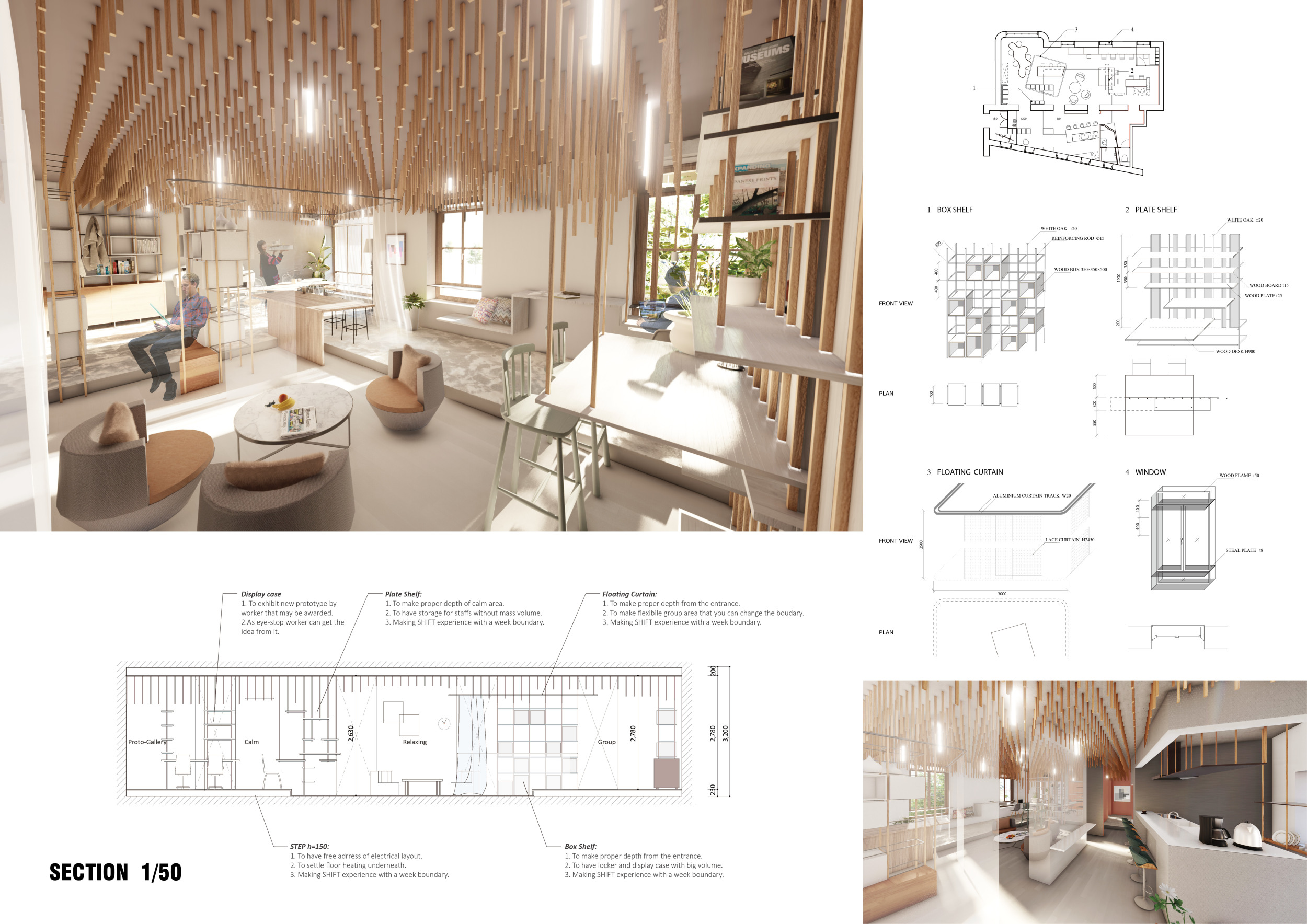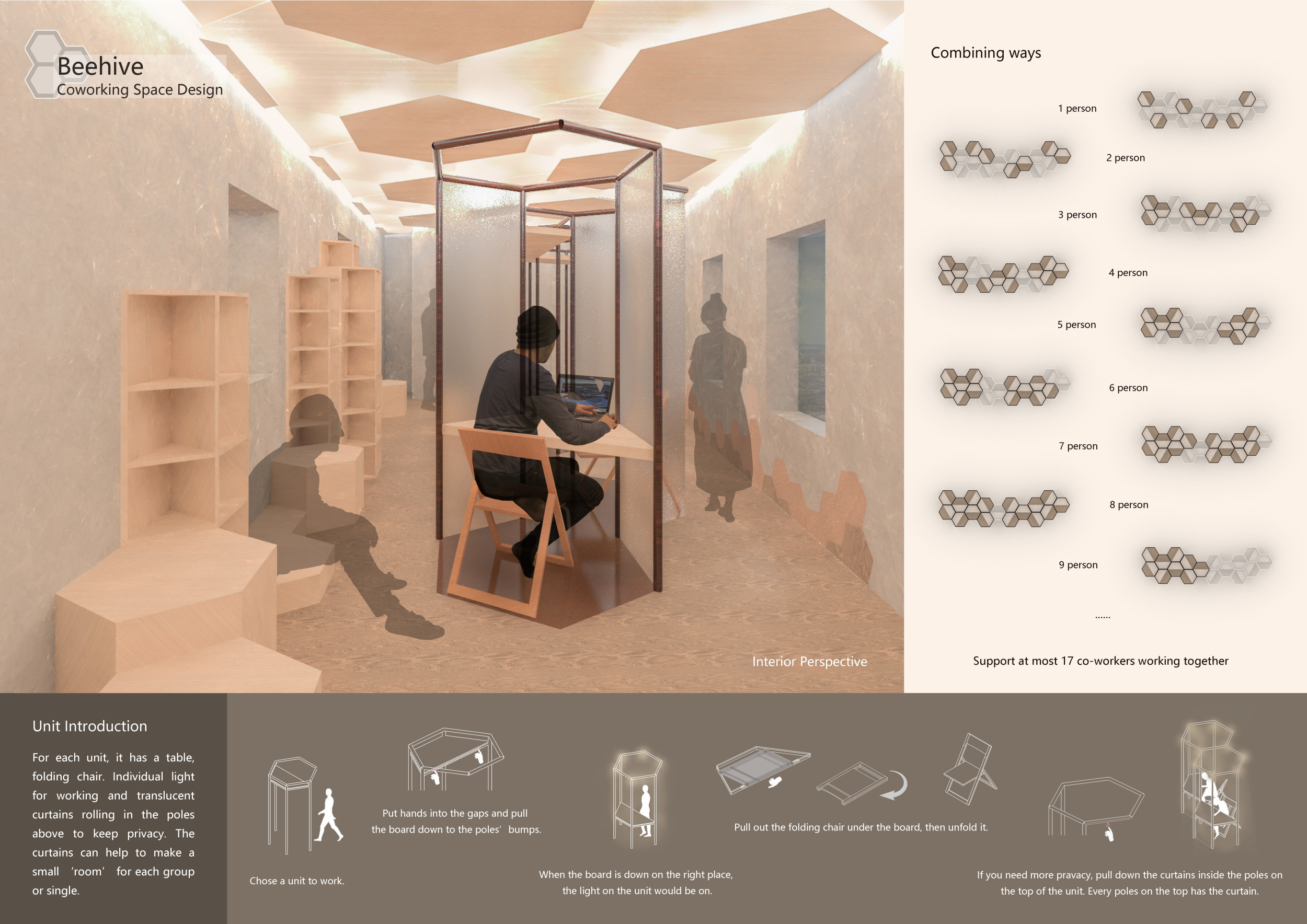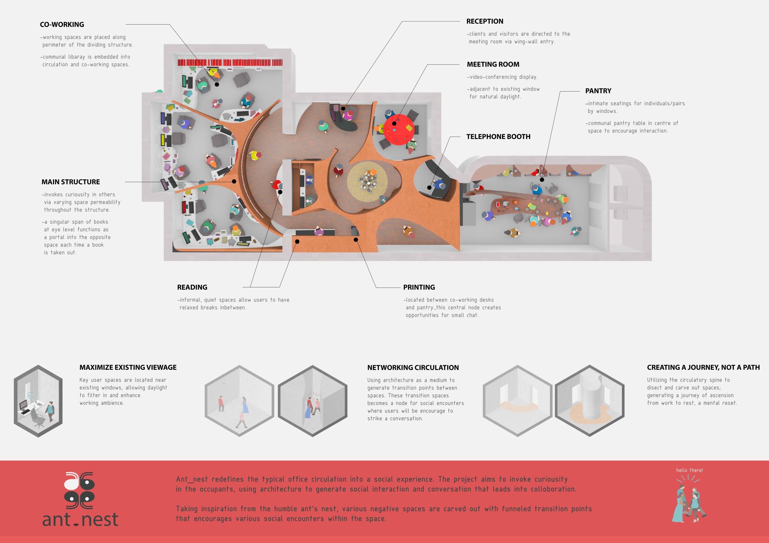 WILD took modular design to the next level, with its “Kit of Parts” enabling users to customise their work space towards either individual, isolated work, or fostering collaboration and networking within the space. The project really played well with the theme of a zoo environment, exploring varying levels of exposure established through the lightweight framework of its modular system. Read more The jury selected this project as a runner-up because the highly-functional proposed grid system showed extreme originality and ingenuity, offering a variety of different types of working spaces, presentation platforms, and storage areas. And while the design has great potential in becoming a part of the Urban Zoo Coworking bran, the jury did have slight concerns about the practicalities of the structure installation, maintenance, and cost.