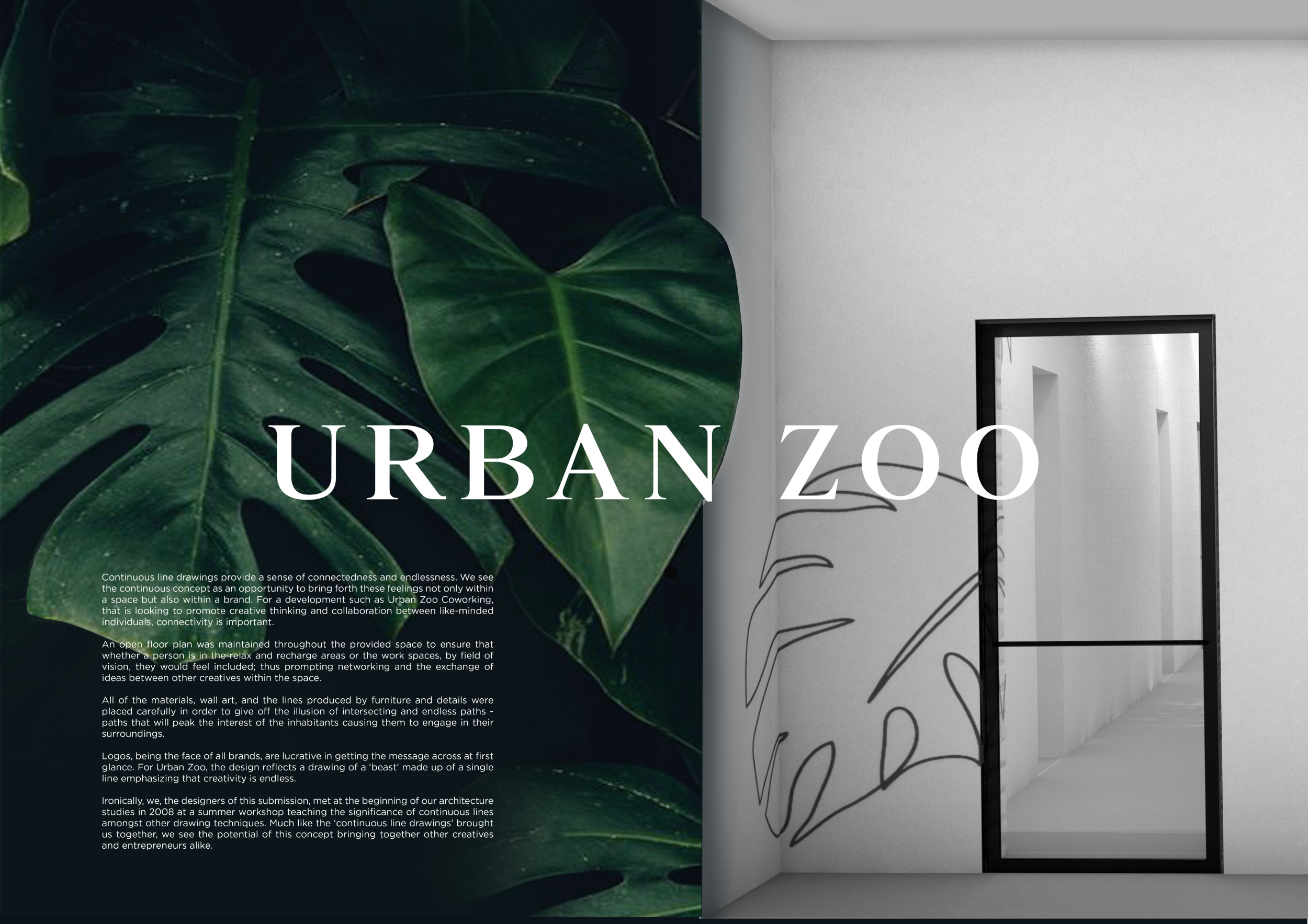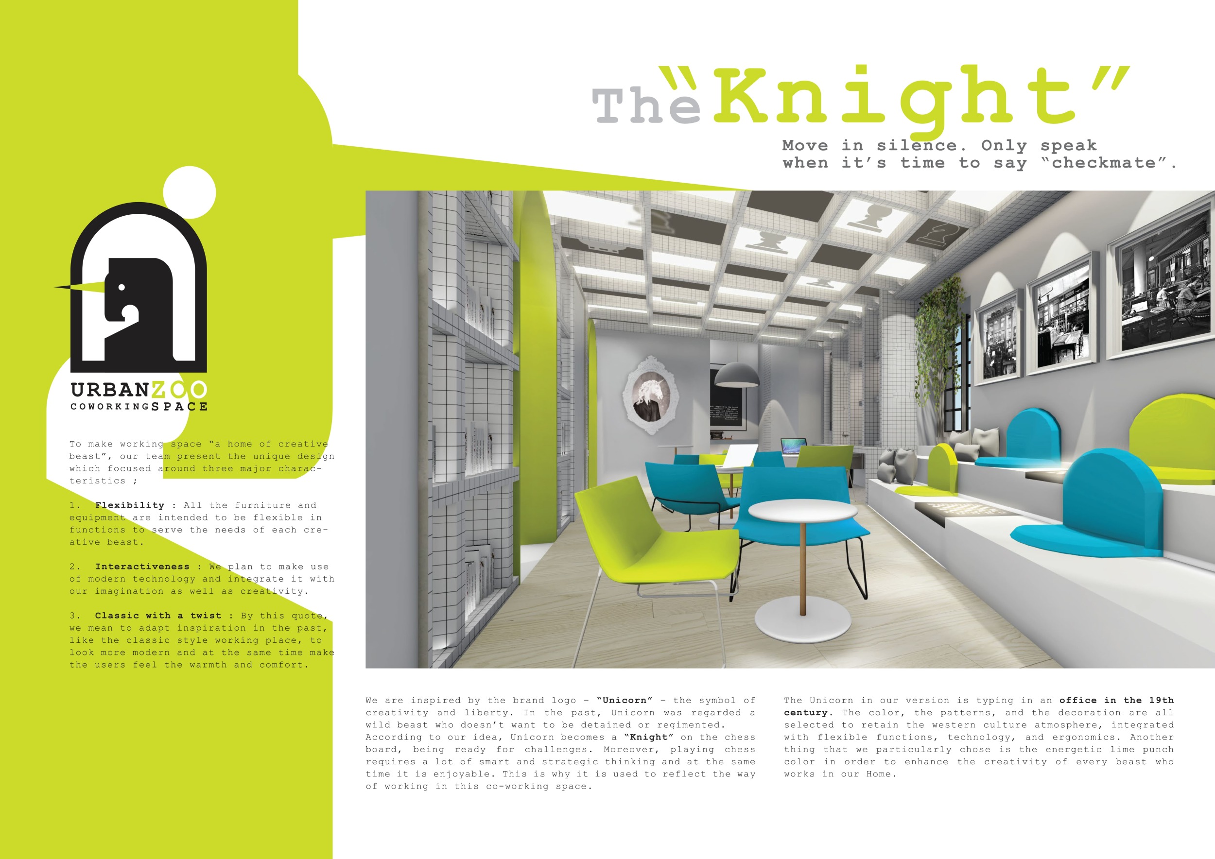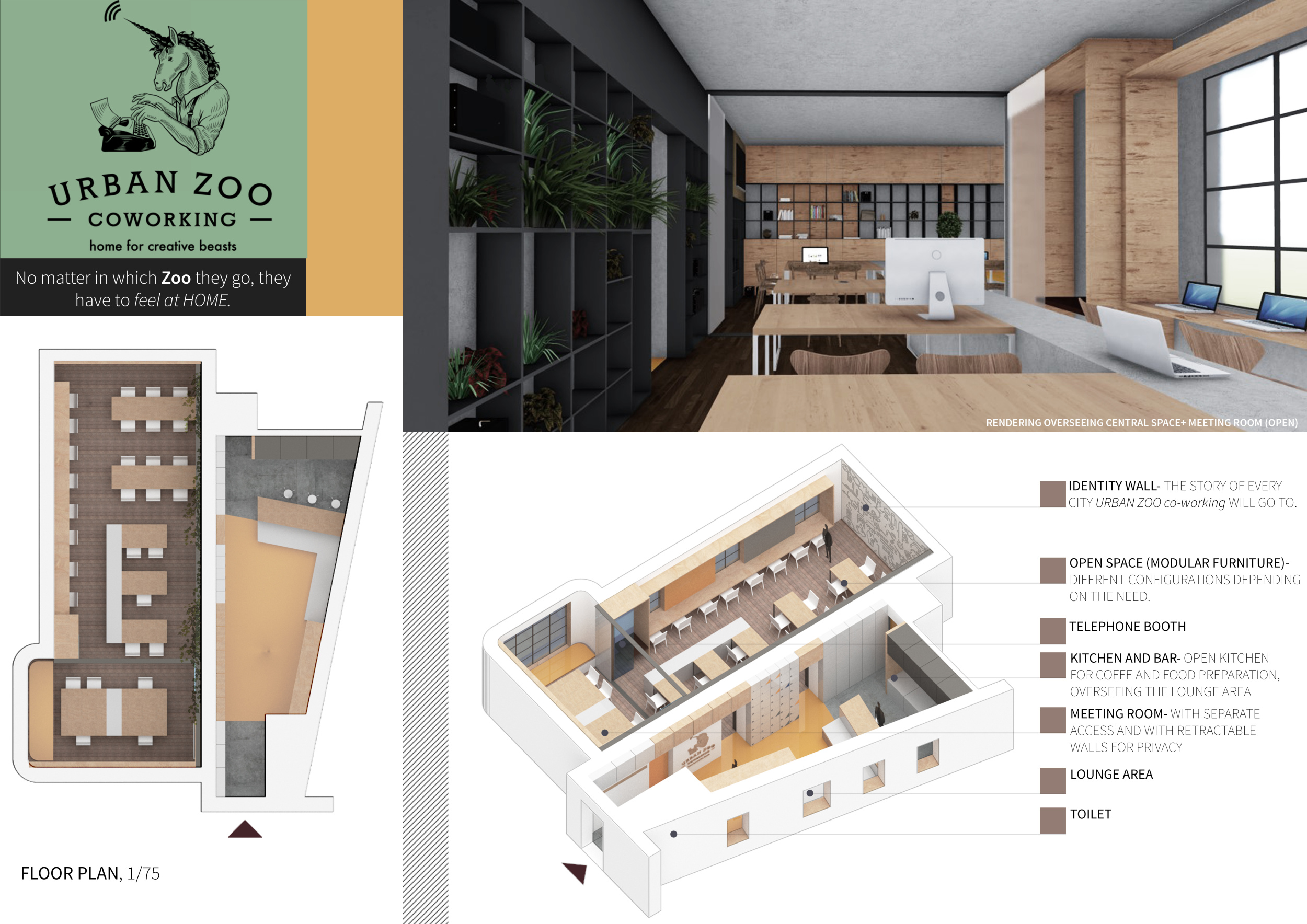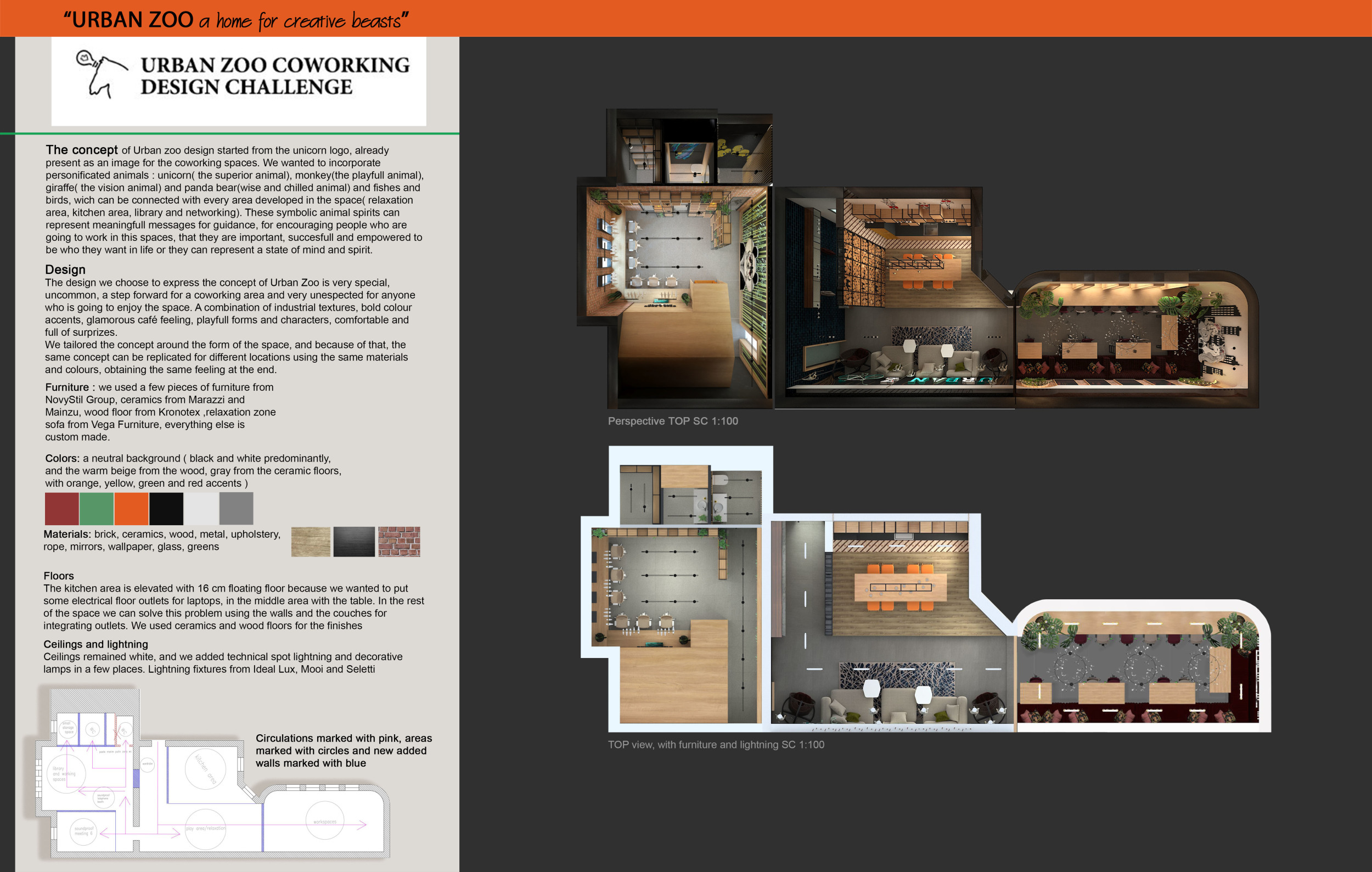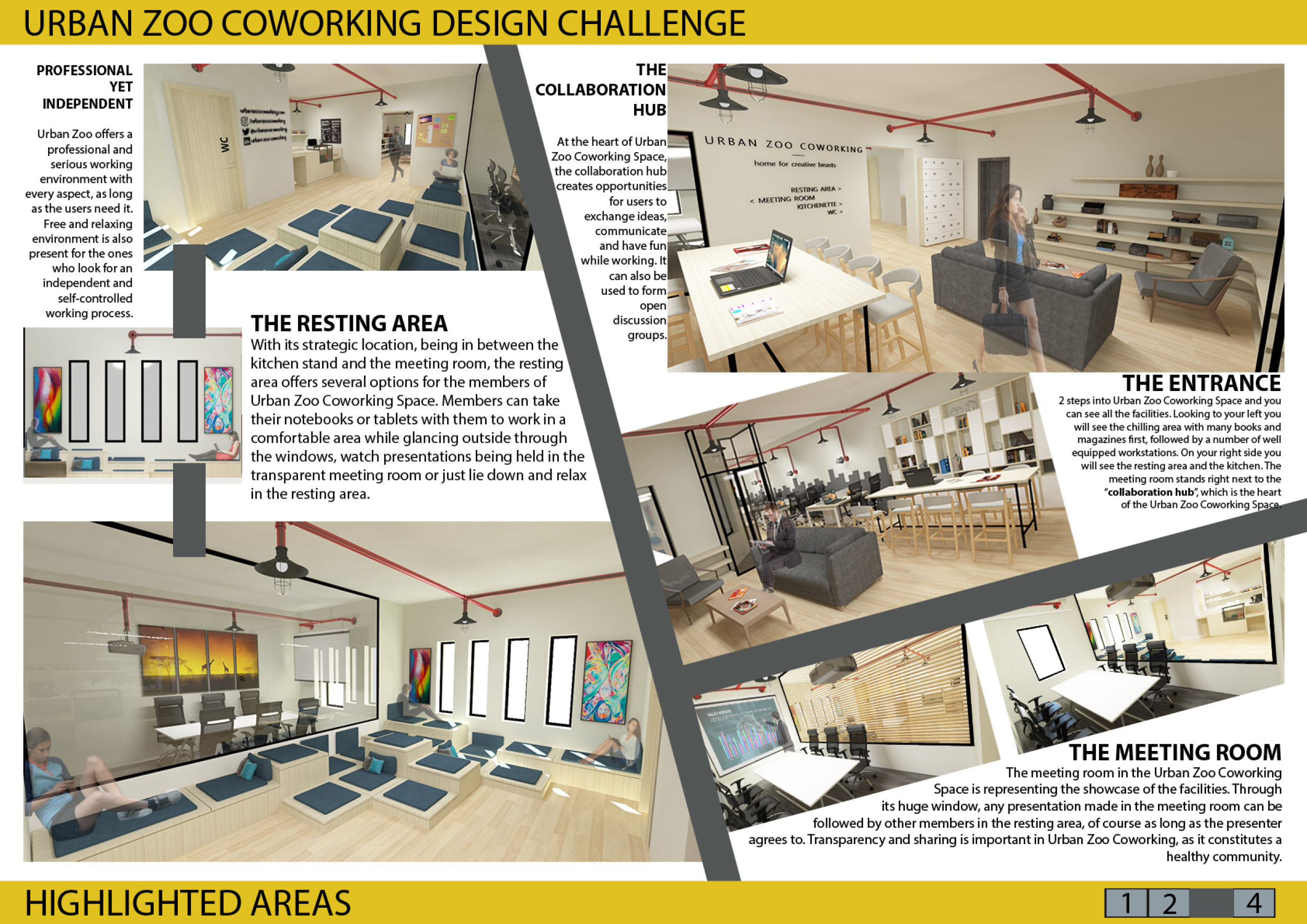 Urban Zoo Coworking was looking for a signature style for their co-working spaces, an interior design that could be applied to each new venue and customised to suit the creative needs of its users, from freelancers to startups and small businesses. Participants were challenged to create a unique space that would distinguish it from other traditional offices, invoking a sense of creativity and collaboration within the space.